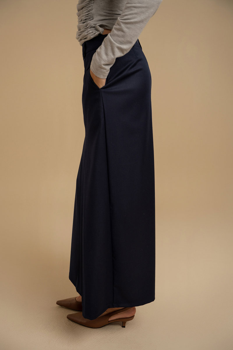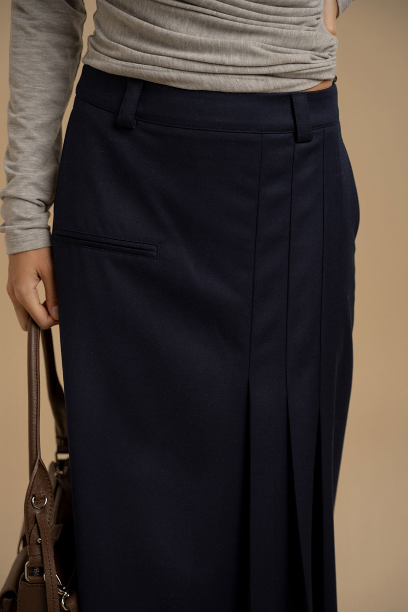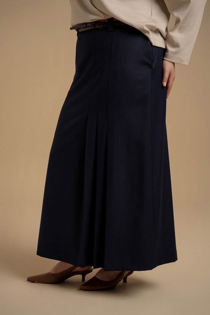 Юбка женская А-силуэта из костюмной ткани. Пояс - отрезной с застежкой на молнию. В боковых швах имеются карманы. На передней части изделия имитация прорезного кармана и складки. Юбка посажена на подкладку. Есть шлевки для ремня.