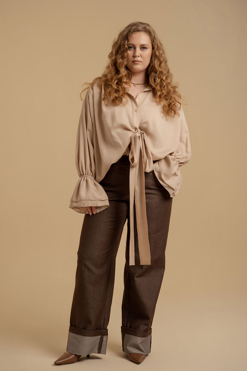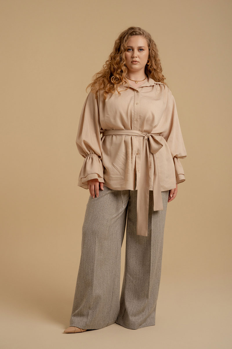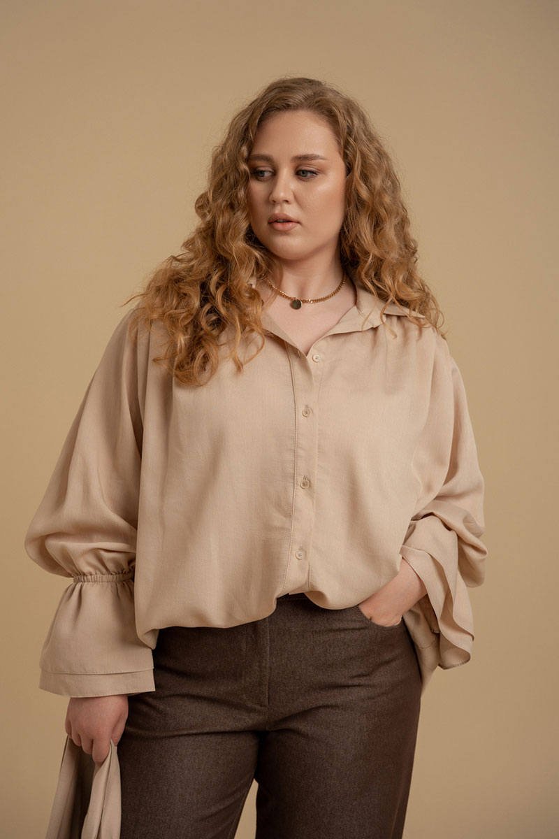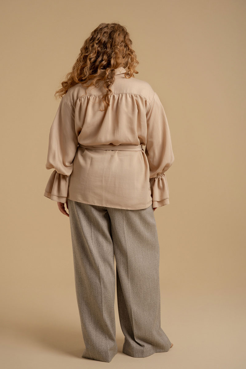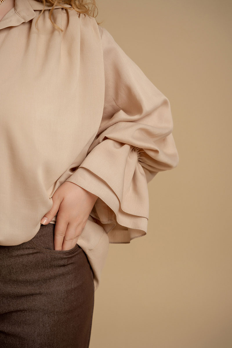 Блузка женская свободного силуэта из легкой плательной ткани с добавлением шерсти. Вырез горловины оформлен воротником рубашечного типа. Застежка - петли с пуговицами. В области кокеток на спинке и передних деталях выполнена сборка. Рукава - втачные со спущенной линией плеча. В области оката выполнена глубокая встречная складка, низ присборен на эластичную тесьму, изделие дополнено шарфом - завязкой из основной ткани.