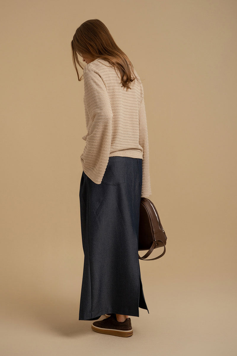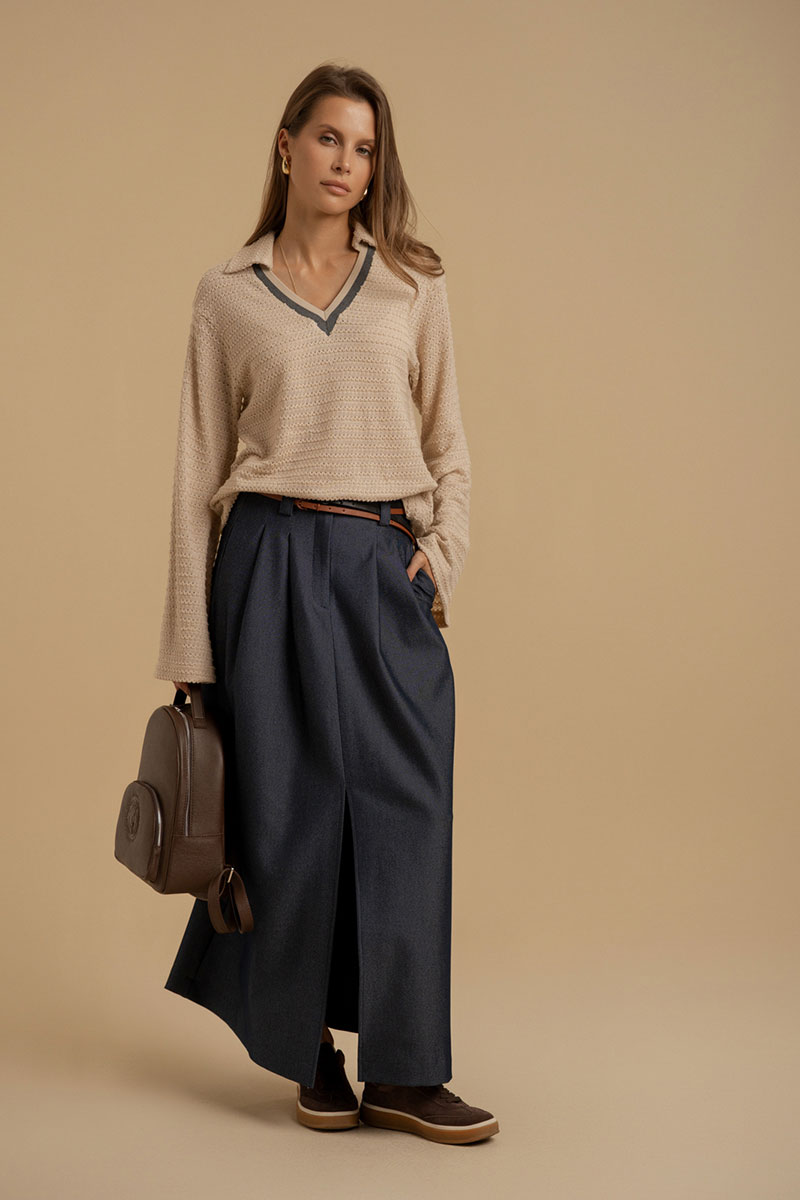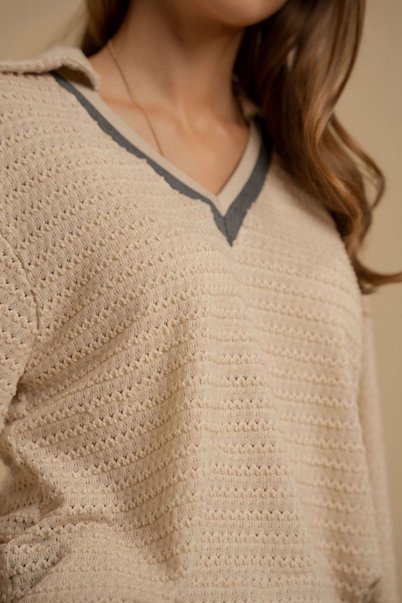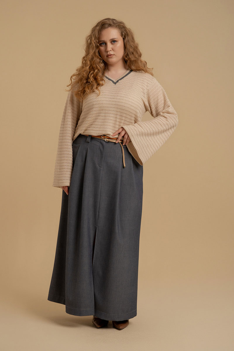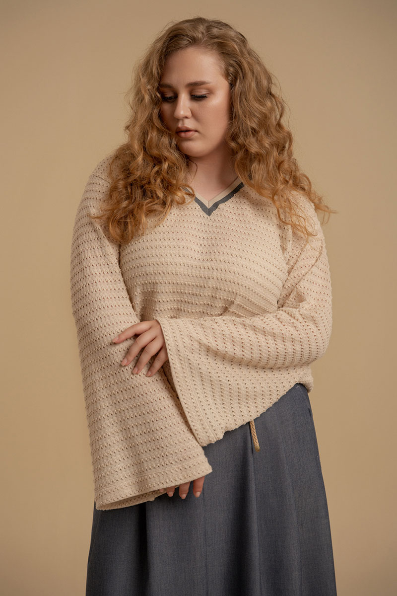 Джемпер женский свободного покроя из трикотажного ажурного полотна. Вырез горловины V-образной формы с планкой из довяза и отложным воротником. Рукава - втачные со спущенной линией плеча, слегка расширены к низу.