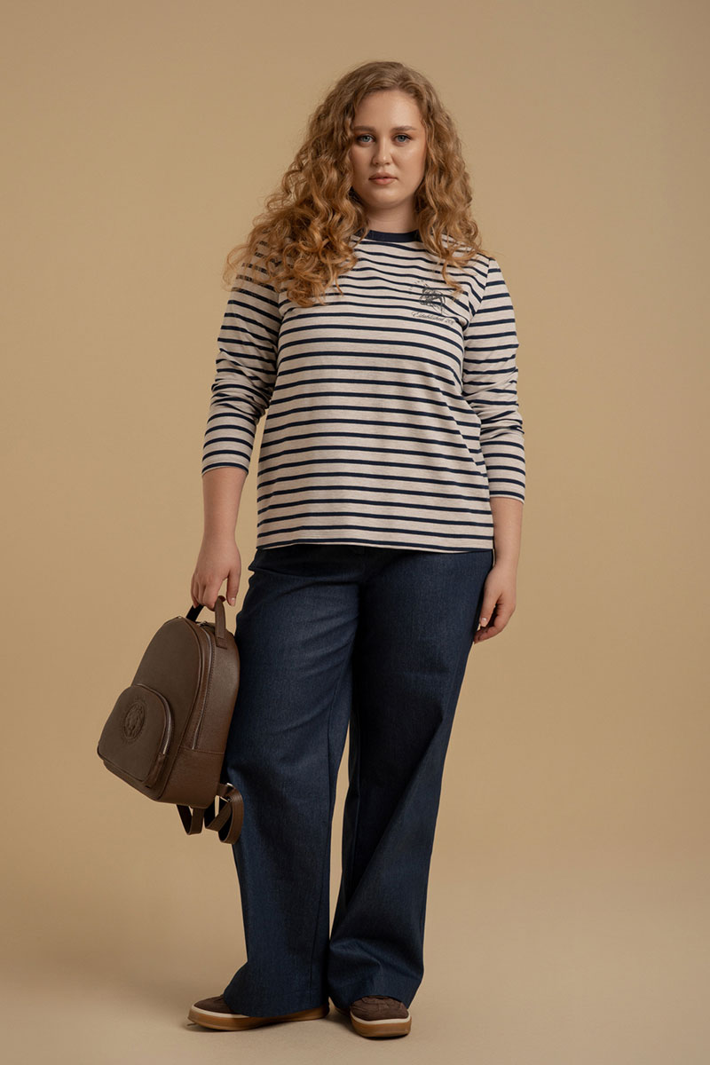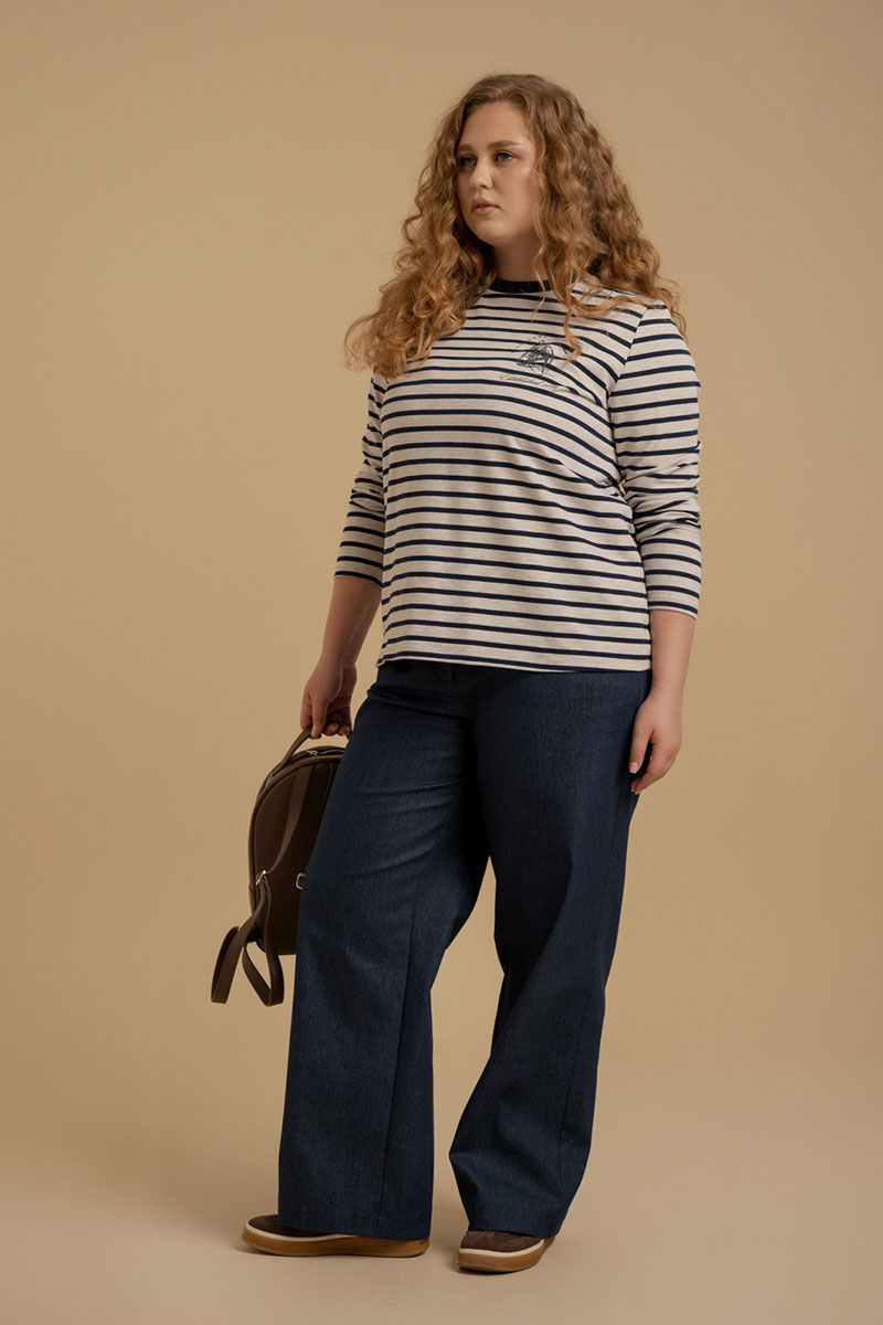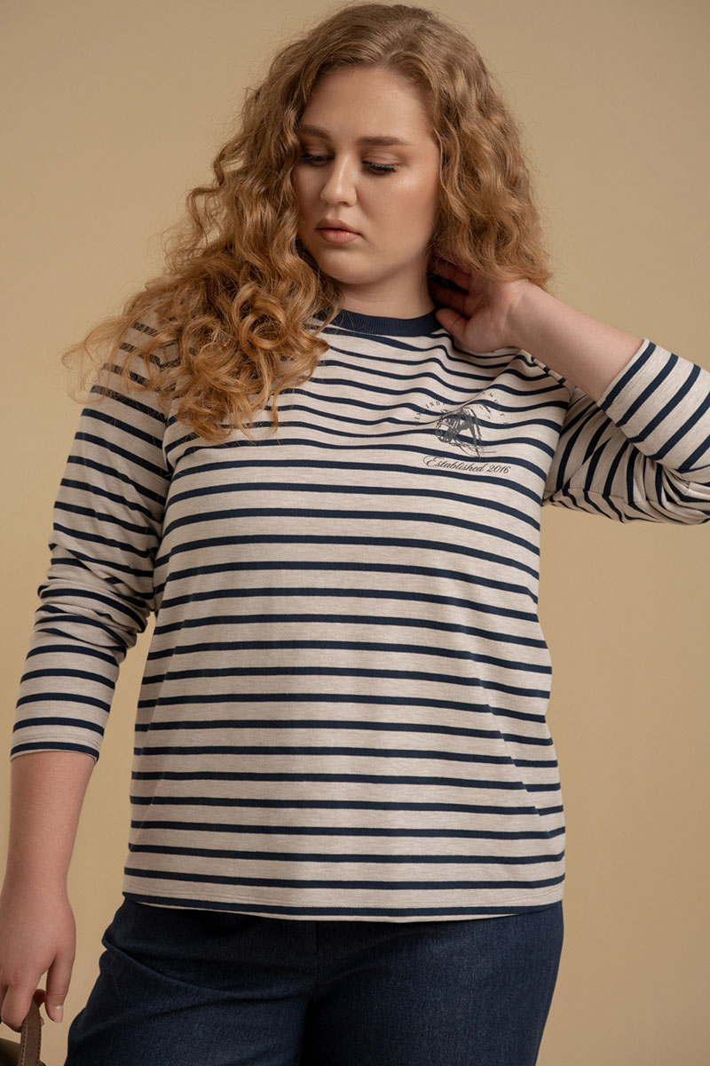 Джемпер женский полуприлегающего силуэта из трикотажного полотна. Вырез горловины- неглубокий, округлой формы. Рукава - втачные. Изделие декорировано авторским принтом.
