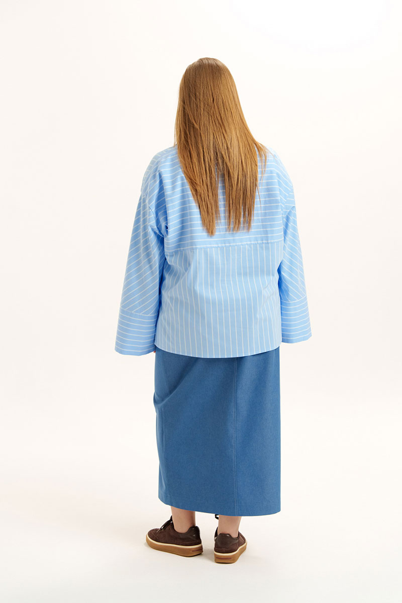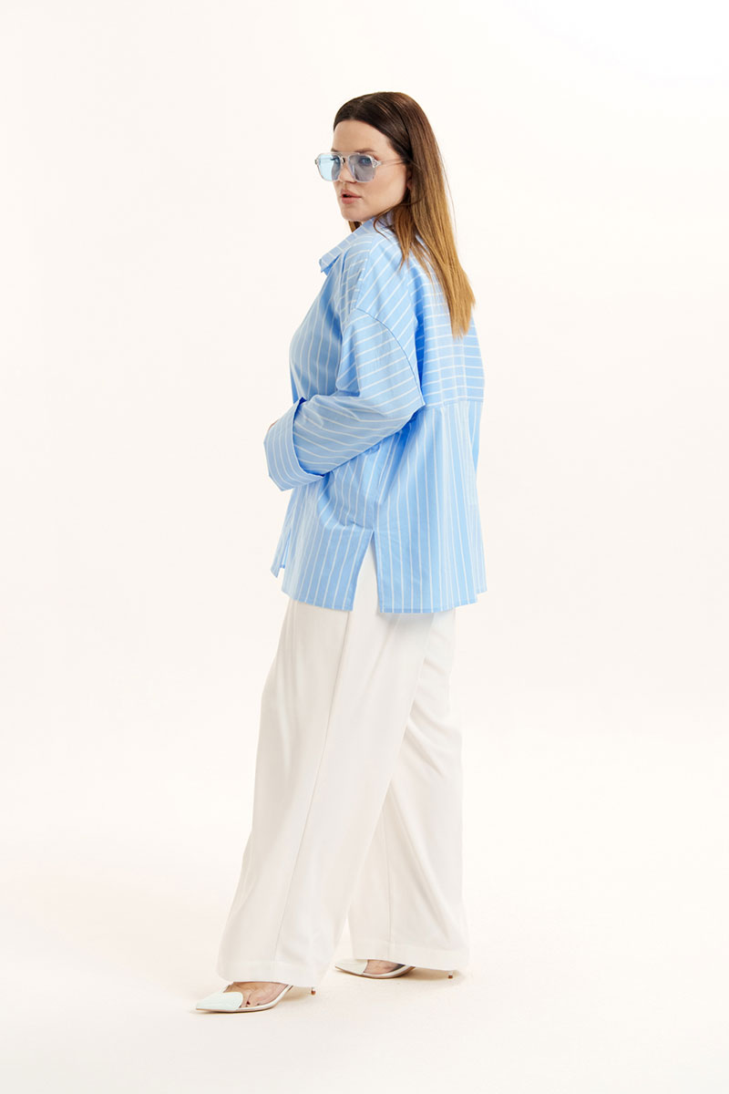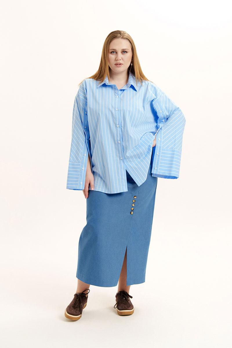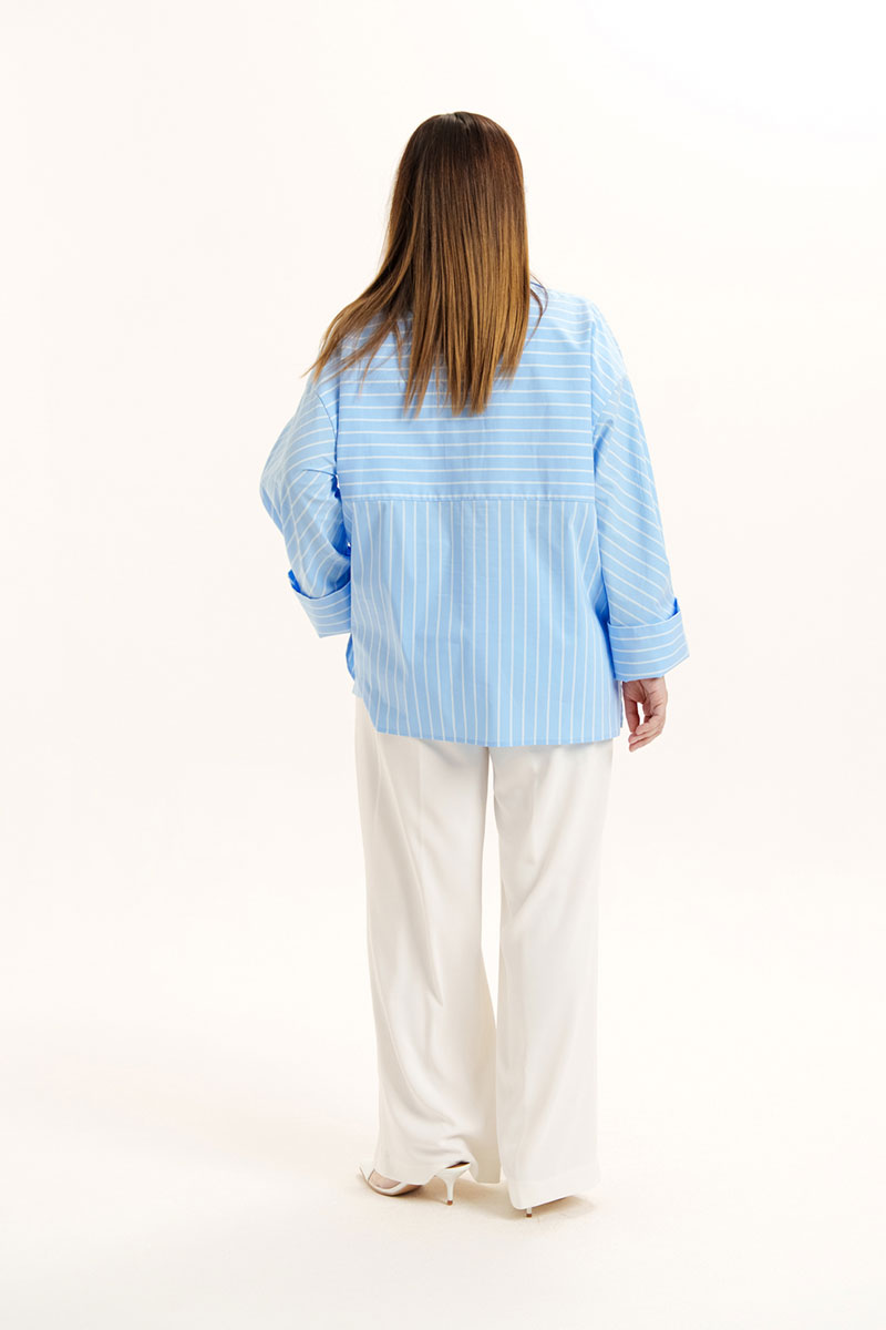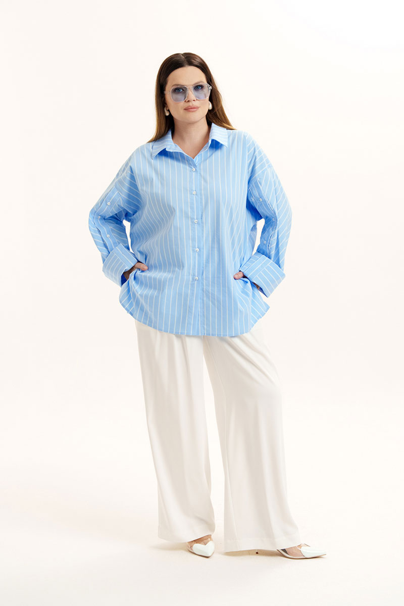 Блуза свободного покроя из хлопковой ткани. Горловина оформлена воротником рубашечного типа. Застежка - планка с петлями и пуговицами. На спинке - кокетка. Рукава - втачные со спущенной линией плеча, снизу - манжеты. По рукаву обработана планка на петли и пуговицы.