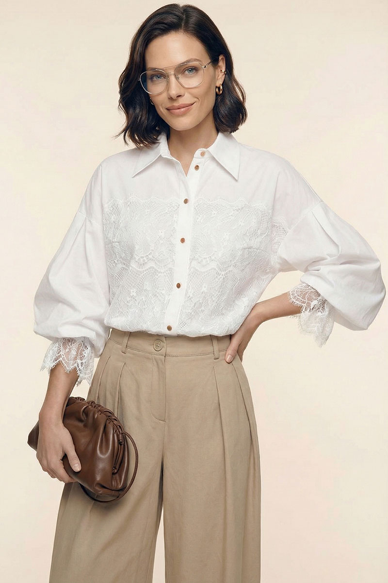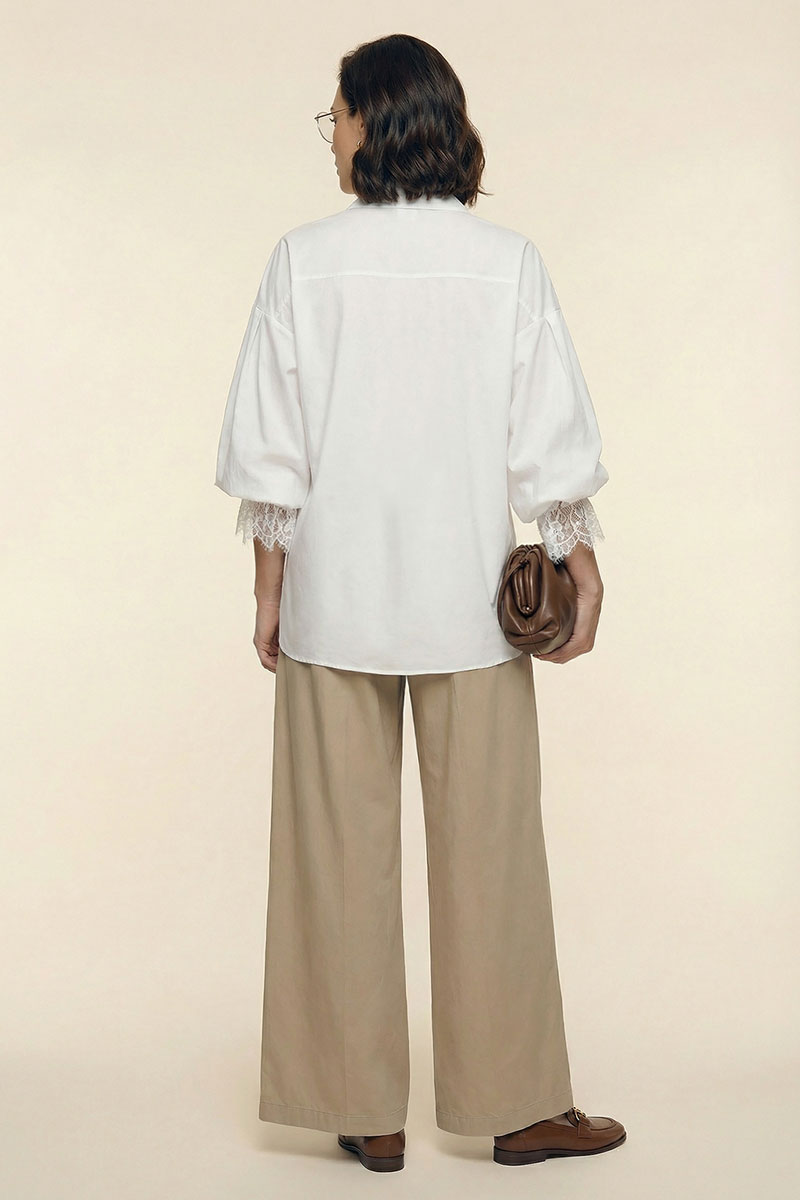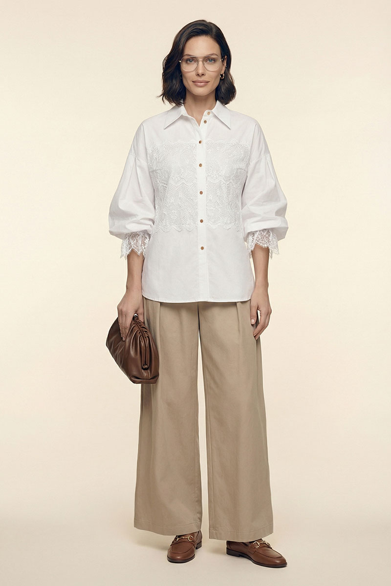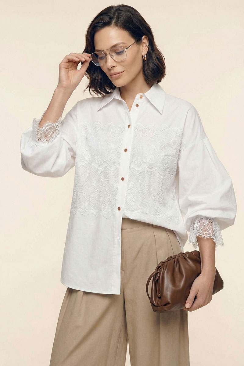 Блузка женская свободного покроя из хлопковой ткани. Вырез короны оформлен воротником рубашечного типа с отрезной стойкой. Застёжка – планка на петли с пуговицами. Рукава – со спущенной линией плеча и мягкой глубокой складкой в области оката. Низа рукавов посажены на эластичную тесьму. Изделия декорировано французским кружевом.