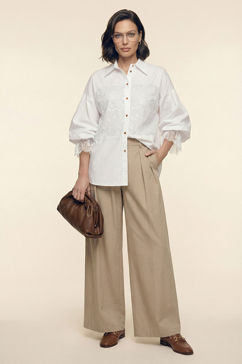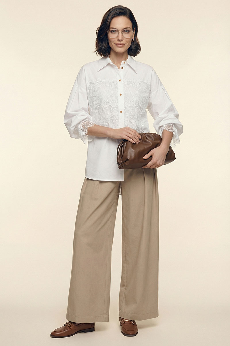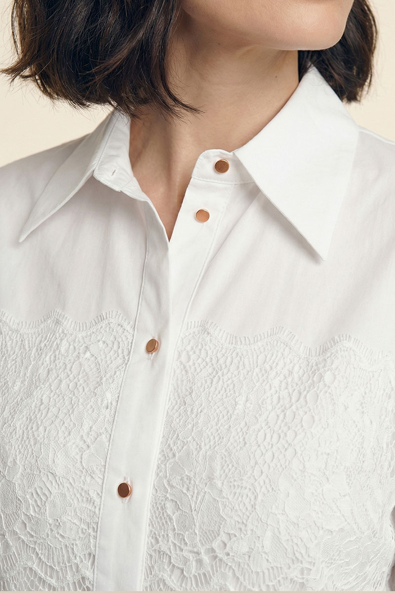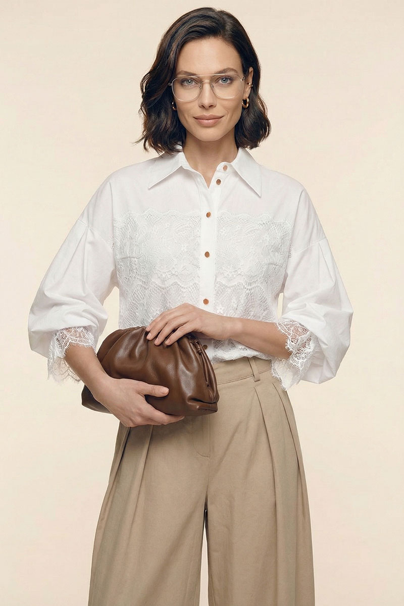 Блузка женская свободного покроя из хлопковой ткани. Вырез короны оформлен воротником рубашечного типа с отрезной стойкой. Застёжка – планка на петли с пуговицами. Рукава – со спущенной линией плеча и мягкой глубокой складкой в области оката. Низа рукавов посажены на эластичную тесьму. Изделия декорировано французским кружевом.