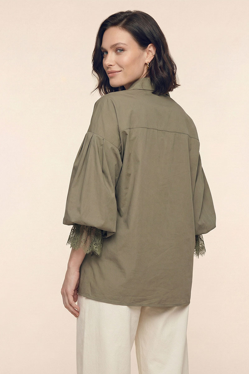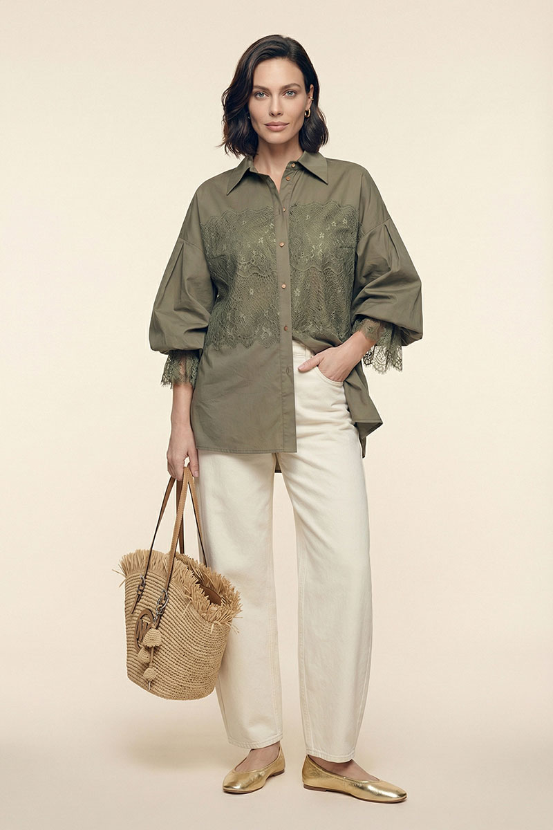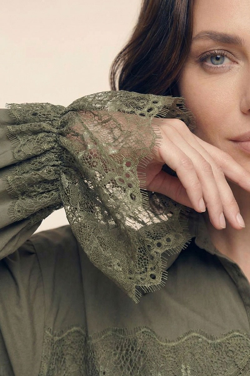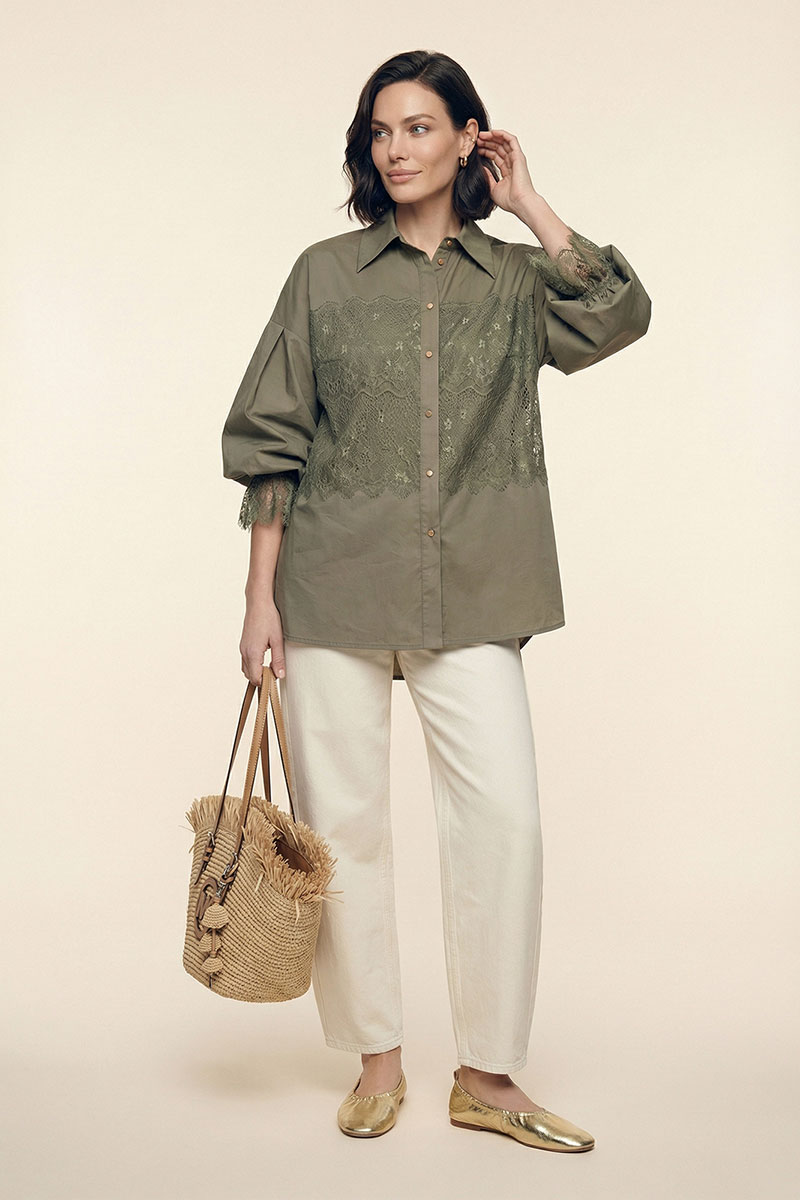 Блузка женская свободного покроя из хлопковой ткани. Вырез короны оформлен воротником рубашечного типа с отрезной стойкой. Застёжка – планка на петли с пуговицами. Рукава – со спущенной линией плеча и мягкой глубокой складкой в области оката. Низа рукавов посажены на эластичную тесьму. Изделия декорировано французским кружевом.
