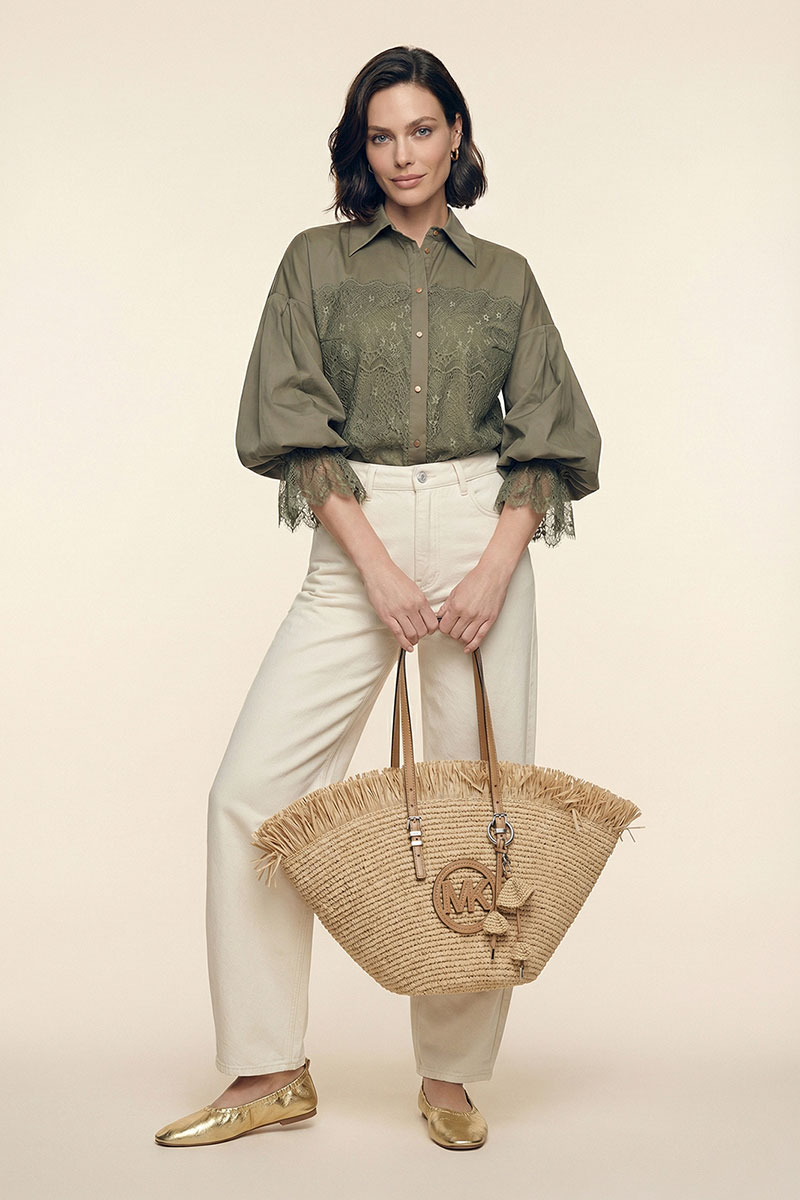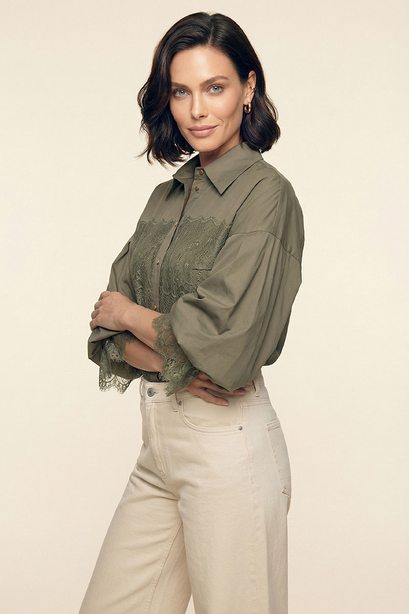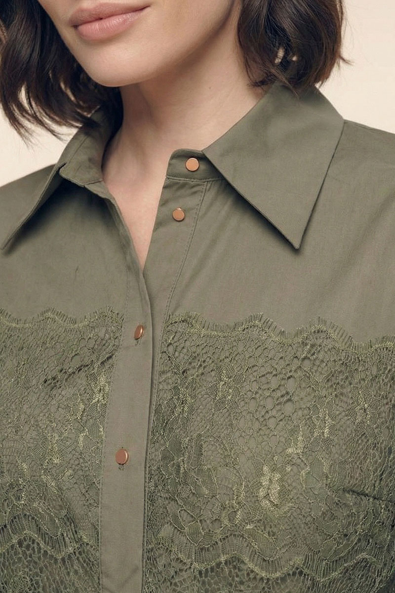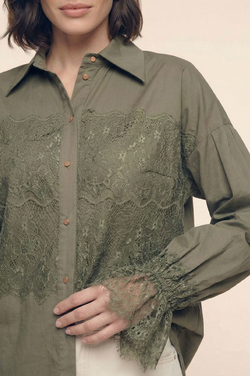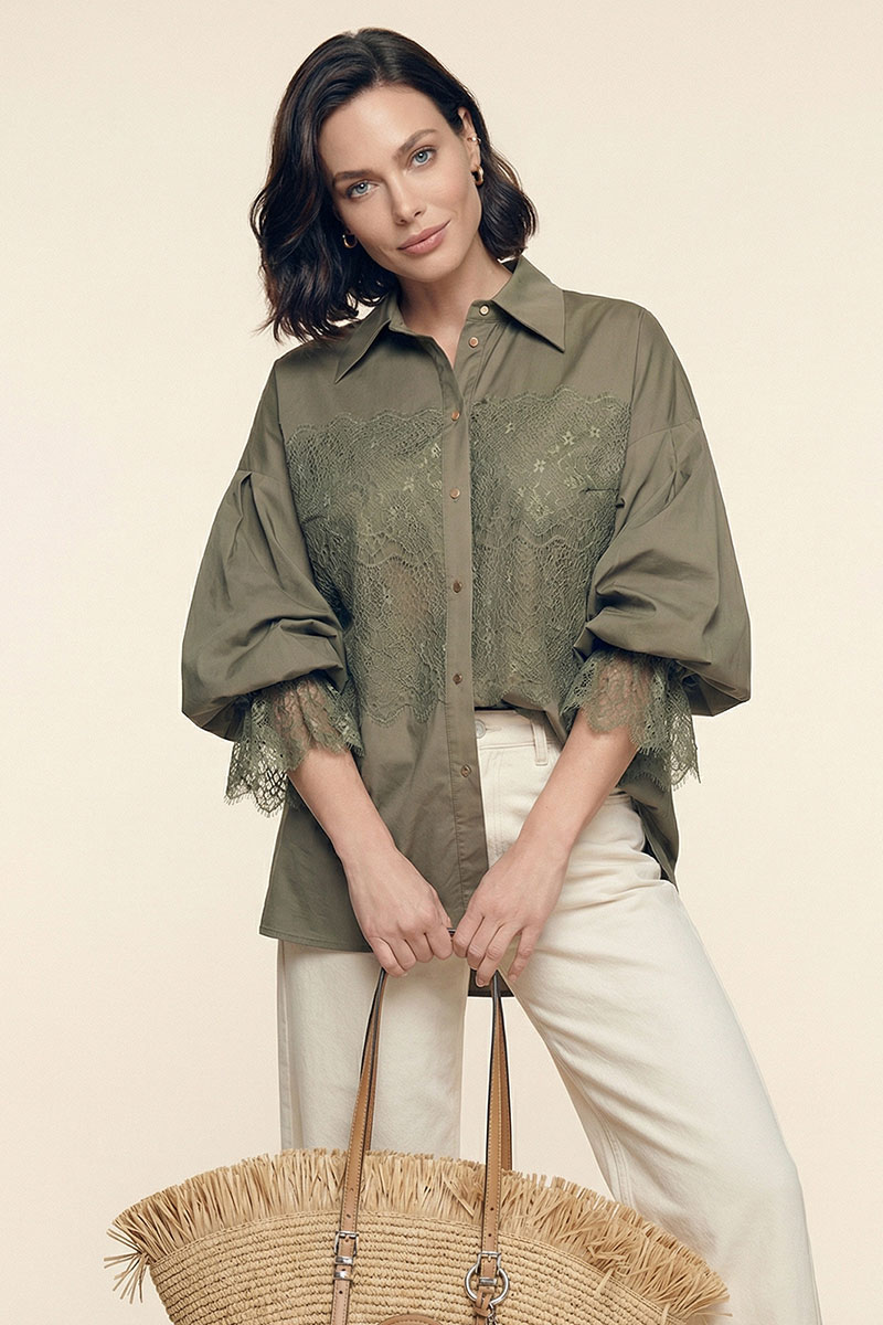 Блузка женская свободного покроя из хлопковой ткани. Вырез короны оформлен воротником рубашечного типа с отрезной стойкой. Застёжка – планка на петли с пуговицами. Рукава – со спущенной линией плеча и мягкой глубокой складкой в области оката. Низа рукавов посажены на эластичную тесьму. Изделия декорировано французским кружевом.