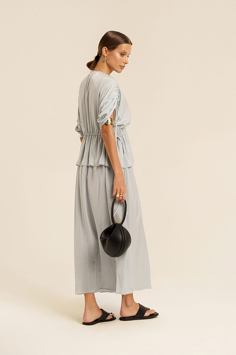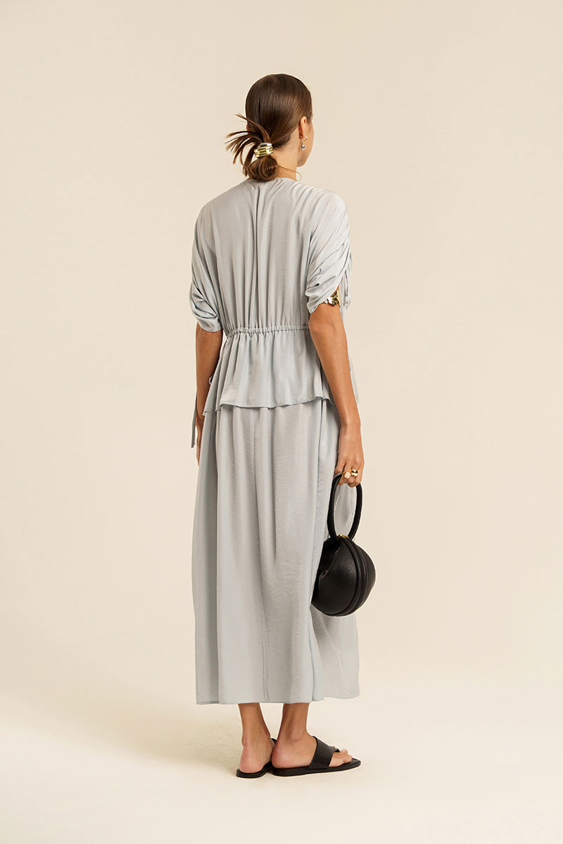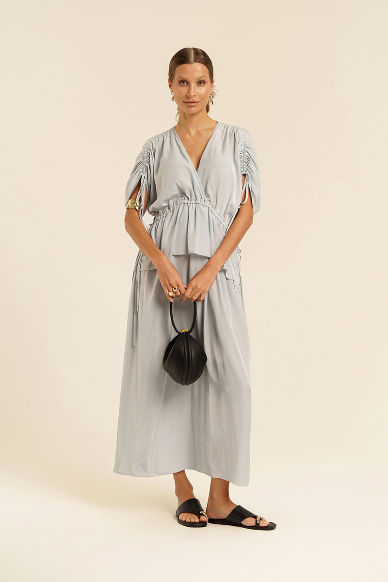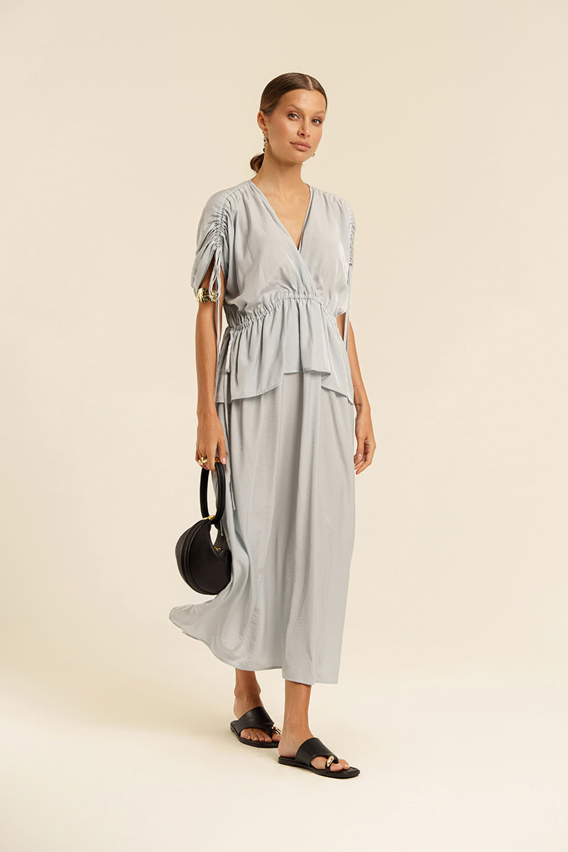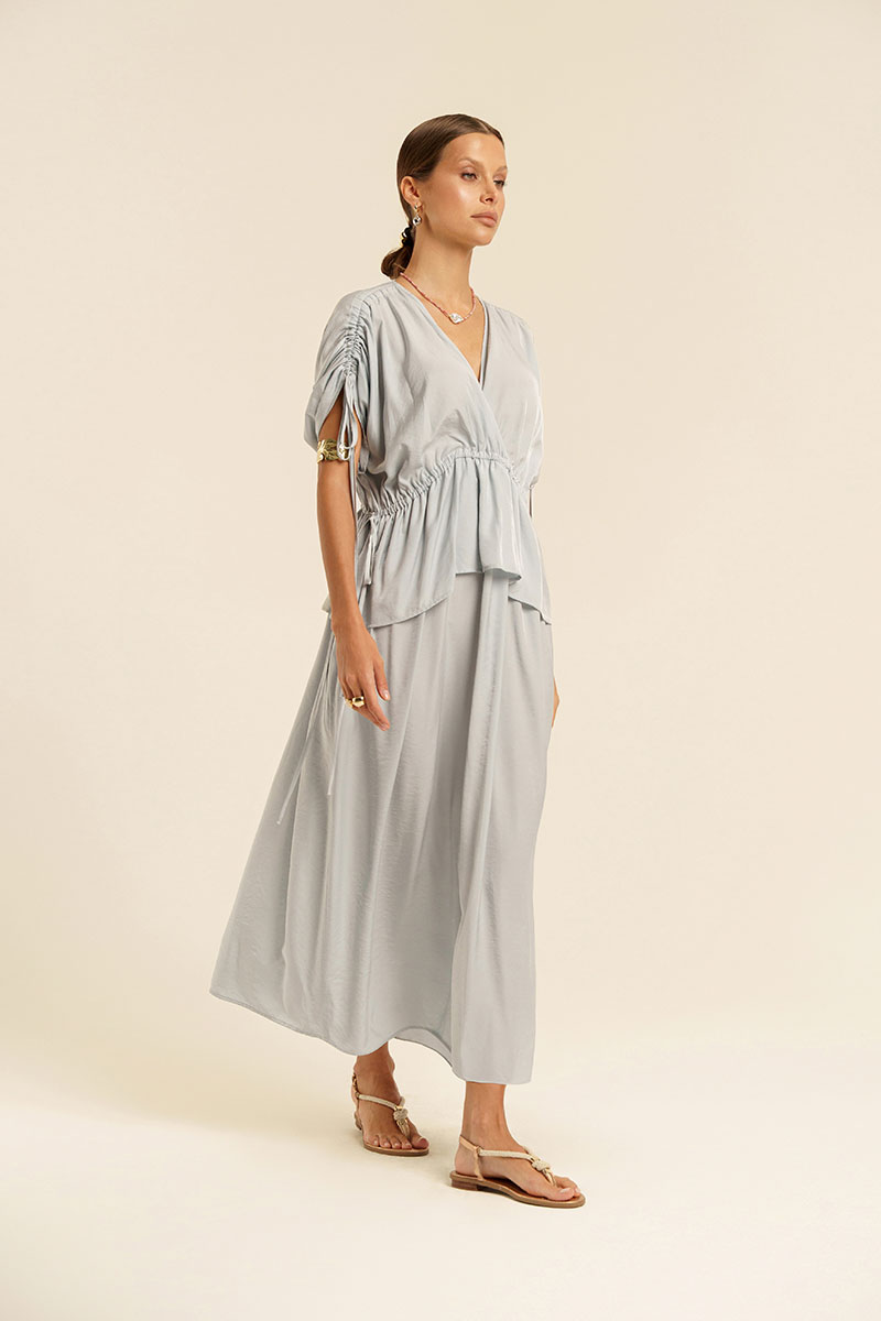 Платье женское приталенного силуэта из вискозной ткани. Вырез горловины- углубленный V-образной с запахом. Рукава- цельнокроеные с кулисами в плечевых швах, что позволяет регулировать длину рукава. В области линии талии выполнен декоративный элемент в виде подреза с баской. При помощи кулисы со шнурком можно регулировать длину линии приталивания. В боковых швах имеются карманы.