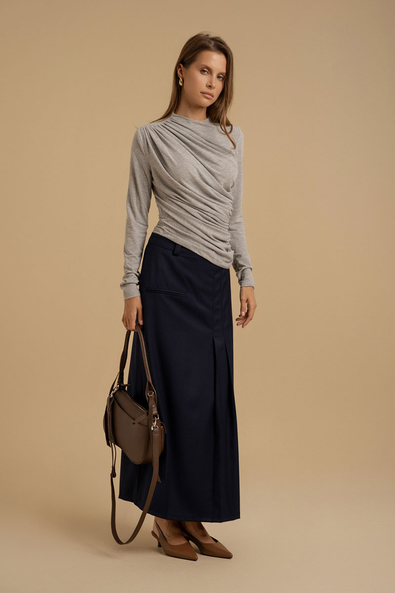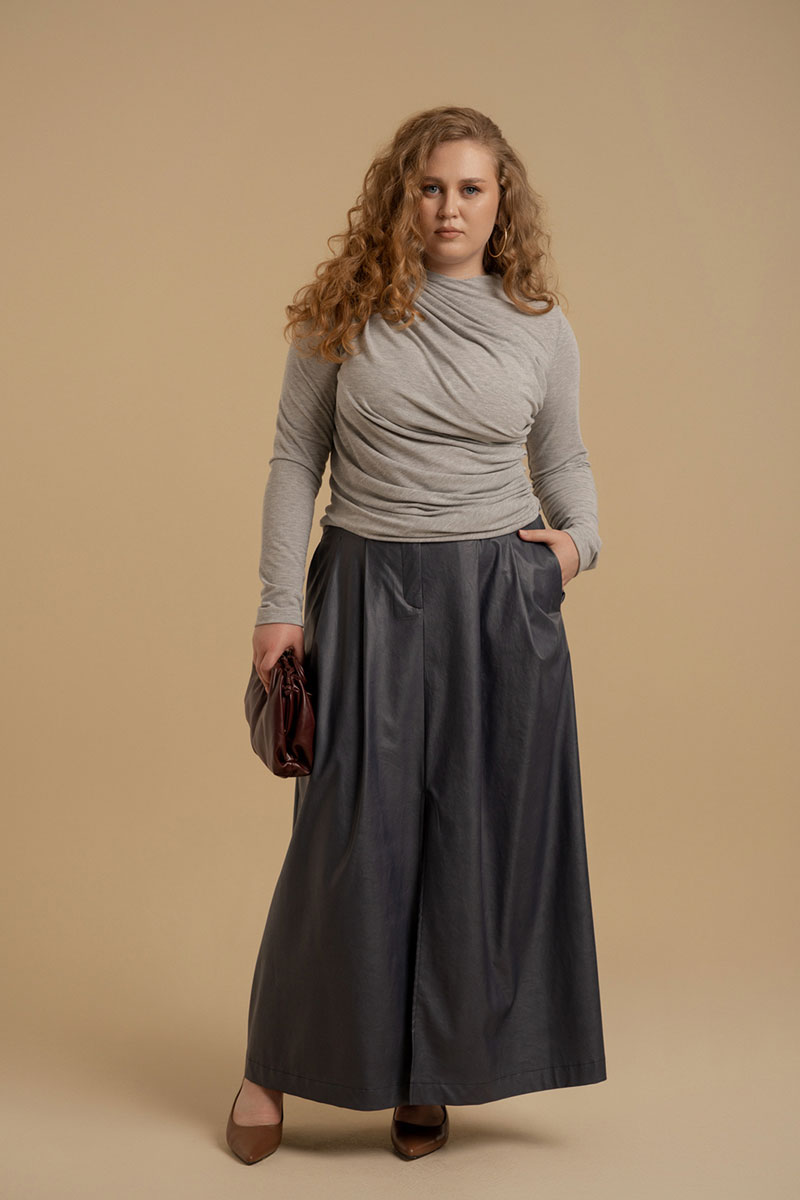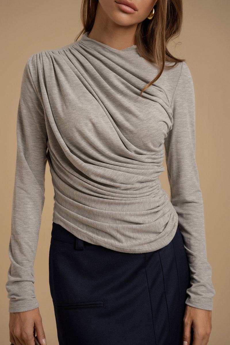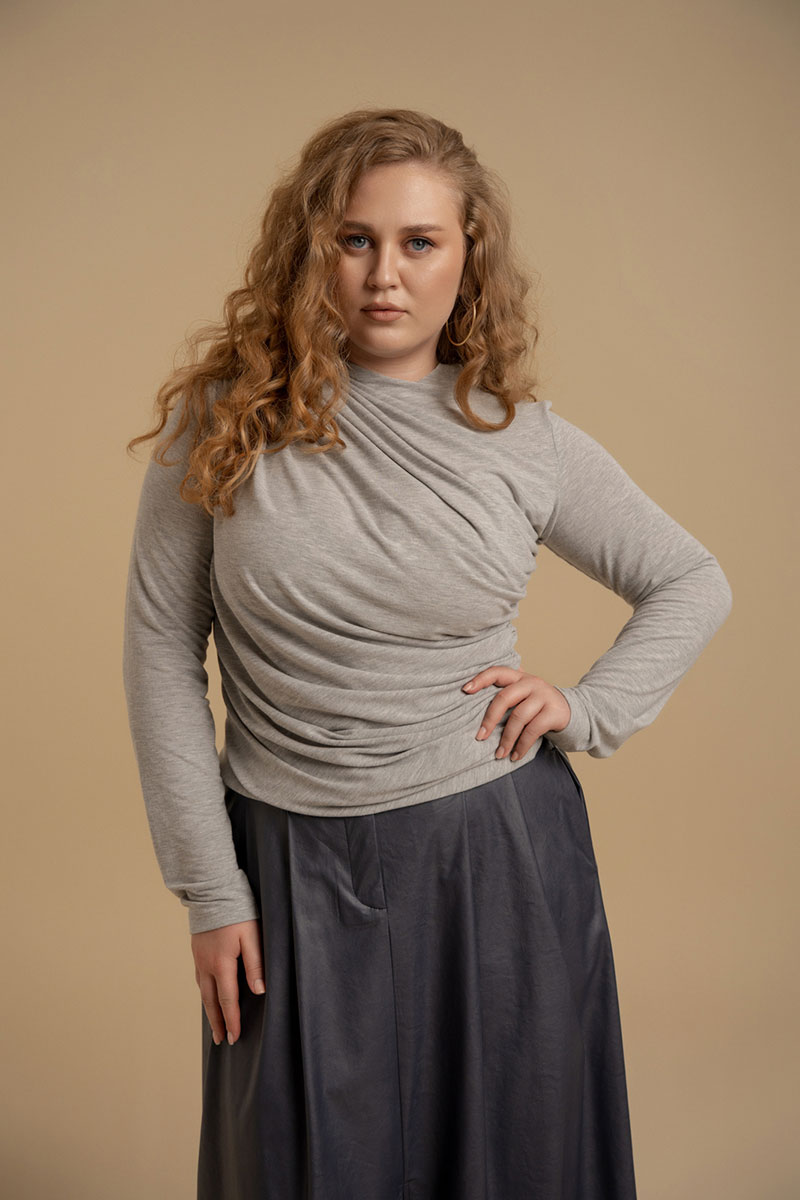 Джемпер женский облегающего силуэта из эластичного трикотажного полотна. Вырез горловины - неглубокий. Рукава - втачные. Изделие декорировано ассиметричной драпировкой.