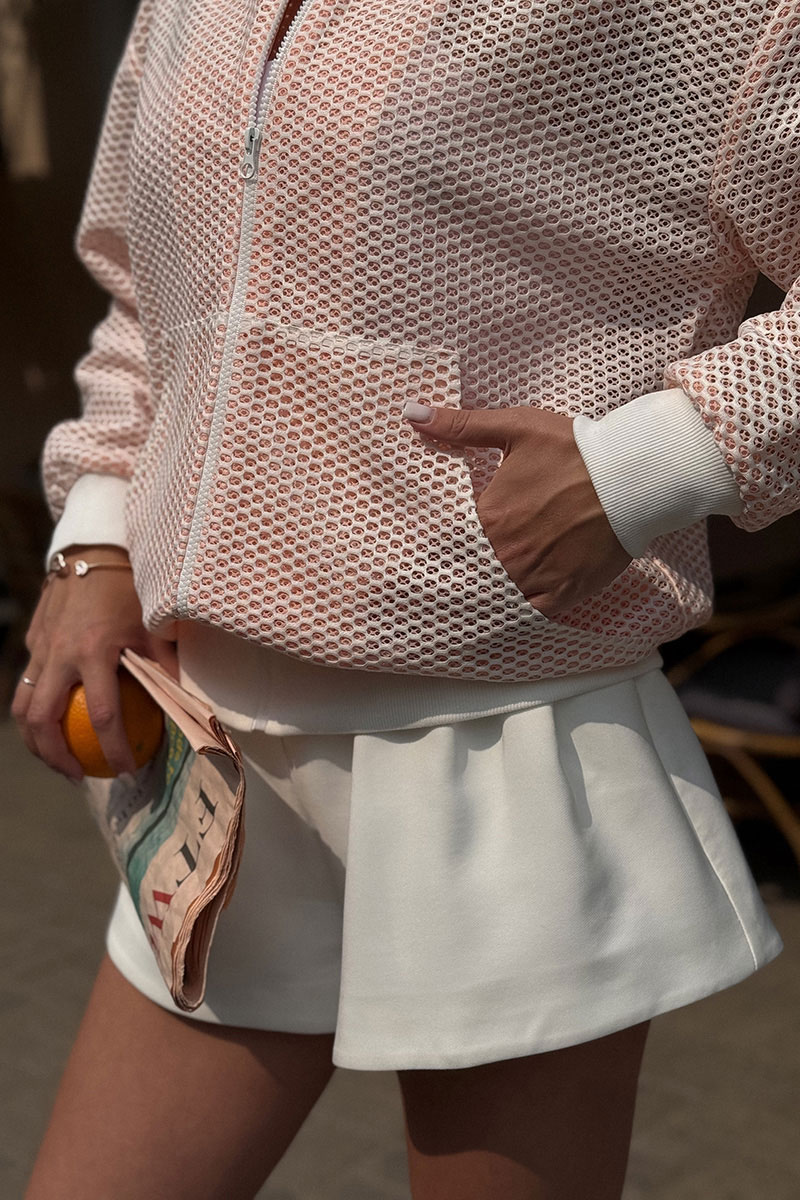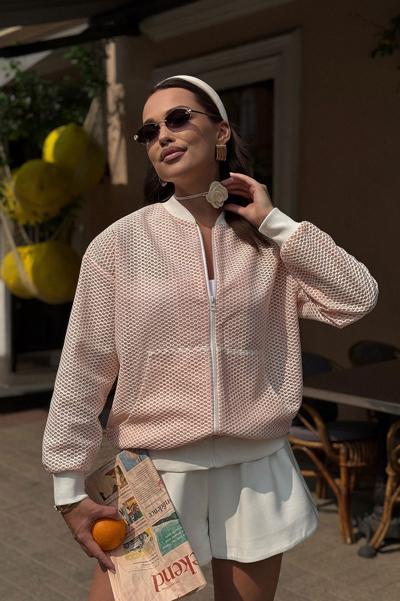 Жакет-бомбер женский, прямого силуэта, со спущенной линией плечевого шва, выполнен из трикотажногосетчатого полотна. Спинка без конструктивных особенностей. Перед с застежкой на тесьму-молнию. По переду обработаны накладные карманы-кенгуру. Низ изделия обработан притачными планками из отделочной ткани. Рукава втачные, одношовные. По низу рукава притачные манжеты из отделочной ткани. Воротник стойка с закругленным концом из отделочной ткани.