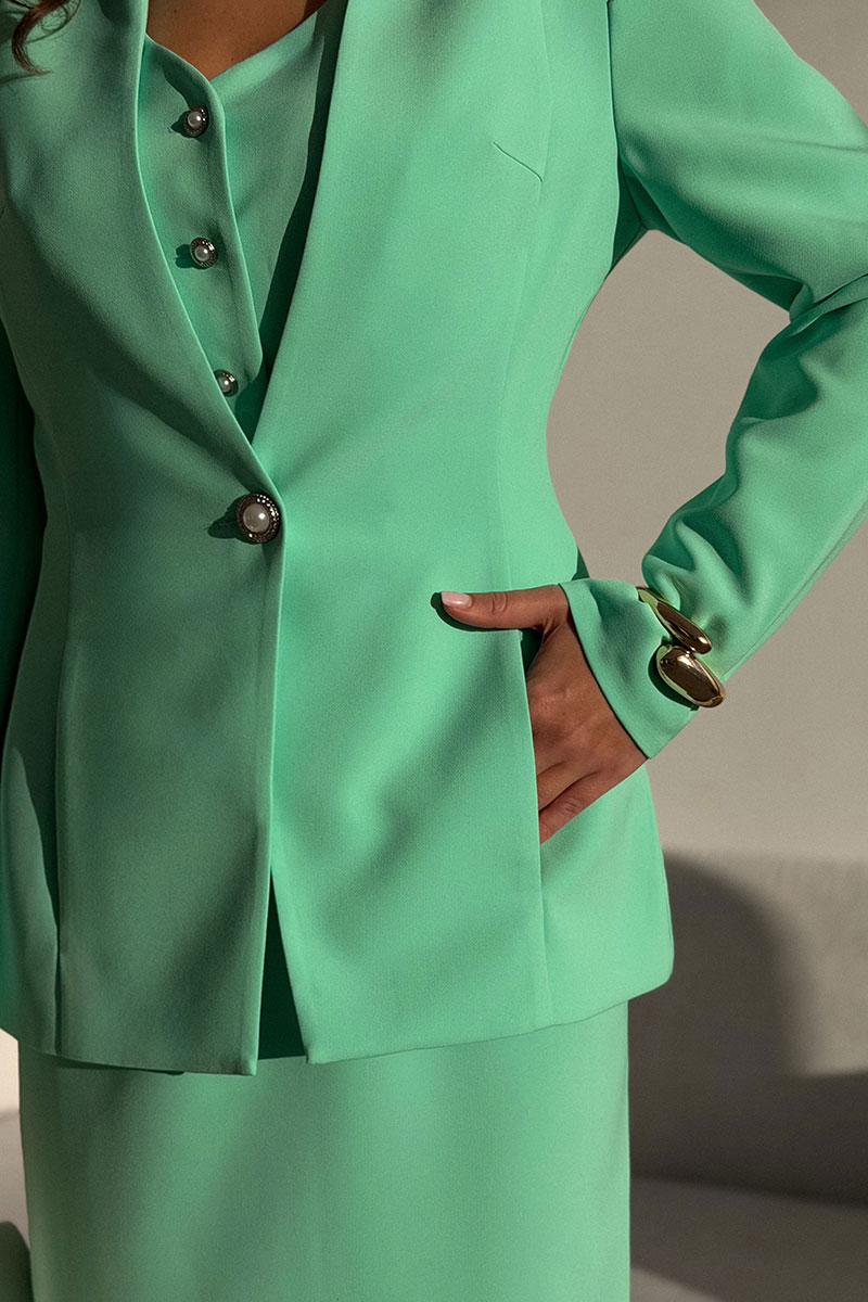 Жакет с фигурным вырезом горловины, фигурным бортом, застегивающимся на одну пуговицу. Рукава втачные двухшовные.