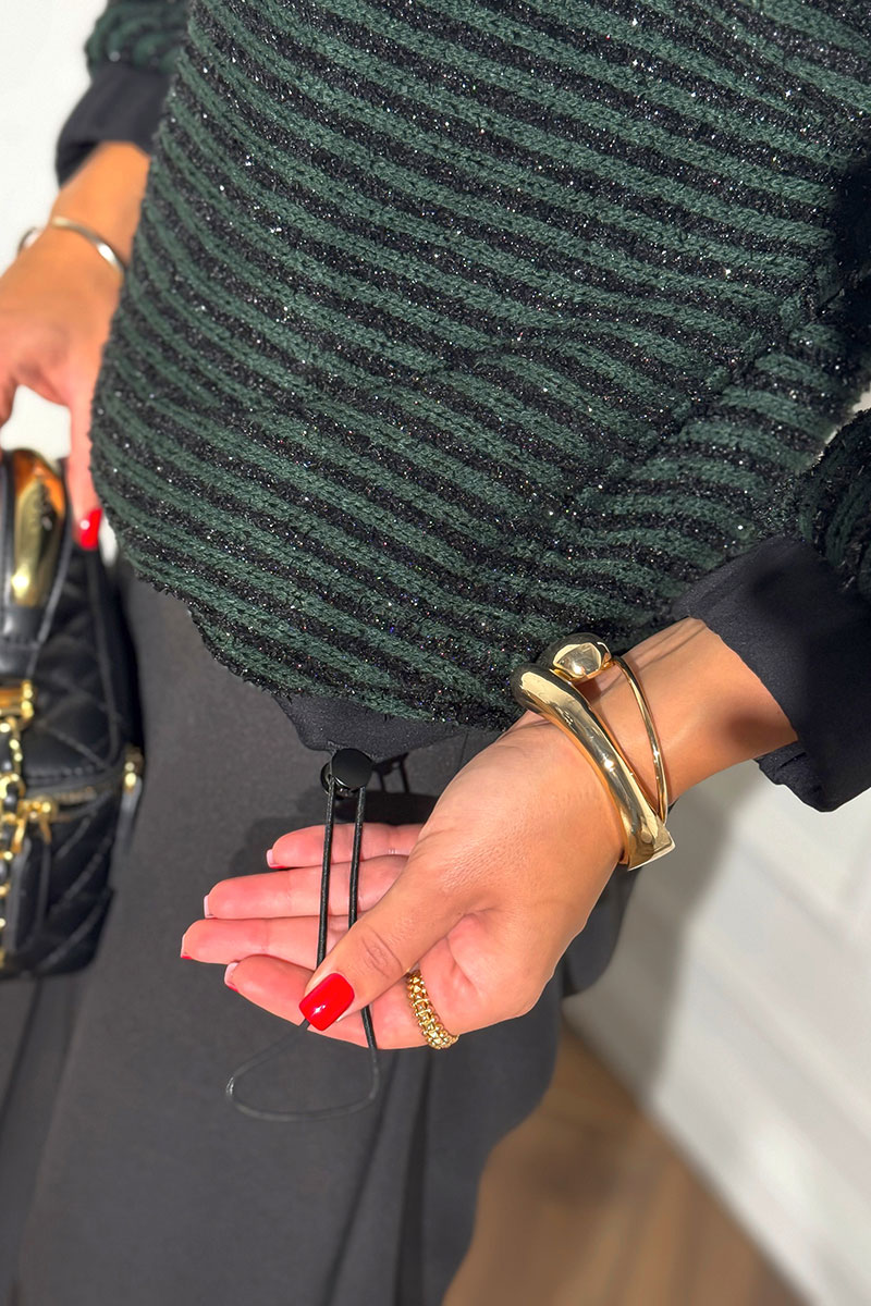 Низ рукава и низ джемпера обработаны притачными планками из отделочной ткани. По низу переда пробита петля и протянут шнур по кругу через фиксаторы, что позволяет затянуть низ