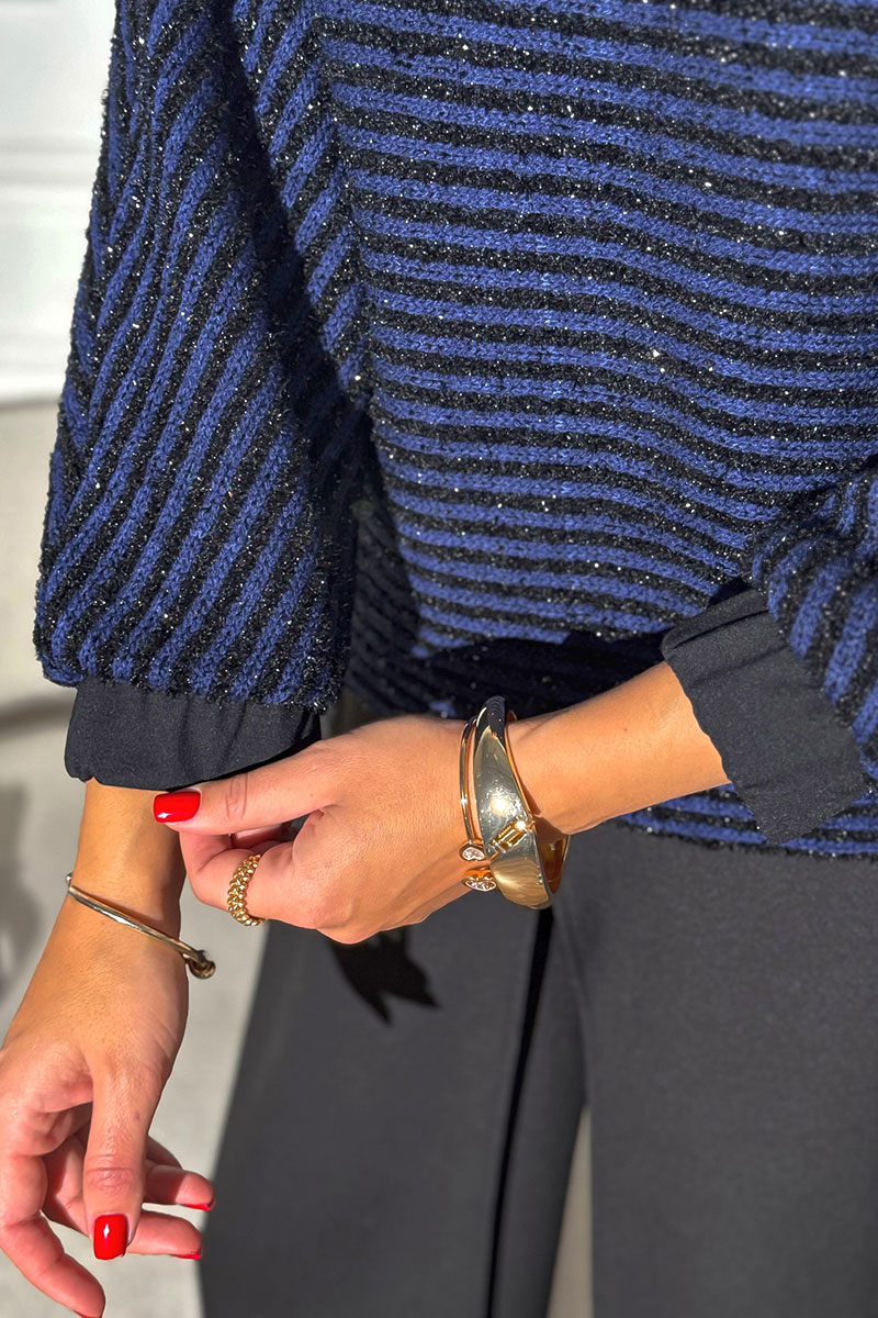Низ рукава и низ джемпера обработаны притачными планками из отделочной ткани. По низу переда пробита петля и протянут шнур по кругу через фиксаторы, что позволяет затянуть низ
