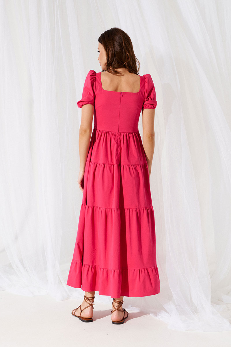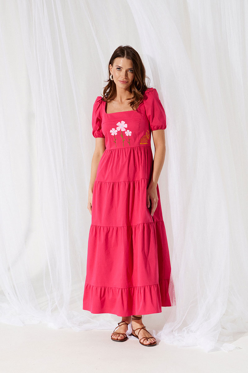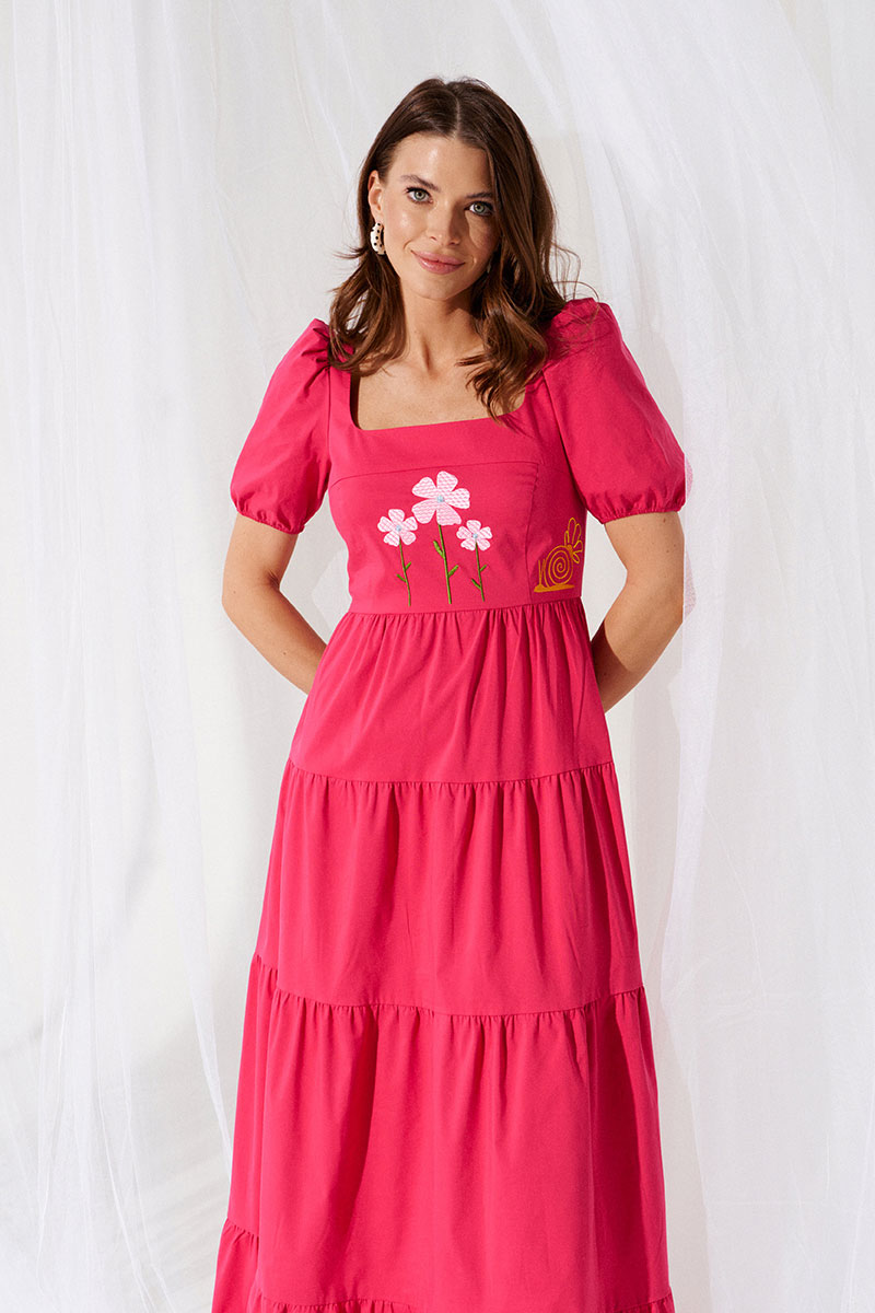 Платье полуприлегающего силуэта, с фигурным вырезом горловины и застежкой на потайную молнию в среднем шве спинки. Лиф переда отрезной, с горизонтальным и вертикальными рельефными швами. Лиф украшен вышивкой "цветы + улитка". Нижняя часть платья четырехъярусная. Спинка отрезная, со средним швом и талиевыми вытачками. Рукав короткий, собран на резинку по нижнему срезу.