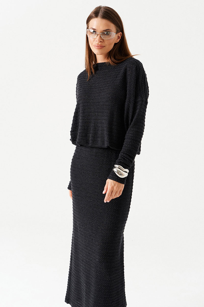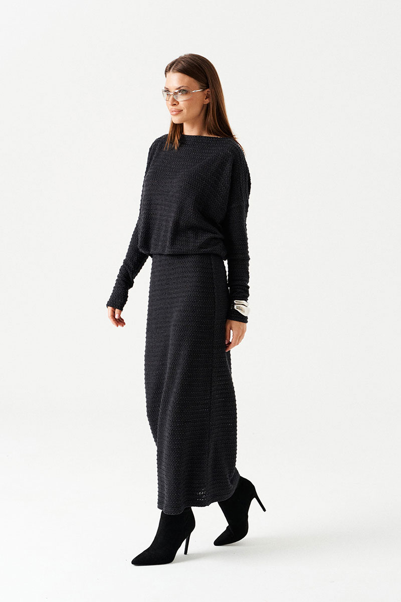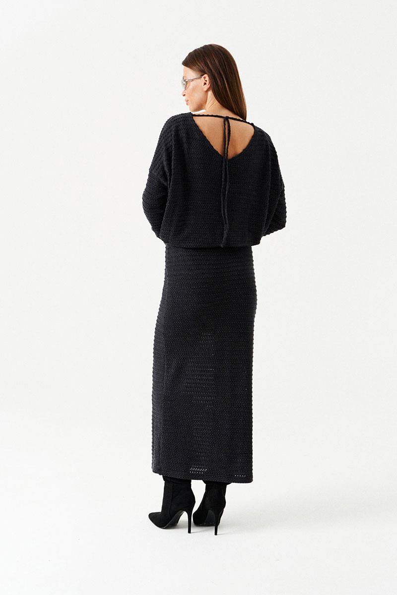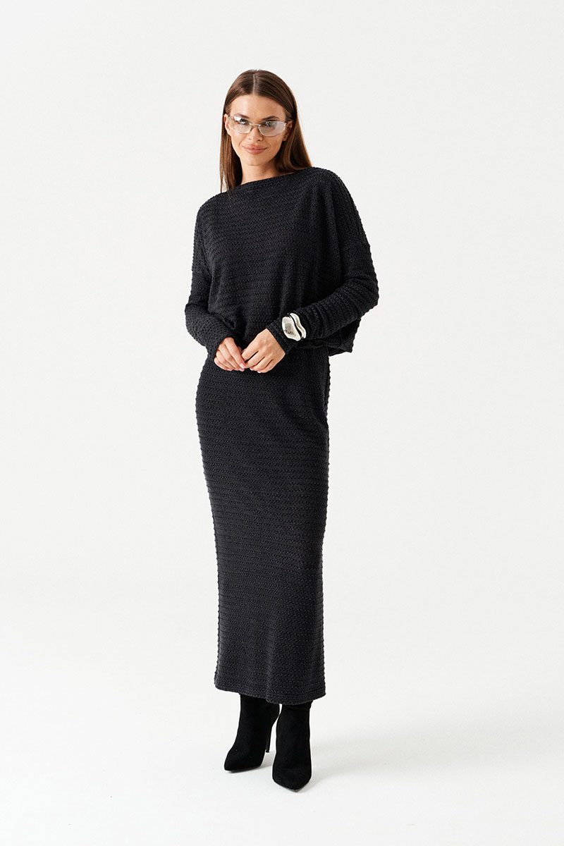 Платье женское из трикотажного полотна, длинное, приталенного силуэта, умеренного объема. Горловина углубленная, V-образной формы, с завязками из основной ткани со стороны спинки. Рукав цельнокроеного покроя с отрезной двойной частью. На уровне линии талии – двойной пояс на резинке.