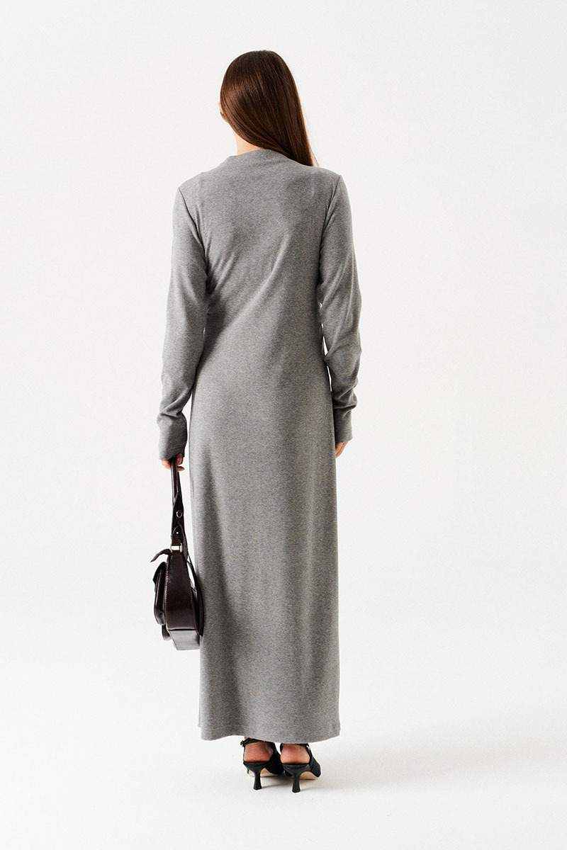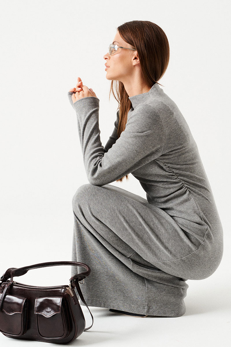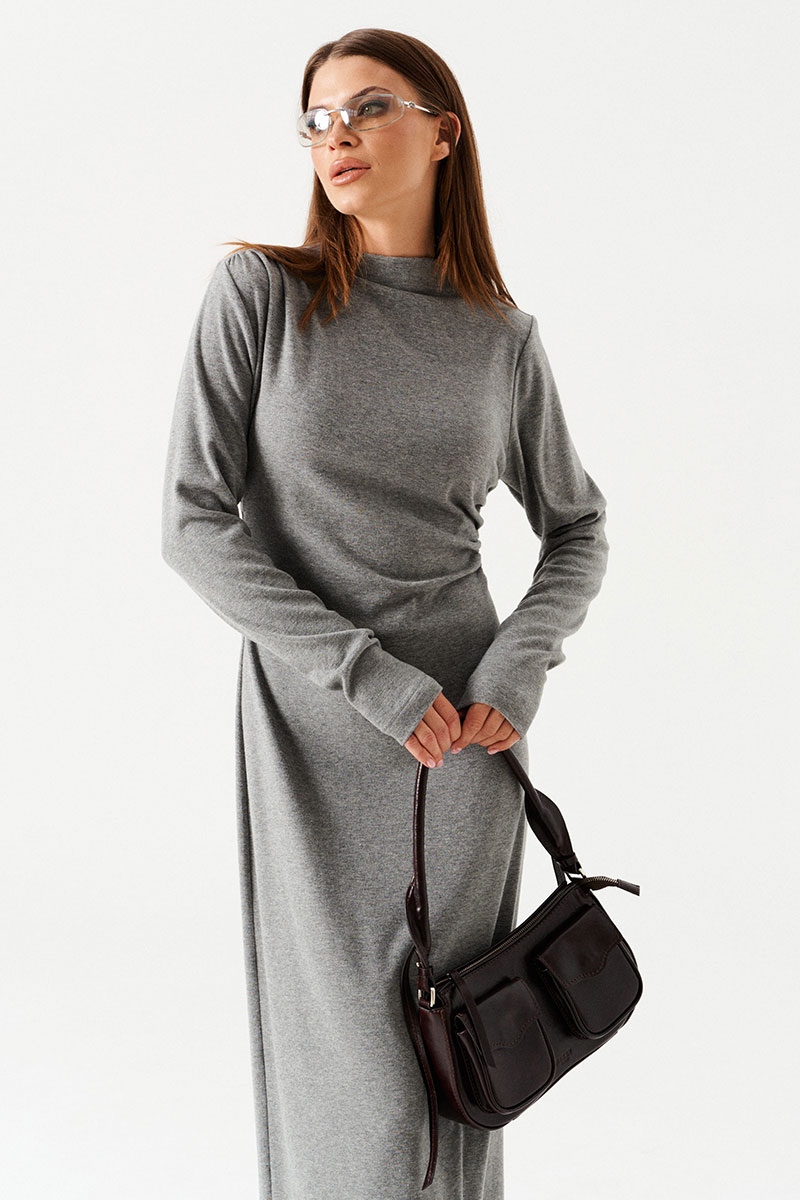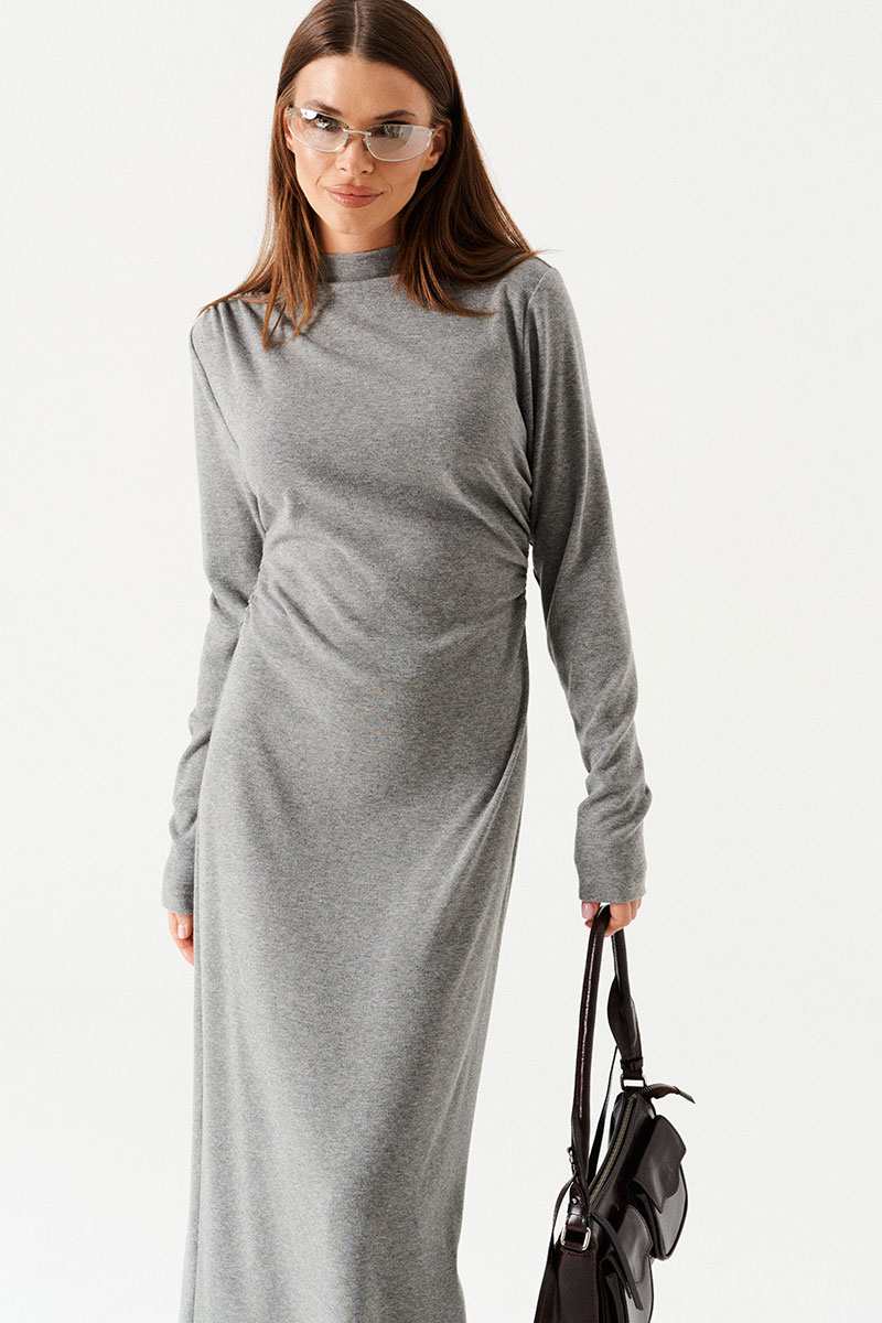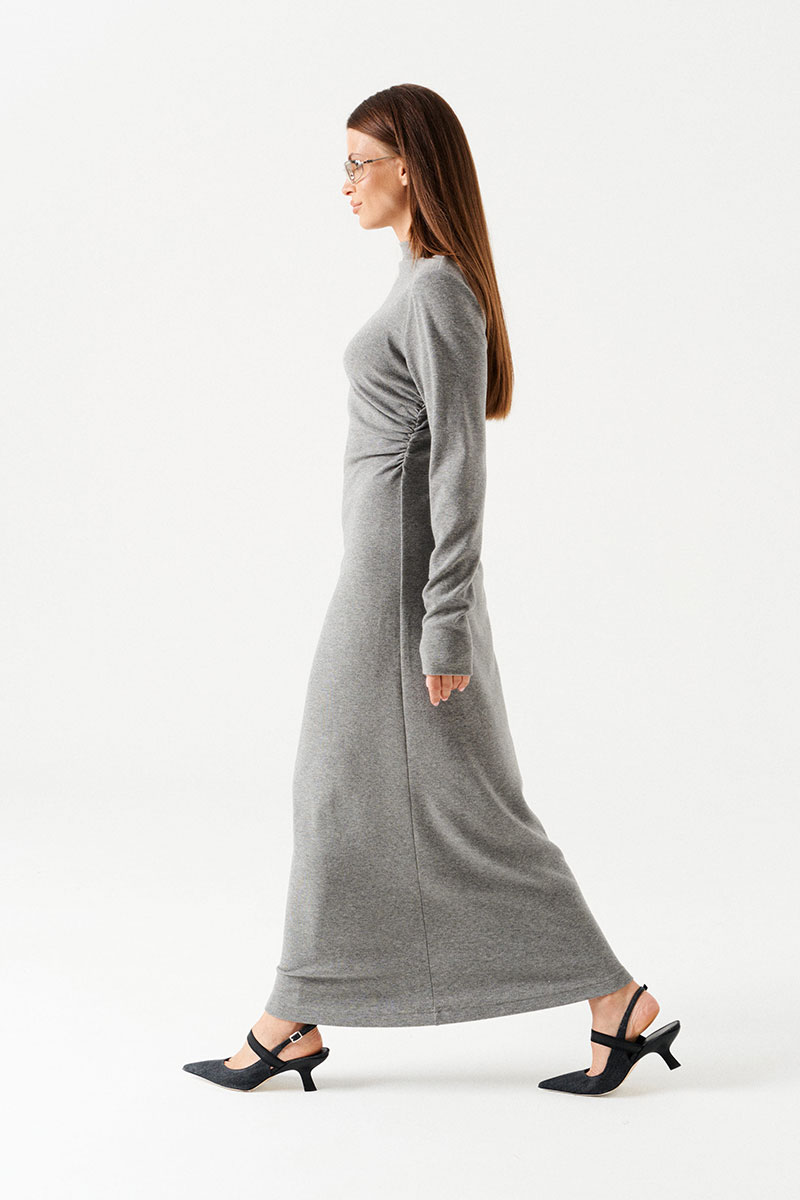 Платье женское из трикотажного полотна, длинное, прилегающего силуэта. По переду – драпировка, выходящая из правого плечевого шва и уходящая в левый боковой шов. В правом боковом шве сборка на резинку. По горловине цельнокроеная стойка, обработаная обтачкой. Рукав втачной, длинный.