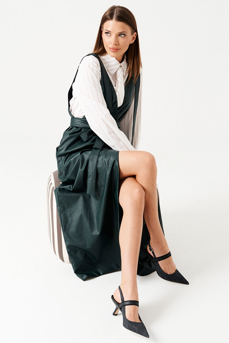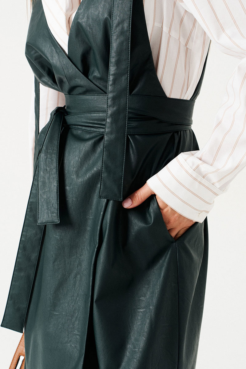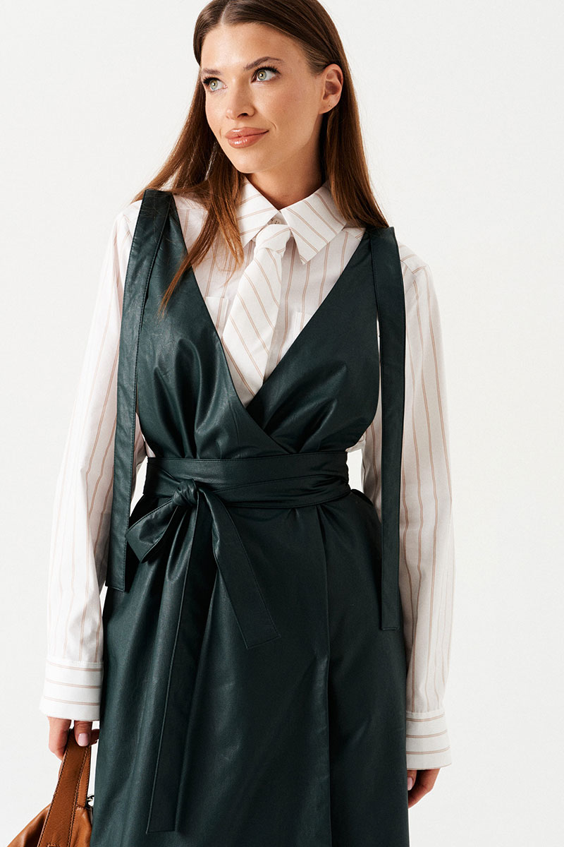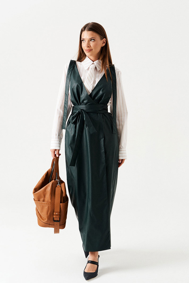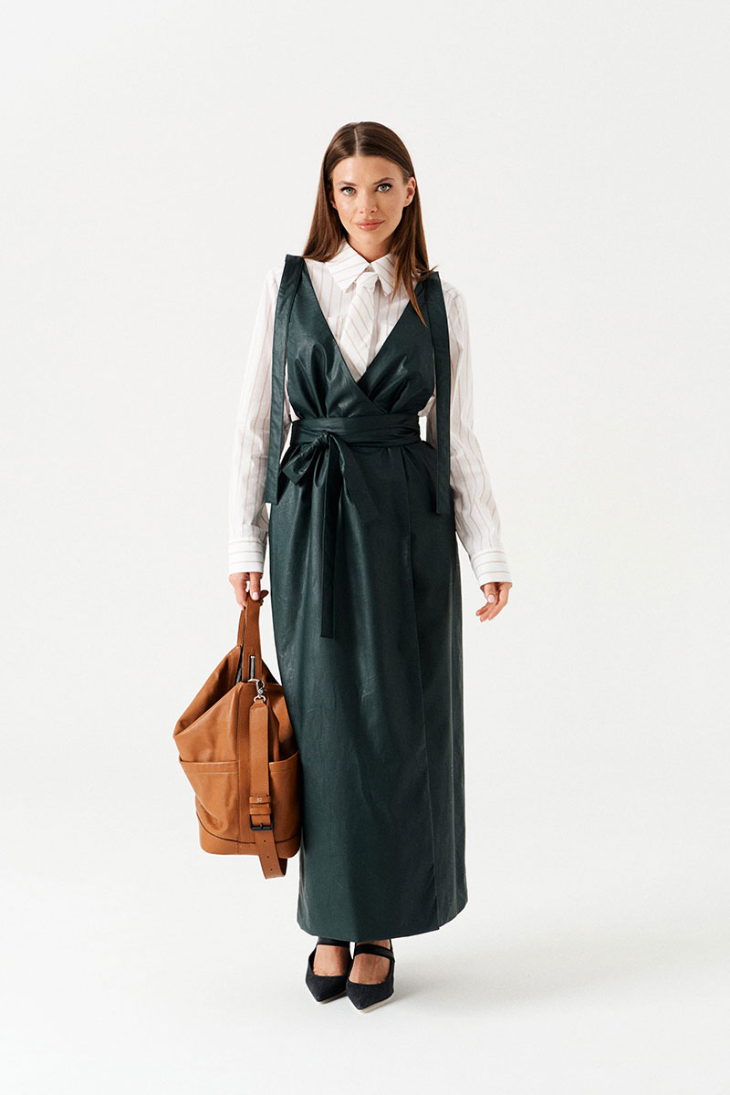 Сарафан женский приталенный, с запахом, на широких бретелях, на подкладке. Приталенность достигается за счет съемного пояса. Вырез горловины переда и спинки имеет V-образную форму. Перед со смещенной застежкой на 2 пришивные кнопки. В боковых швах расположены карманы.