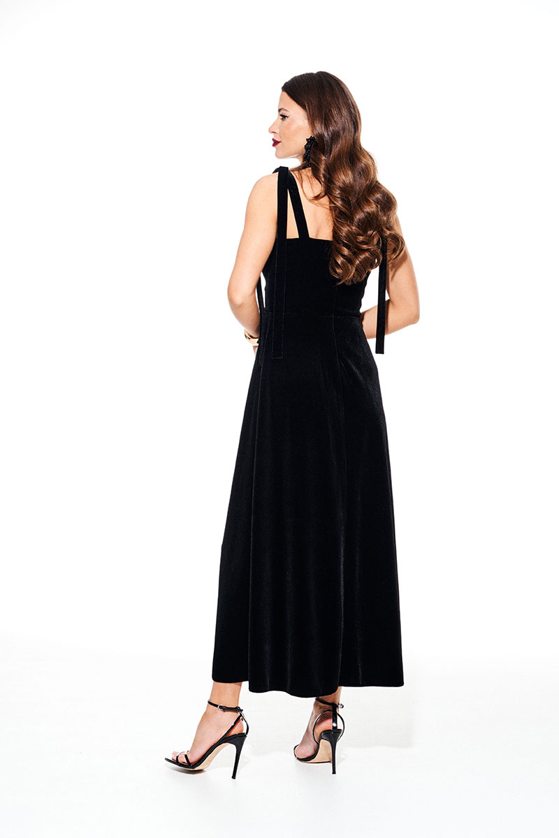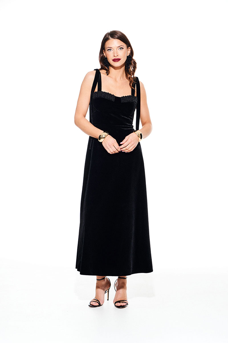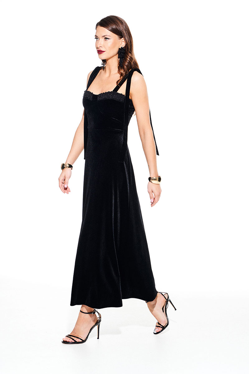 Платье из бархата на трикотажной основе, приталенного силуэта, отрезное на уровне линии талии, на бретелях с завязками, с застежкой на потайную молнию в среднем шве спинки. Лиф переда с рельефами и отрезными чашками. Верхняя деталь чашки оформлена декоративной вставкой из бусин. Спинка с рельефами и средним швом. Лиф платья на подкладке. Длина платья до щиколотки.