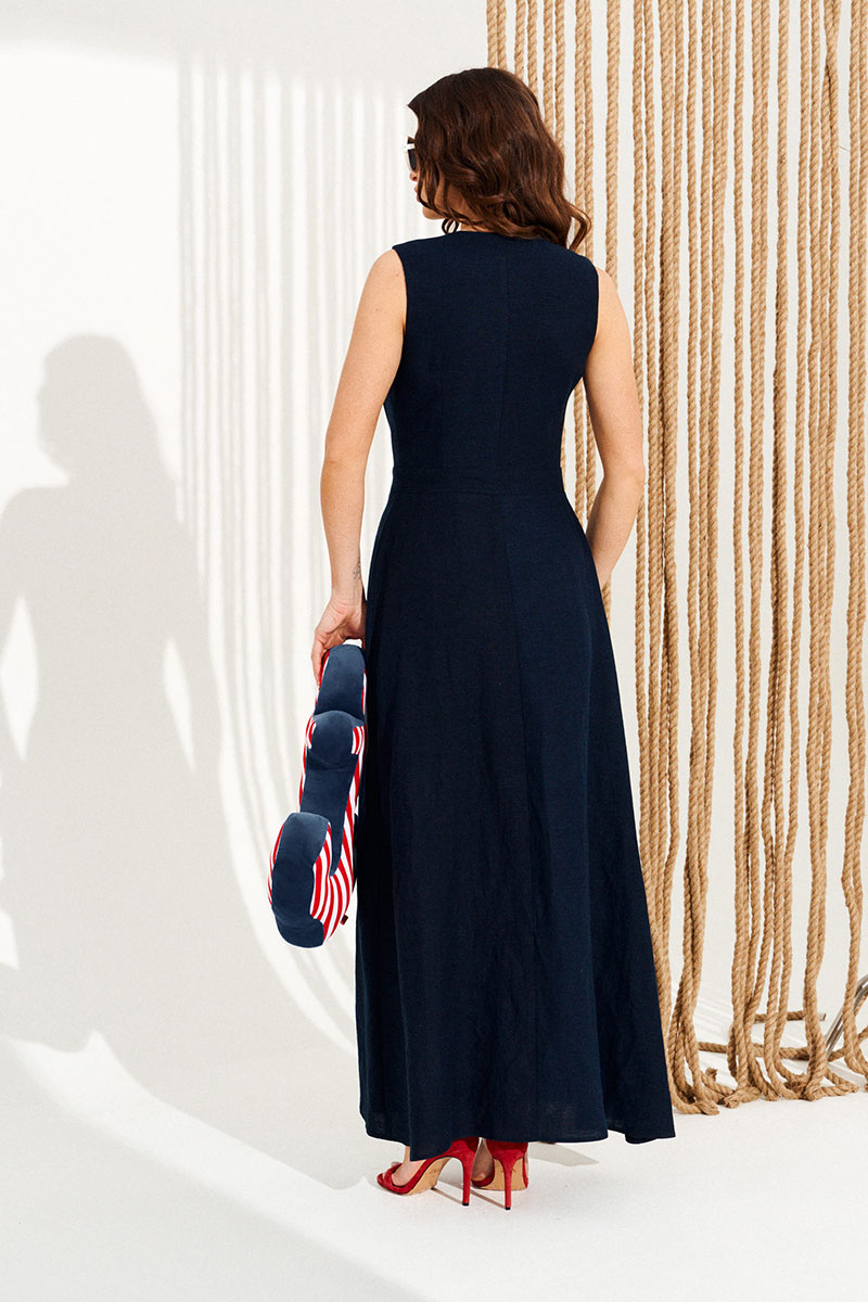 Платье полуприлегающего силуэта, расклешенное книзу, отрезное по линии талии, с V-образным вырезом горловины и лацканами, центральной двубортной застежкой на петли и пуговицы. Правый лацкан оформлен декоративной тесьмой. Перед и спинка с талиевыми вытачками. Спинка со средним швом.