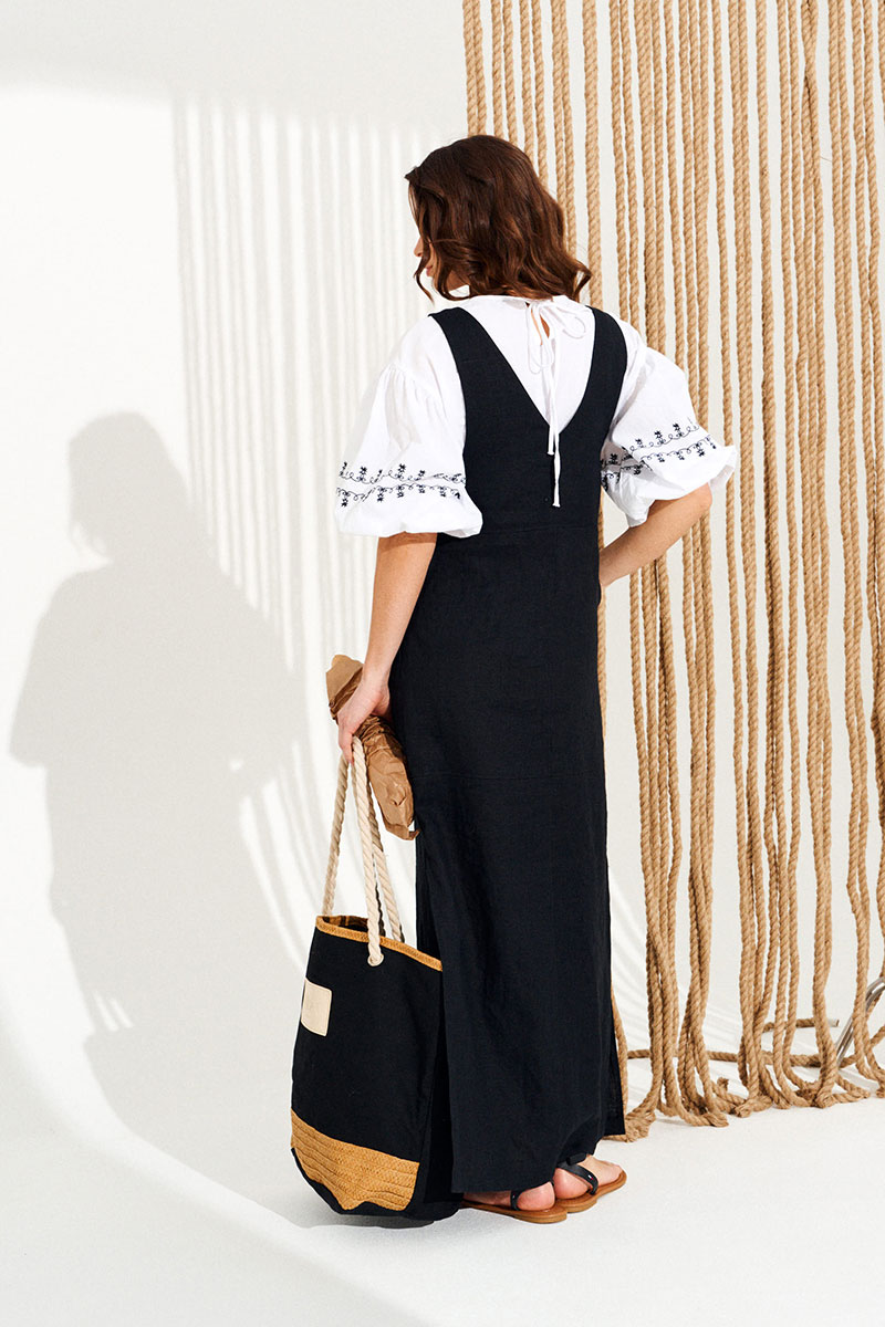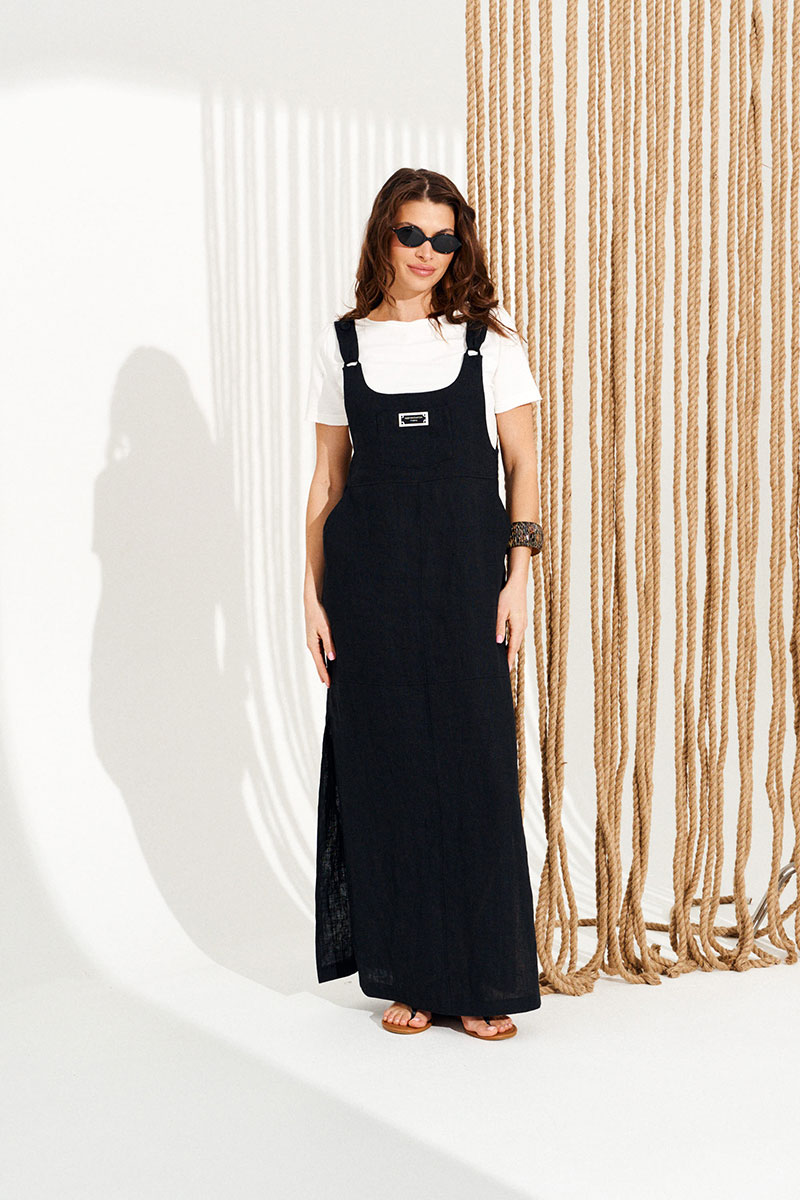 Сарафан умеренного объема, прямого силуэта, отрезной по линии талии, на регулируемых бретелях с пуговицами, с потайной застежкой на тесьму-молнию в левом боковом шве. Верхняя деталь переда с фигурным вырезом горловины и накладным карманом с декоративной нашивкой. Нижняя деталь переда со средним швом, горизонтальным подрезом и боковыми карманами с отрезным бочком. Верхняя деталь спинки с V-образным вырезом. Нижняя деталь спинки со средним швом и горизонтальным подрезом. Боковые швы заканчиваются разрезами.