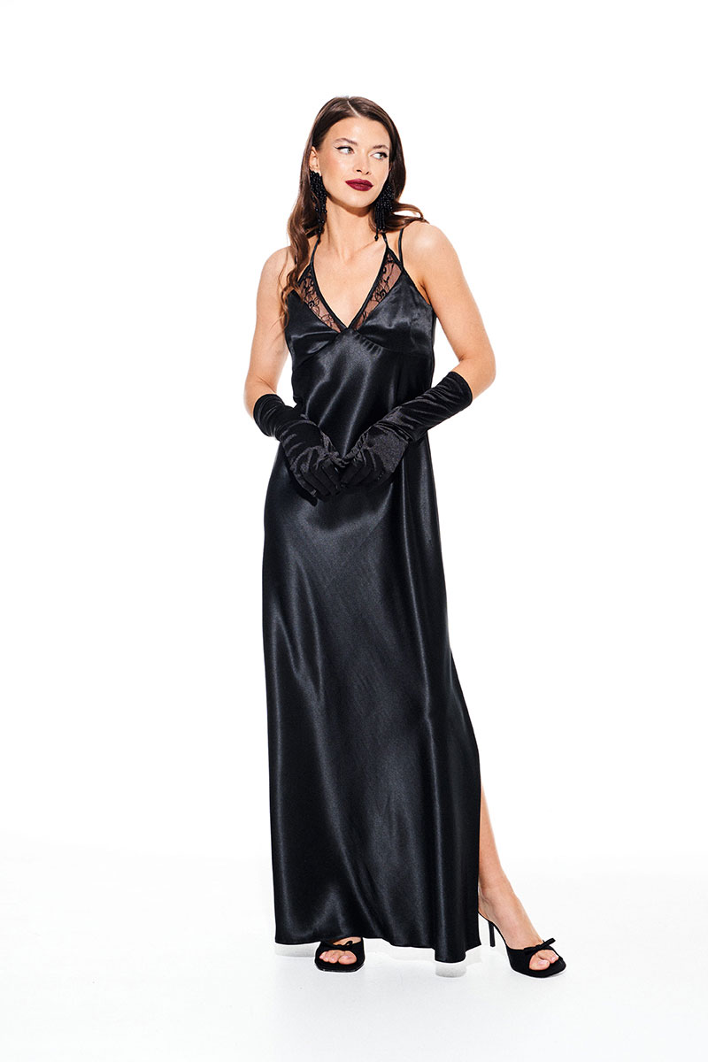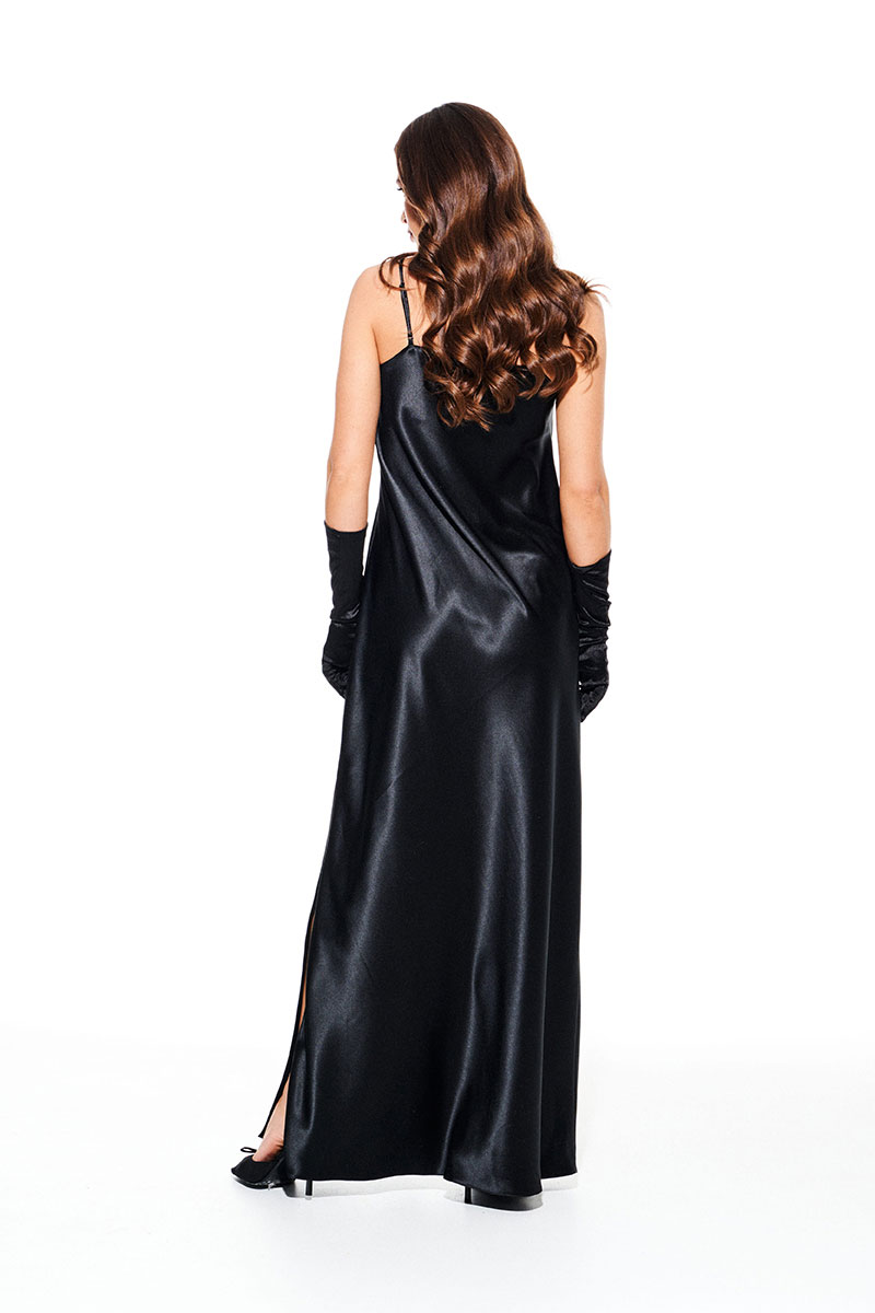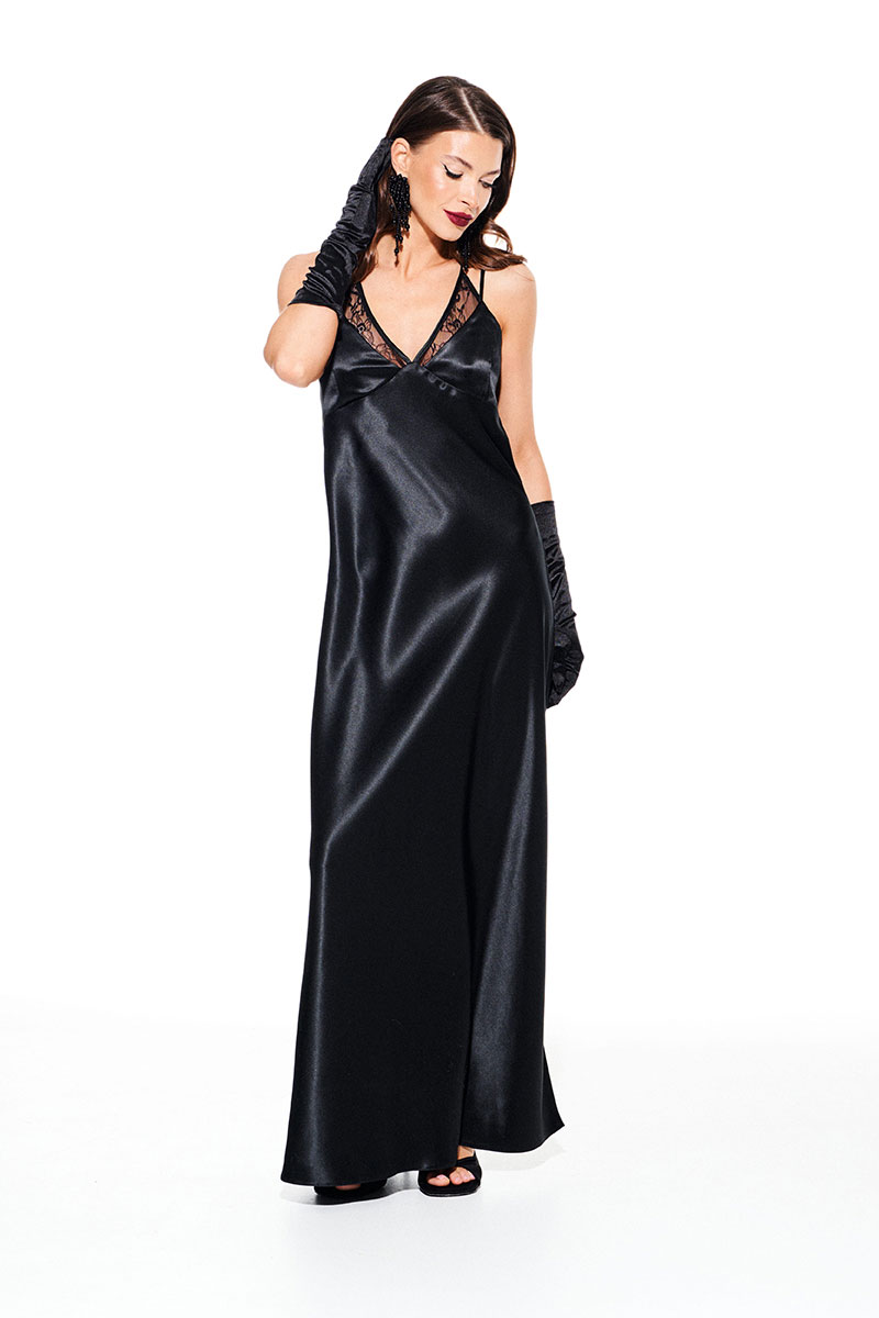 Платье полуприлегающего силуэта с акцентным лифом на регулируемых бретелях. Верхняя часть переда с чашками треугольной формы и нагрудными вытачками. Нижние чашки с вставками из кружева. Спинка цельная. В левом боковом шве выполнен разрез. Длина – макси.