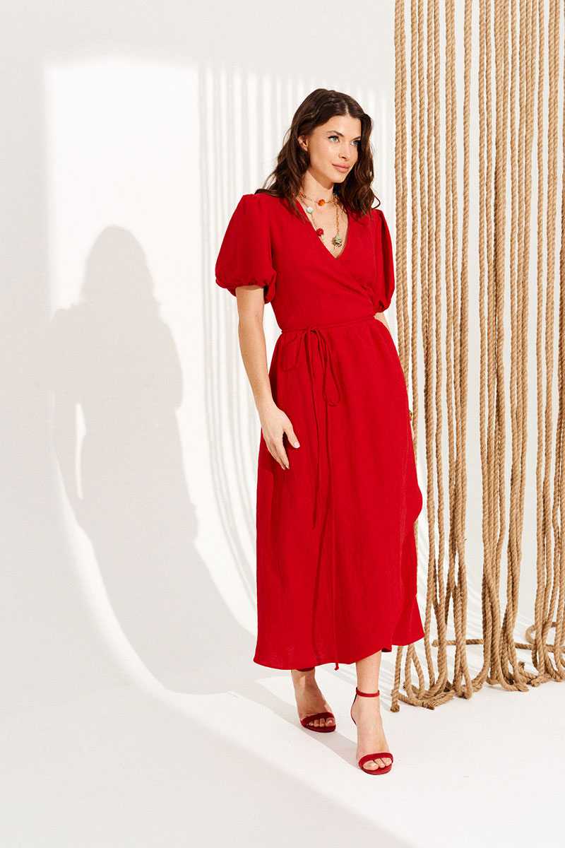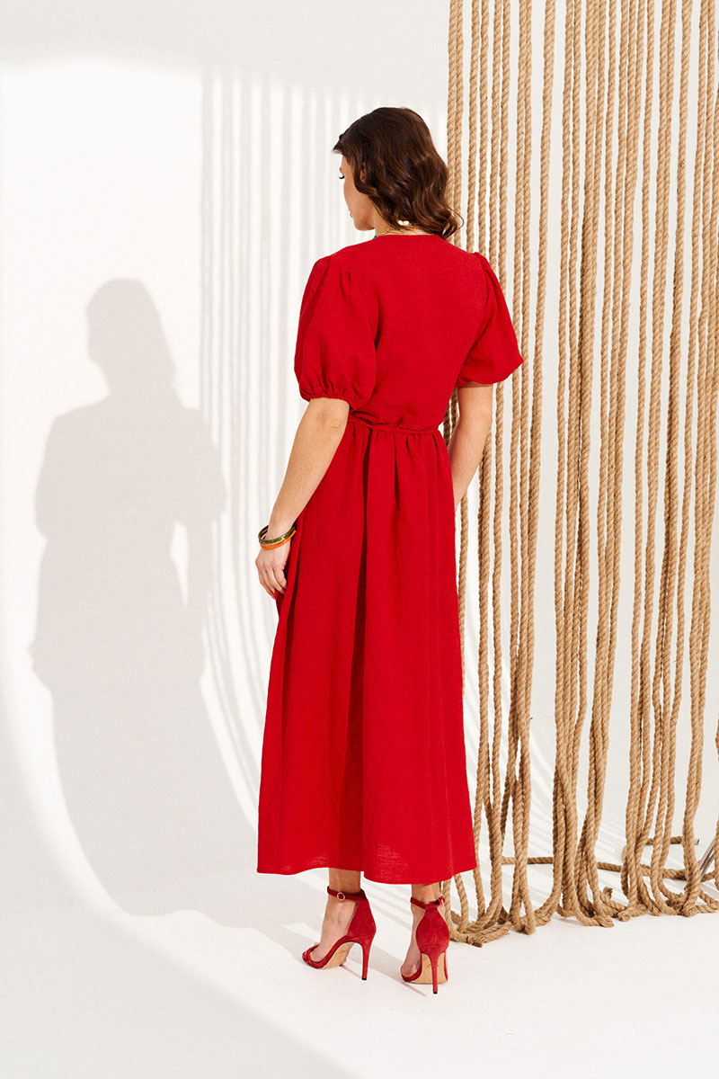 Платье умеренного объема, приталенного силуэта, расклешенное книзу, отрезное по линии талии, с запахом на завязках и V-образным вырезом горловины. Верхние детали переда с талиевыми вытачками. Нижняя часть переда и спинки со сборкой по верхнему срезу. Приталенность регулируется завязками. Рукав втачной, короткий, со сборкой по верхнему и нижнему срезу. Нижний срез рукава на резинке.