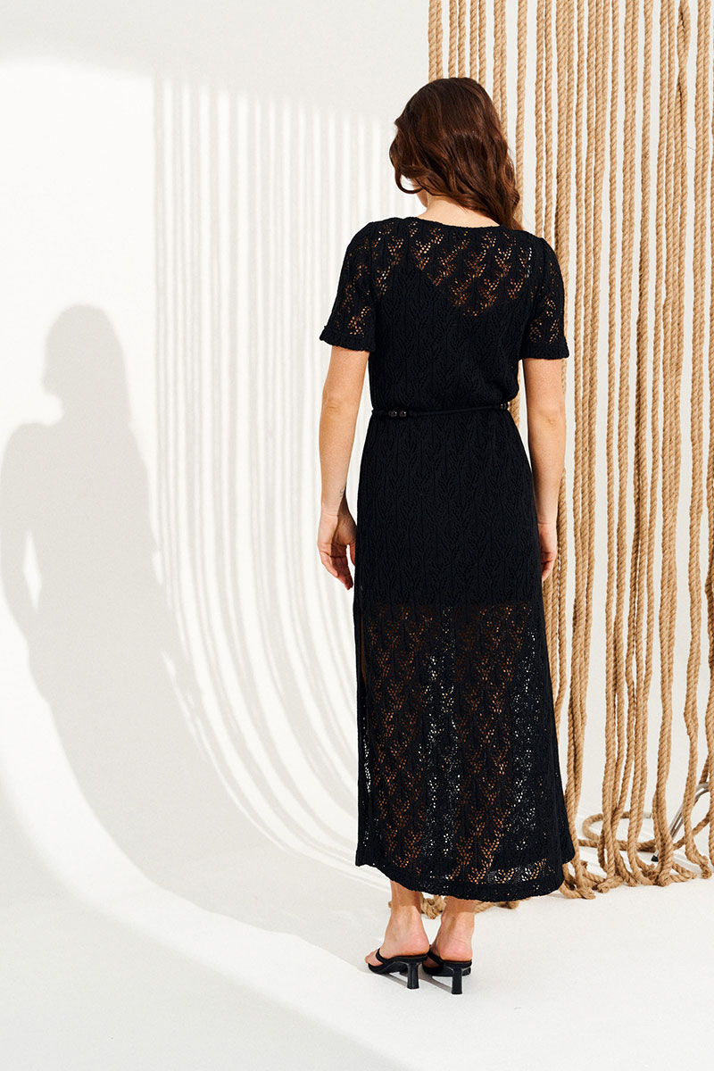 Платье из трикотажного полотна, умеренного объема, полуприлегающего силуэта, с круглым вырезом горловины. Вырез горловины обработан притачной обтачкой. Перед и спинка цельные. Левый боковой шов заканчивается разрезом. Рукав втачной, короткий. В комплекте декоративный пояс с бусинами. Нижнее платье умеренного объема, полуприлегающего силуэта, на регулируемых бретелях, с V-образным вырезом горловины. Перед с нагрудными вытачками.