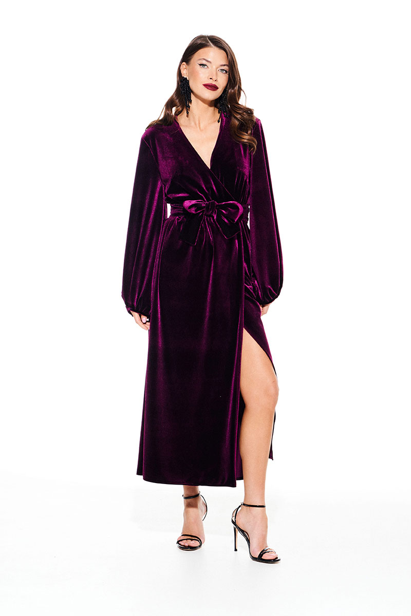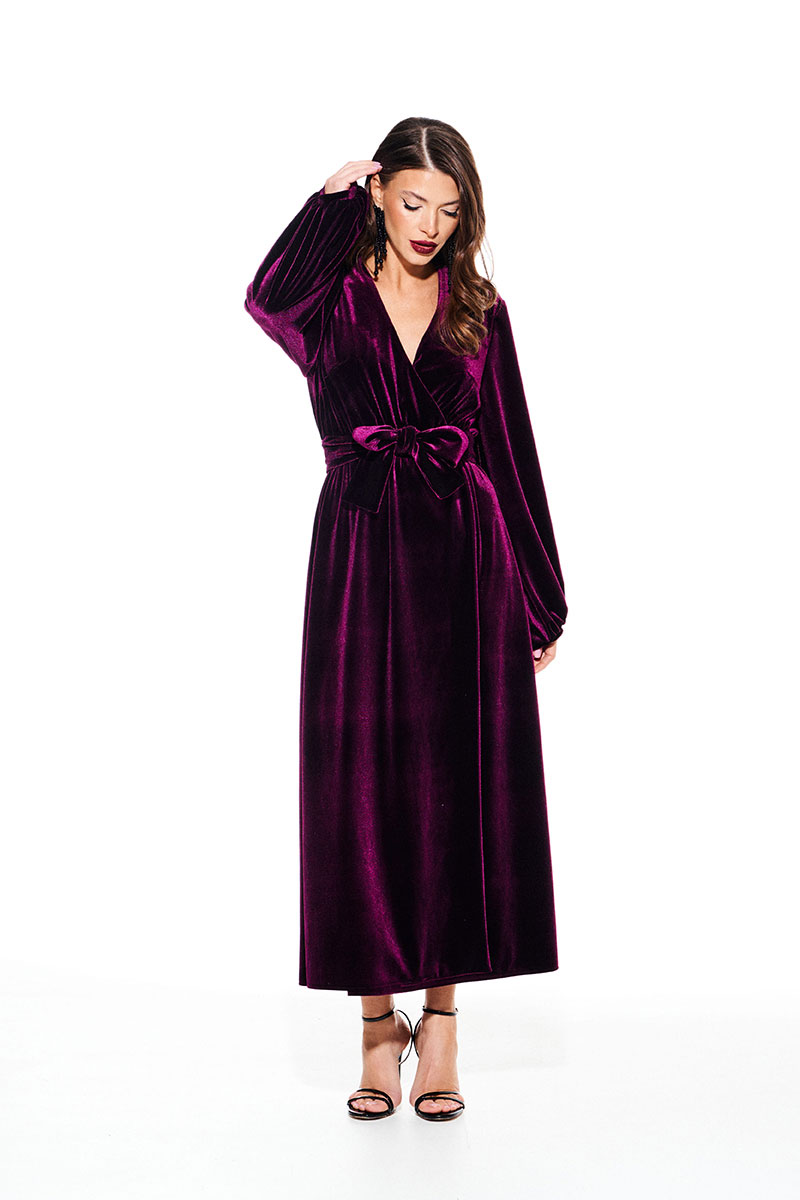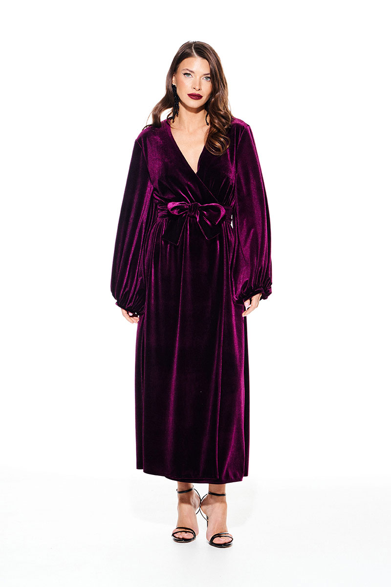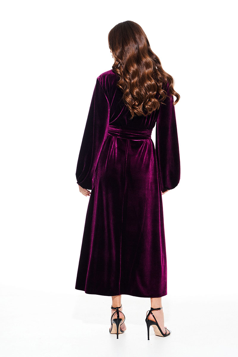 Платье из бархата на трикотажной основе, приталенного силуэта, с отрезным поясом на резинке, частично на подкладке. Лиф и нижняя часть переда с запахом. Лиф с нагрудными вытачками. Спинка со средним швом. Платье со съемным поясом из основной ткани.