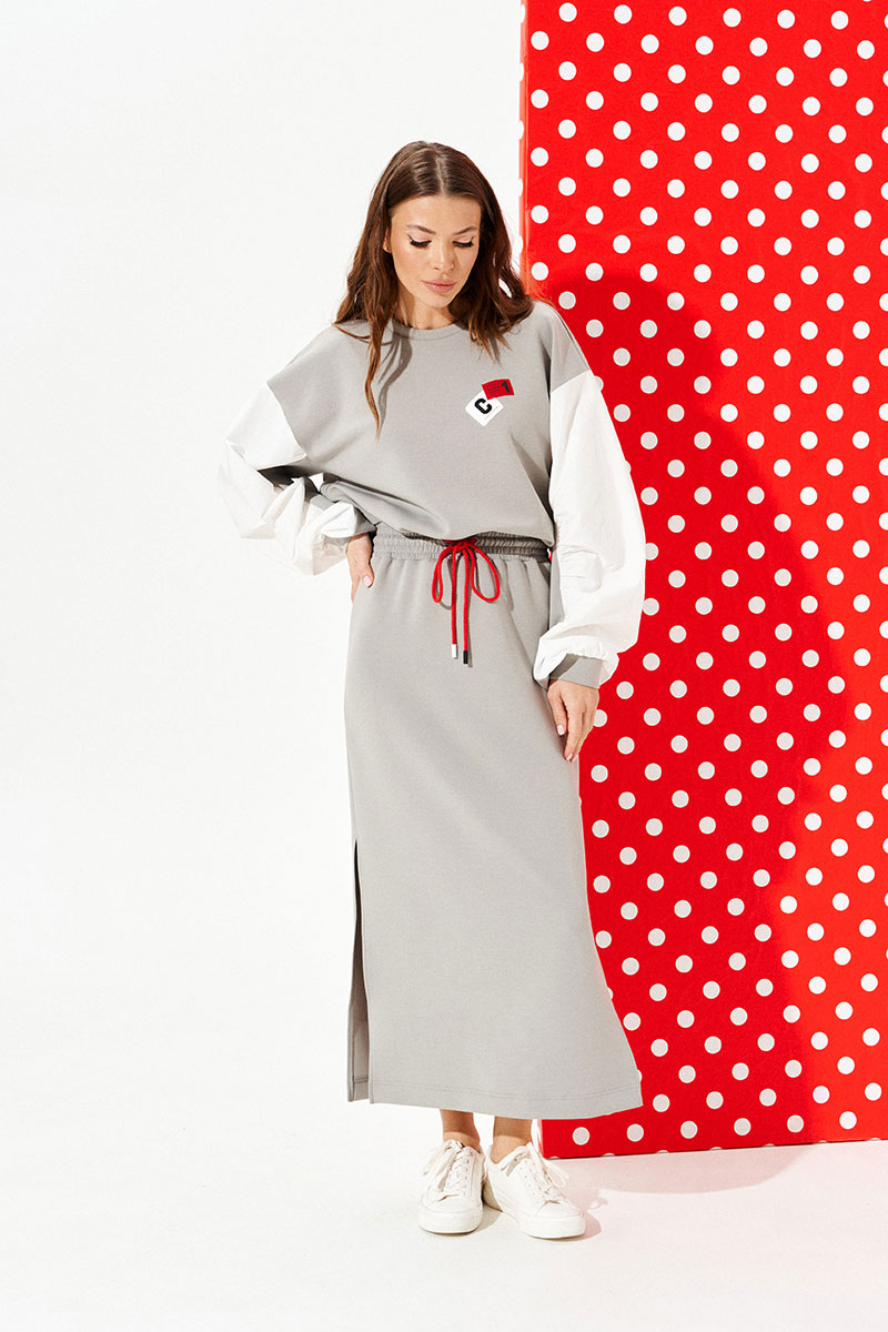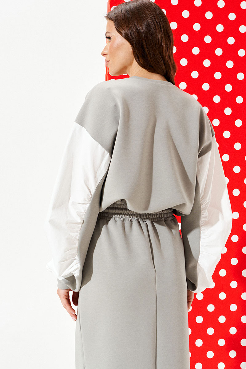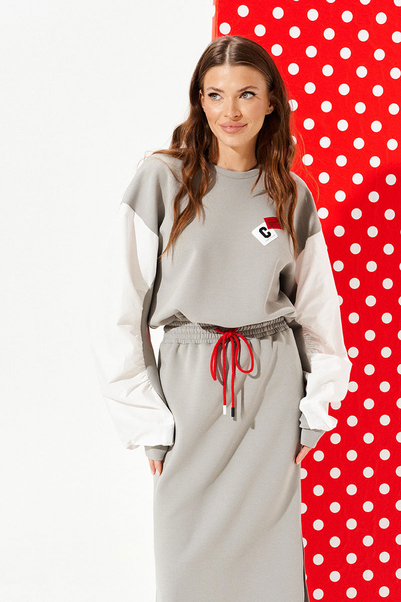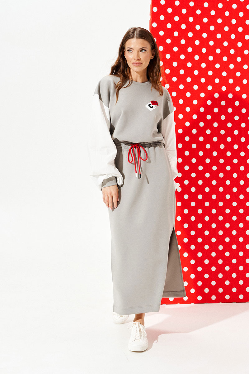 Платье из трикотажного полотна умеренного объема, приталенного силуэта, отрезное по линии талии, с круглым вырезом горловины. Верхняя деталь переда декорирована двумя настрочными нашивками. Нижняя деталь спинки со средним швом. Боковые швы заканчиваются разрезами. Пояс притачной, на резинке. По поясу проложены отделочные строчки, образующие кулиску, в которую продет декоративный шнур-завязка с наконечниками. Рукав втачной, трехшовный, длинный. Рукав со вставкой из контрастной ткани со сборкой по швам притачивания детали к рукаву. Нижний срез рукава обработан манжетой.