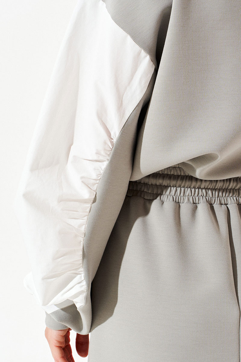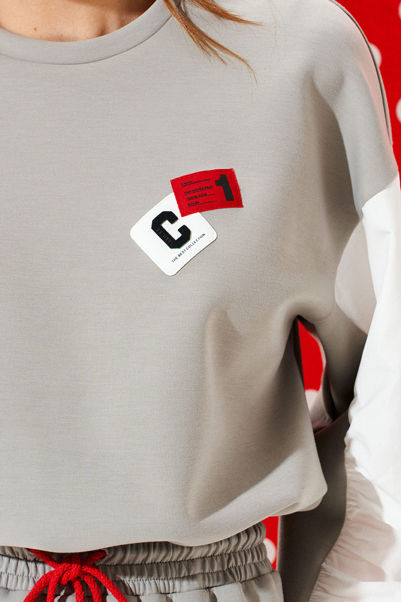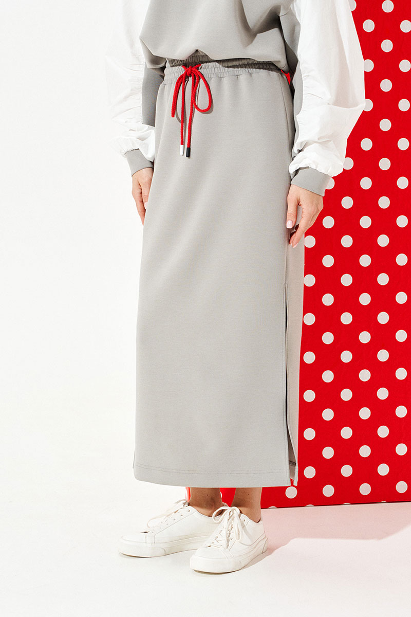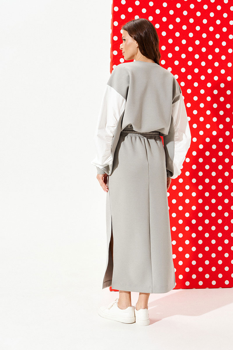 Платье из трикотажного полотна умеренного объема, приталенного силуэта, отрезное по линии талии, с круглым вырезом горловины. Верхняя деталь переда декорирована двумя настрочными нашивками. Нижняя деталь спинки со средним швом. Боковые швы заканчиваются разрезами. Пояс притачной, на резинке. По поясу проложены отделочные строчки, образующие кулиску, в которую продет декоративный шнур-завязка с наконечниками. Рукав втачной, трехшовный, длинный. Рукав со вставкой из контрастной ткани со сборкой по швам притачивания детали к рукаву. Нижний срез рукава обработан манжетой.
