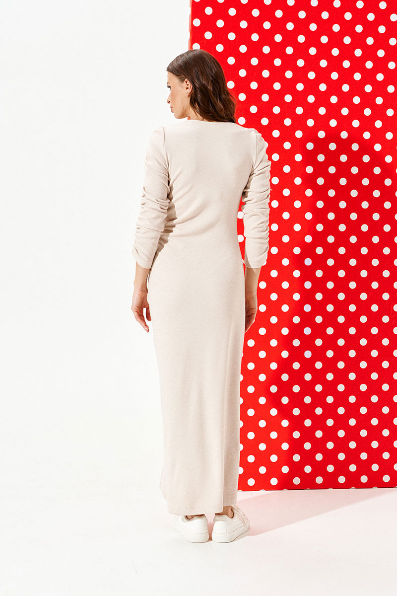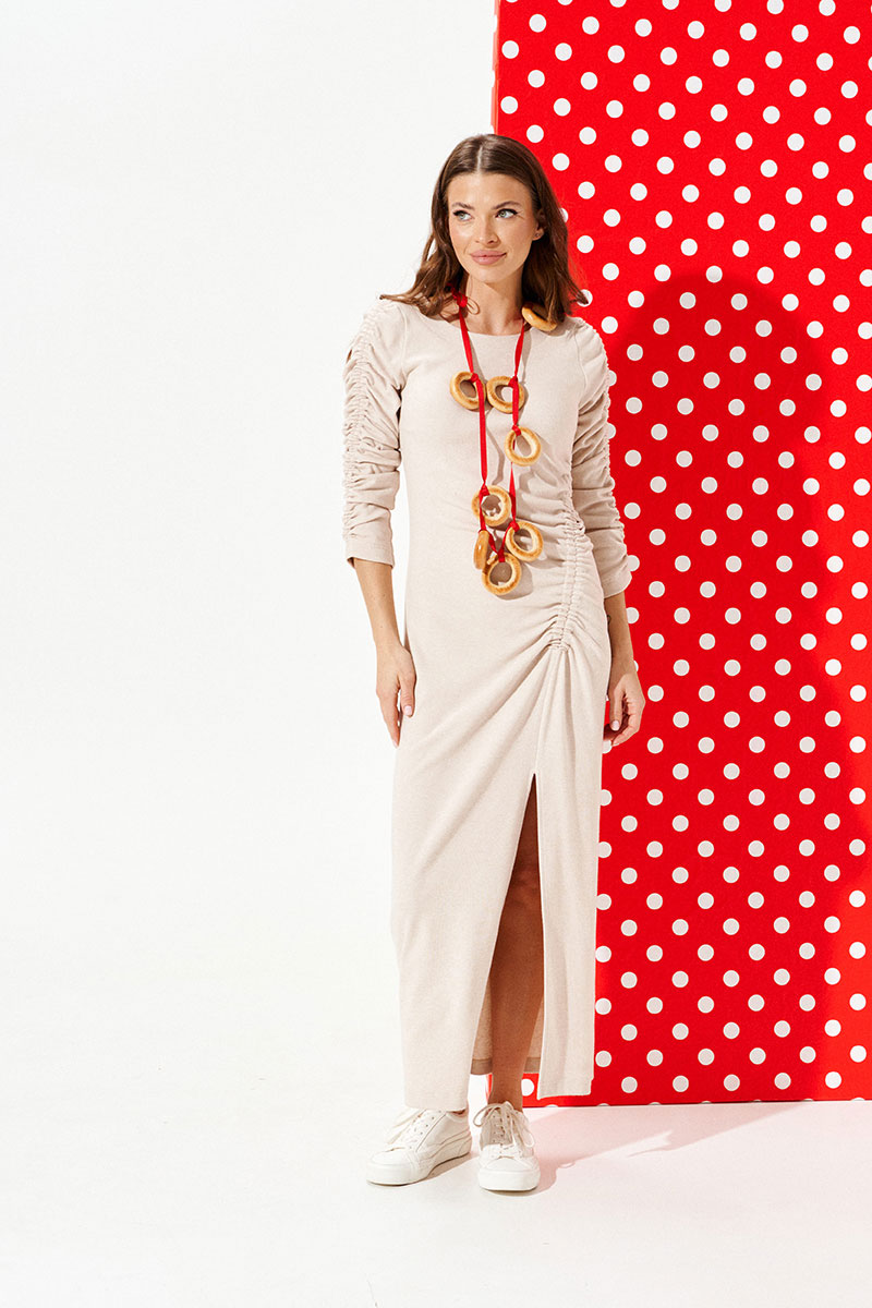 Платье из трикотажного полотна прилегающего силуэта с круглым вырезом горловины. Вырез горловины обработан обтачками и отделочной строчкой. Перед с нагрудными вытачками, рельефом со сборкой на резинку и разрезом. Спинка цельная. Рукав втачной, двухшовный, со сборкой на резинку.