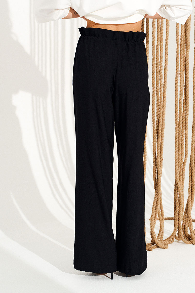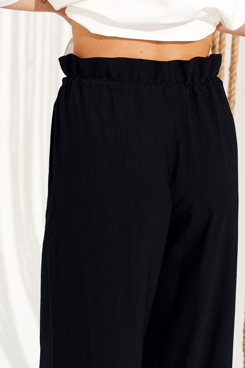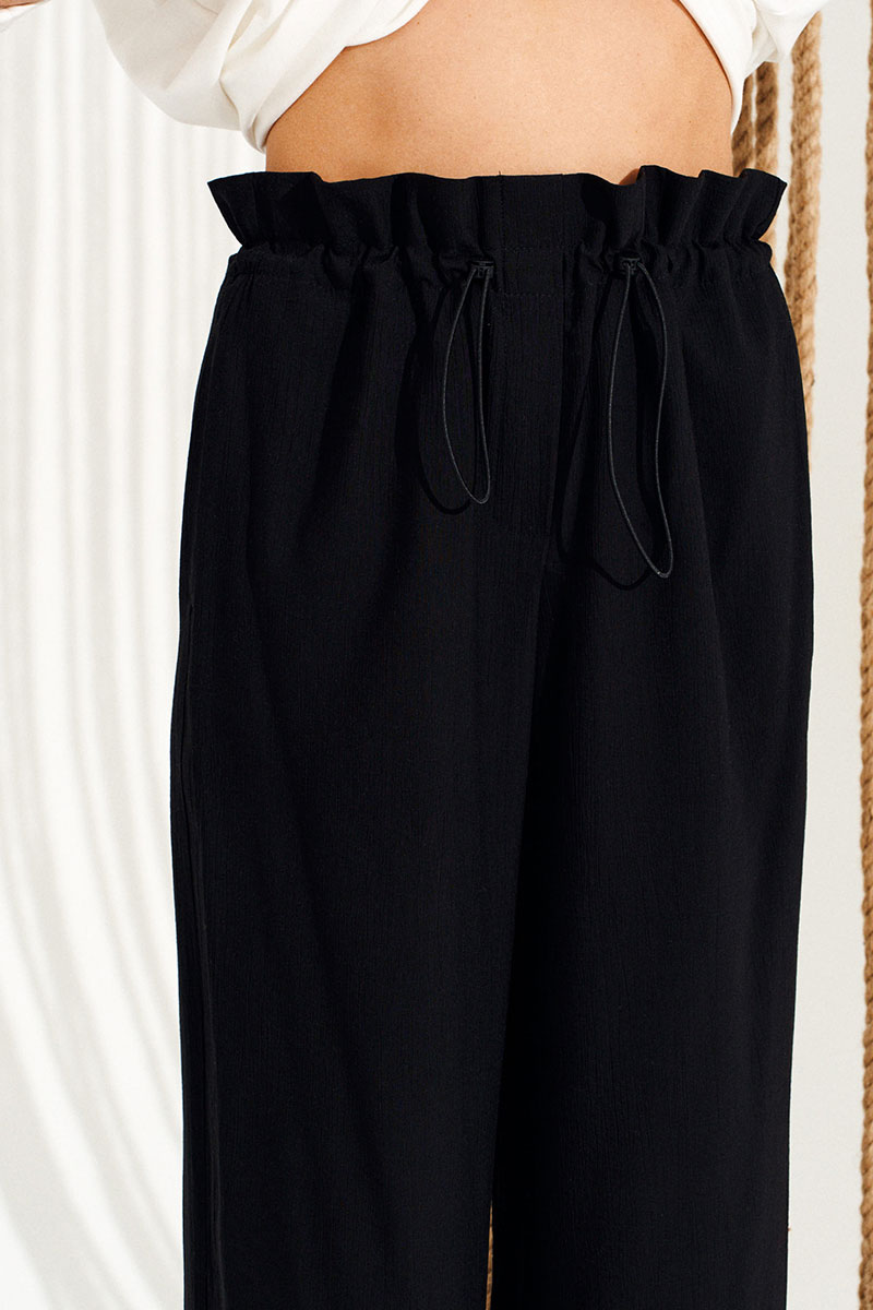 Брюки свободного объема, прямого силуэта. Перед с имитацией гульфика. Пояс цельнокроеный, с отделочными строчками, образующими кулиску, в которую продет эластичный шнур с фиксаторами. Для регулировки объема нижний срез оформлен кулиской с эластичным шнуром и фиксатором.