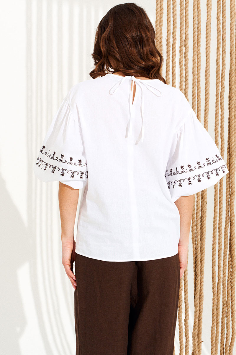 Блуза умеренного объема, прямого силуэта, с круглым вырезом горловины. Горловина обработана окантовкой, переходящей в завязки на спинке. Спинка со средним швом. Рукав втачной, одношовный, короткий, с вышивкой «Тесьма». Нижний срез рукава обработан притачной манжетой.