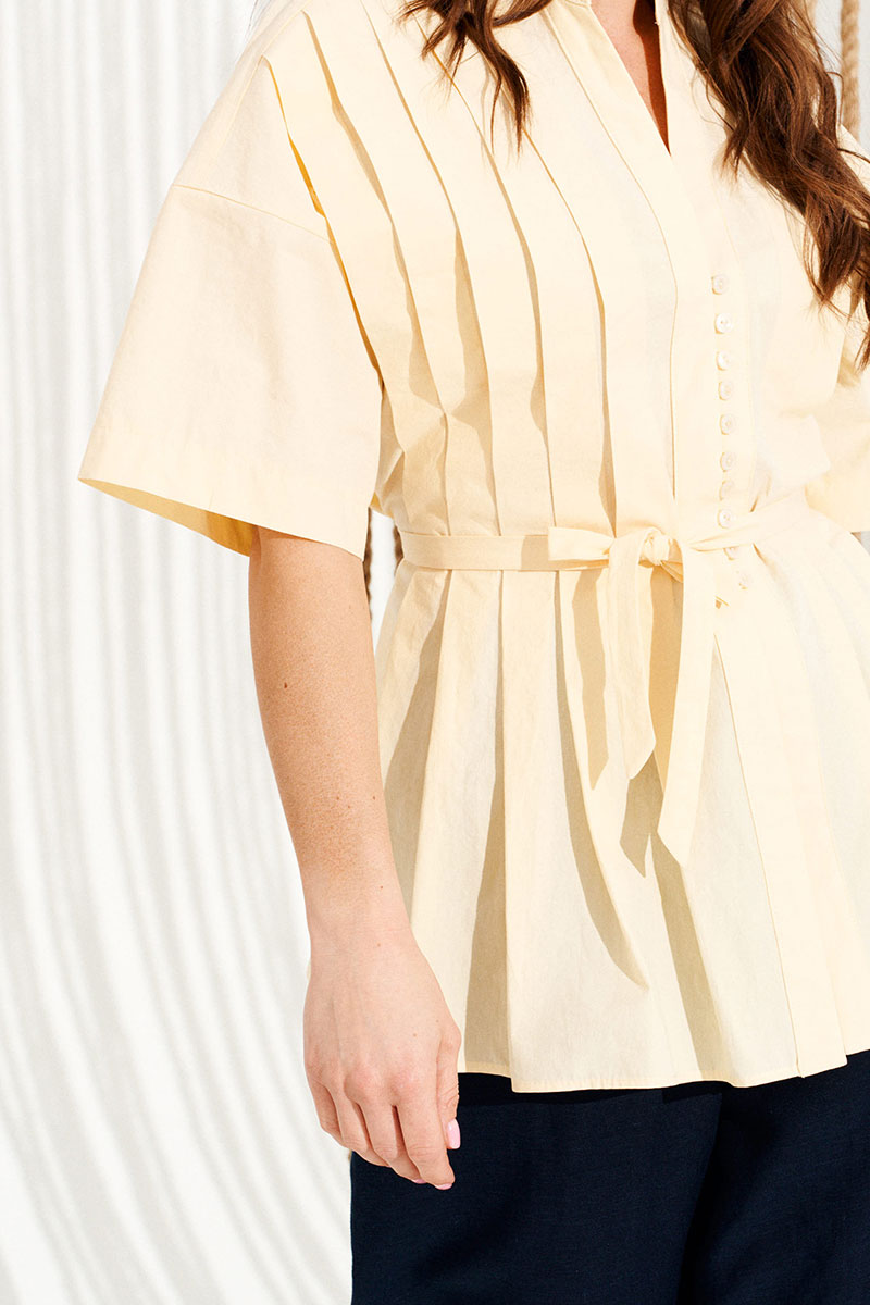 Блузка умеренного объема, приталенного силуэта, с центральной застежкой на навесные петли и пуговицы. Воротник-стойка. Детали переда с односторонними складками от плечевого шва. Спинка цельная. Для регулировки приталенности в боковые швы вставлены пояски-завязки. Боковые швы заканчиваются разрезами. Рукав втачной, короткий.