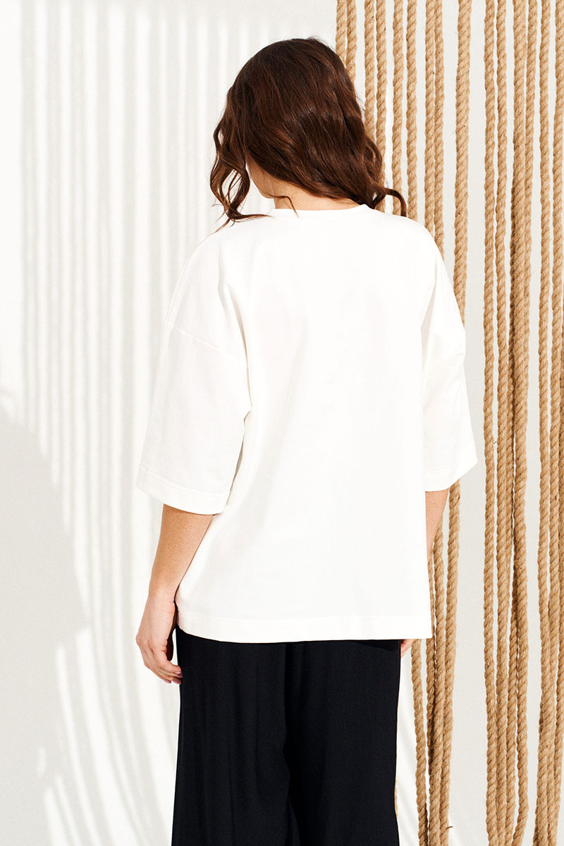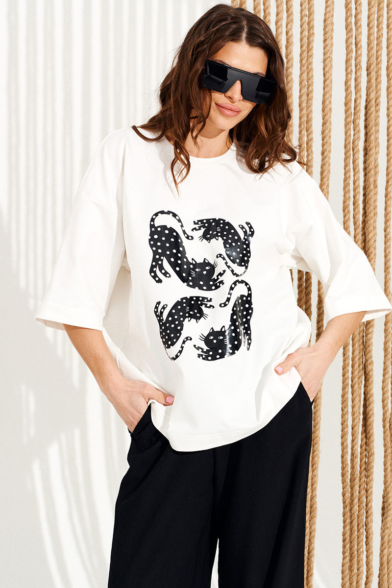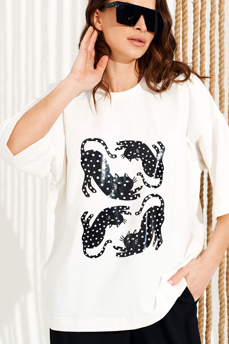 Джемпер из трикотажного полотна свободного объема, прямого силуэта, с круглым вырезом горловины.Перед и спинка цельные. Вырез горловины обработан притачной обтачкой. По переду выполнена печать «Котики». Рукав втачной, одношовный, короткий.