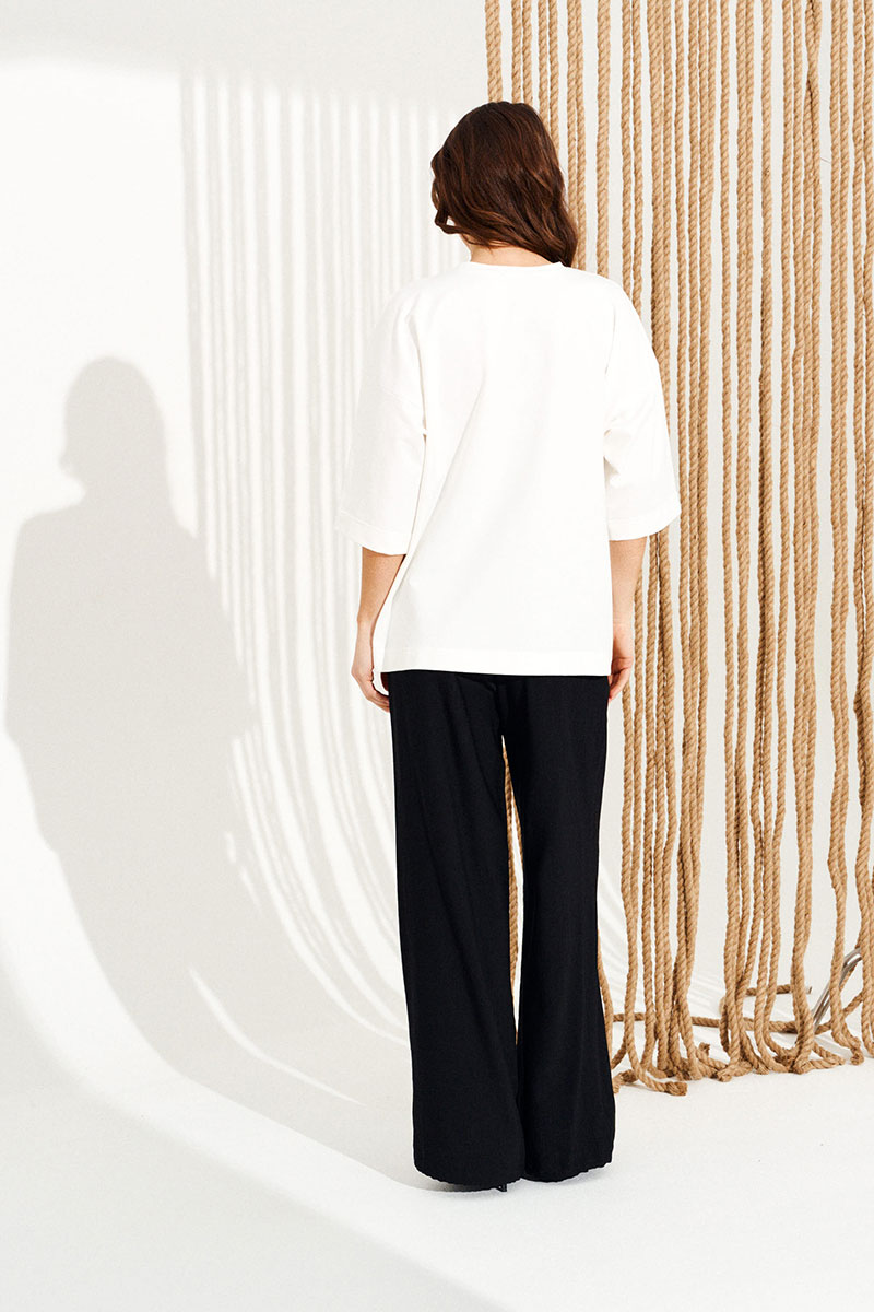 Джемпер из трикотажного полотна свободного объема, прямого силуэта, с круглым вырезом горловины. Вырез горловины обработан притачной обтачкой. Перед и спинка цельные. По переду выполнена печать «Яблоко». Рукав втачной, одношовный, короткий.