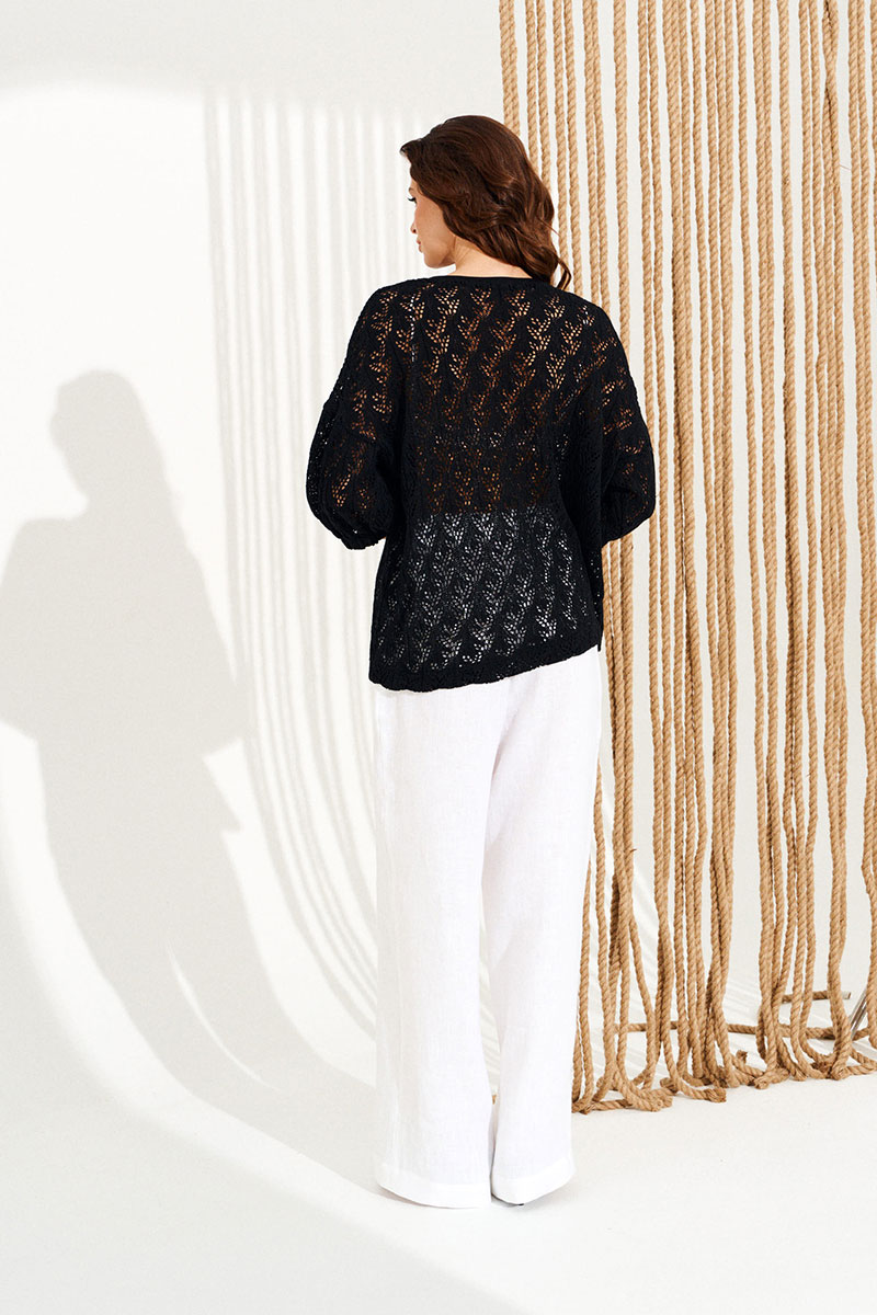 Джемпер из трикотажного полотна свободного объема, прямого силуэта, с круглым вырезом горловины. Вырез горловины обработан притачной обтачкой. Перед с вышивкой-аппликацией «Ромашка». Рукав втачной, короткий, с притачной манжетой со сборкой на резинку.