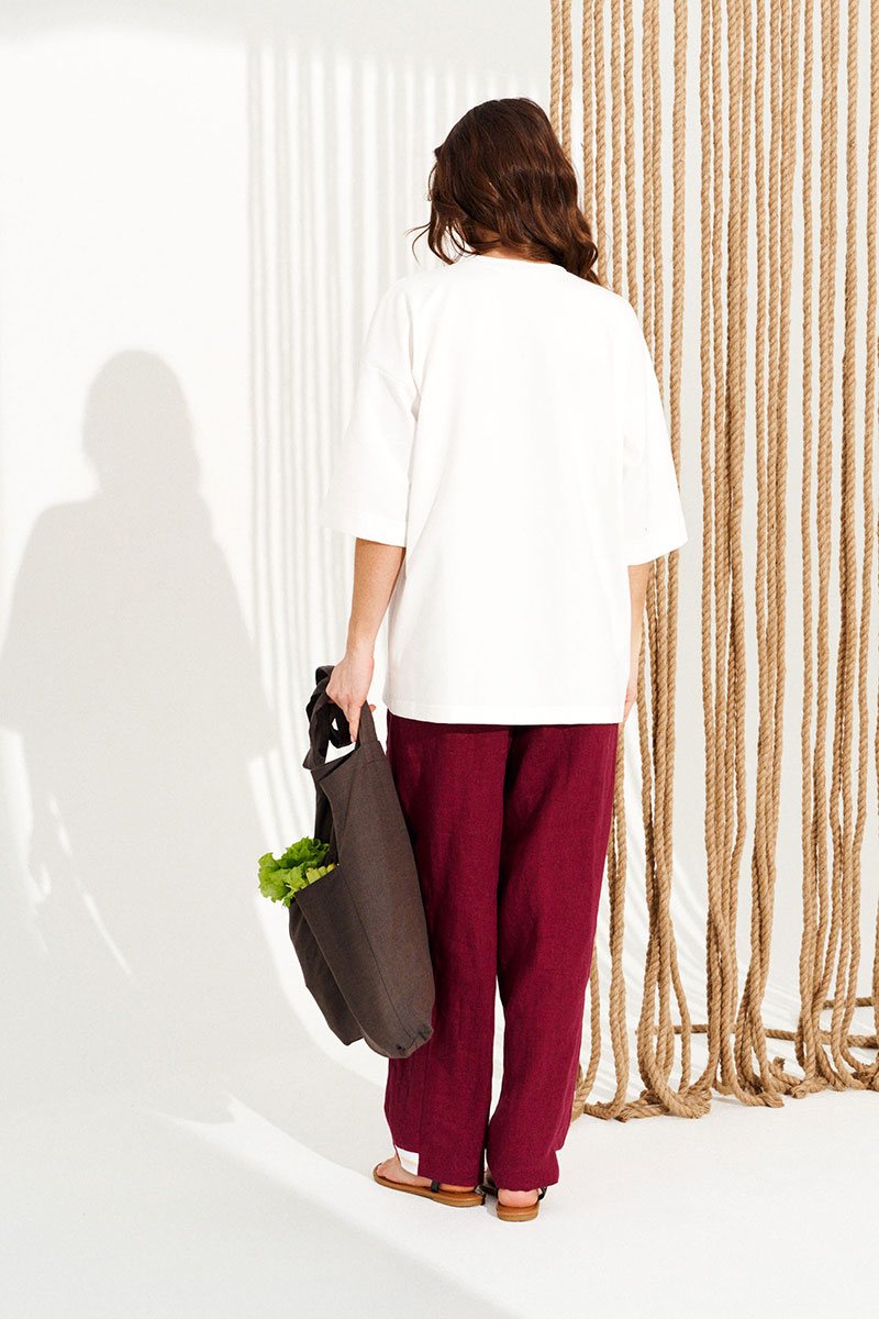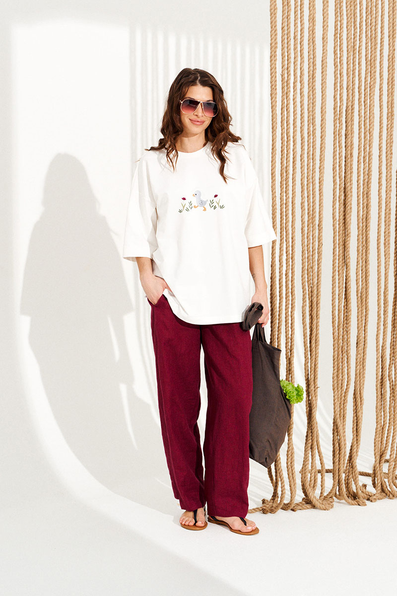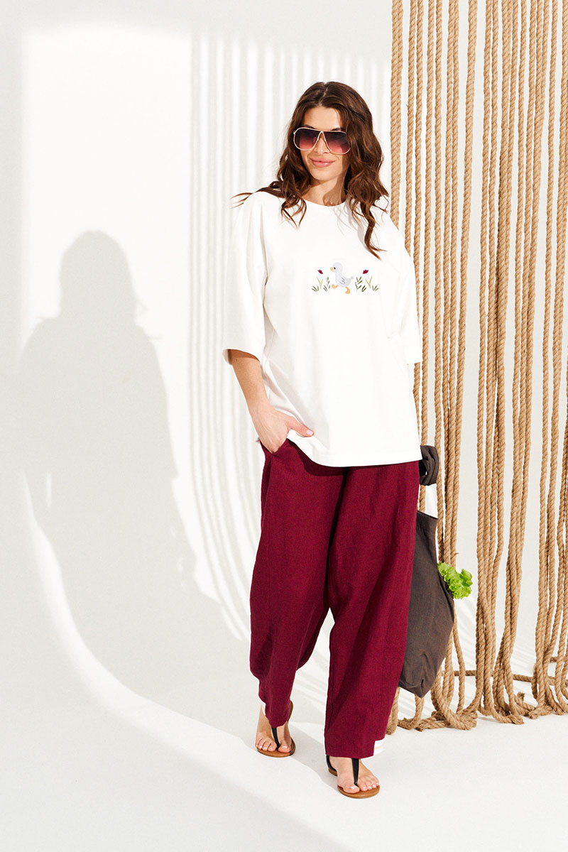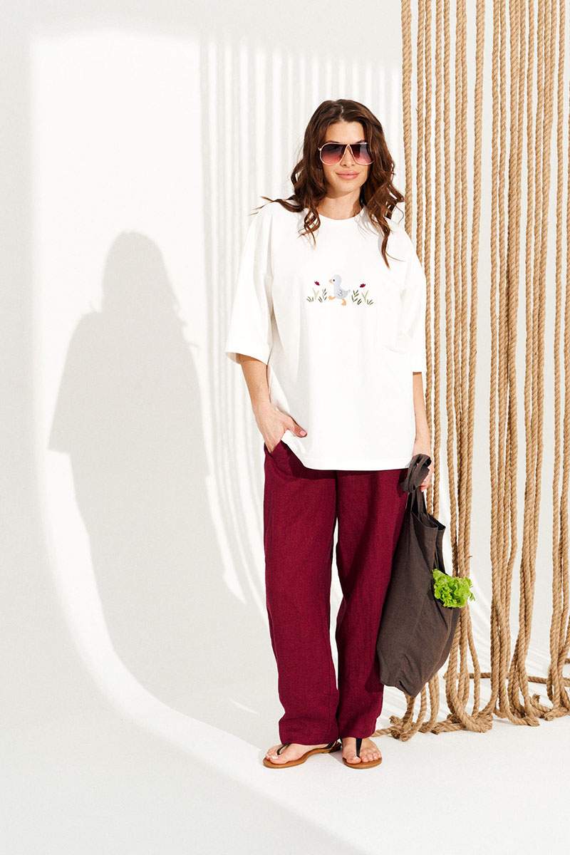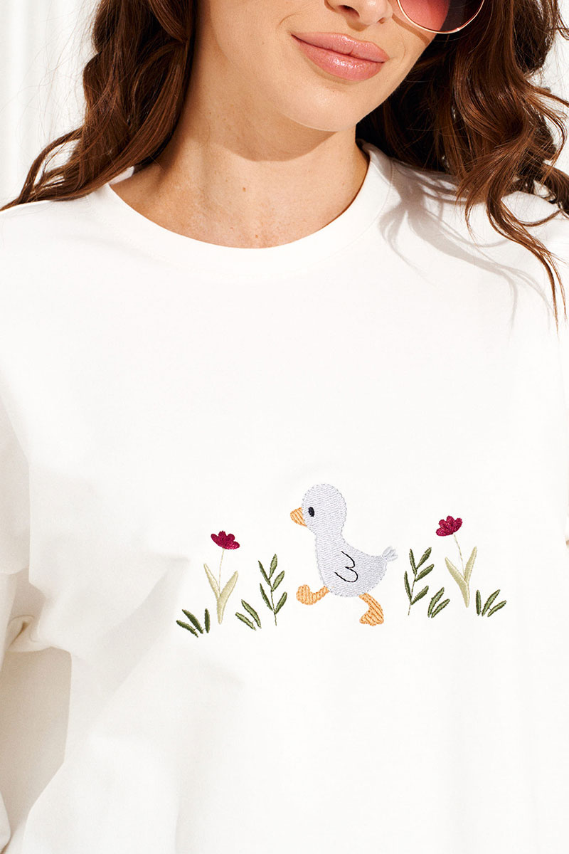 Джемпер из трикотажного полотна свободного объема, прямого силуэта, с круглым вырезом горловины. Вырез горловины обработан притачной обтачкой. Перед и спинка цельные. По переду выполнена вышивка «Утенок». Рукав втачной, одношовный, короткий.