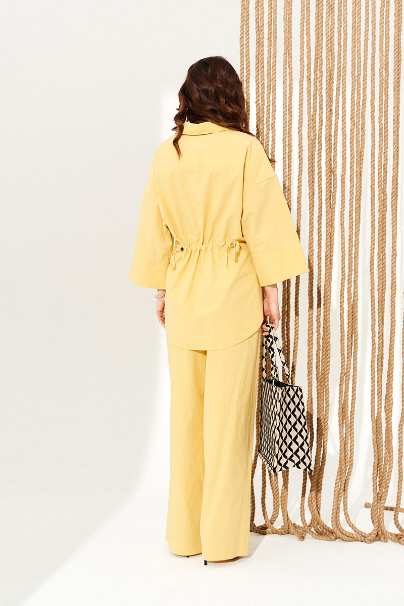 Костюм 2-х предметный, состоящий из блузки и брюк. Блузка свободного объема, прямого силуэта, с фигурной линией низа. Воротник стояче-отложной с отрезной стойкой. Перед с отрезными