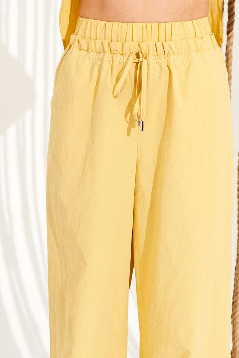 Брюки умеренного объема, прямого силуэта. На передних половинках выполнены боковые карманы с отрезным бочком. Верхний срез брюк оформлен кулиской, в которую продет шнур-завязка. Пояс