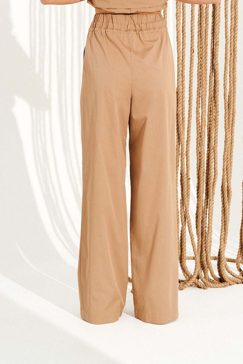 Комплект 2-х предметный, состоящий из блузки и брюк. Блузка свободного объема, прямого силуэта, с центральной застежкой на петли и пуговицы. Воротник-стойка. Линия талии оформлена кулиской с поясками и фиксаторами для регулировки прилегания. Детали переда с накладными карманами и клапанами. Спинка цельная. Рукав втачной, короткий. Брюки умеренного объема, прямого силуэта. На передних половинках выполнены боковые карманы с отрезным бочком. Верхний срез брюк оформлен кулиской, в которую продет шнур-завязка. Пояс притачной, на резинке, оформлен рюшей.