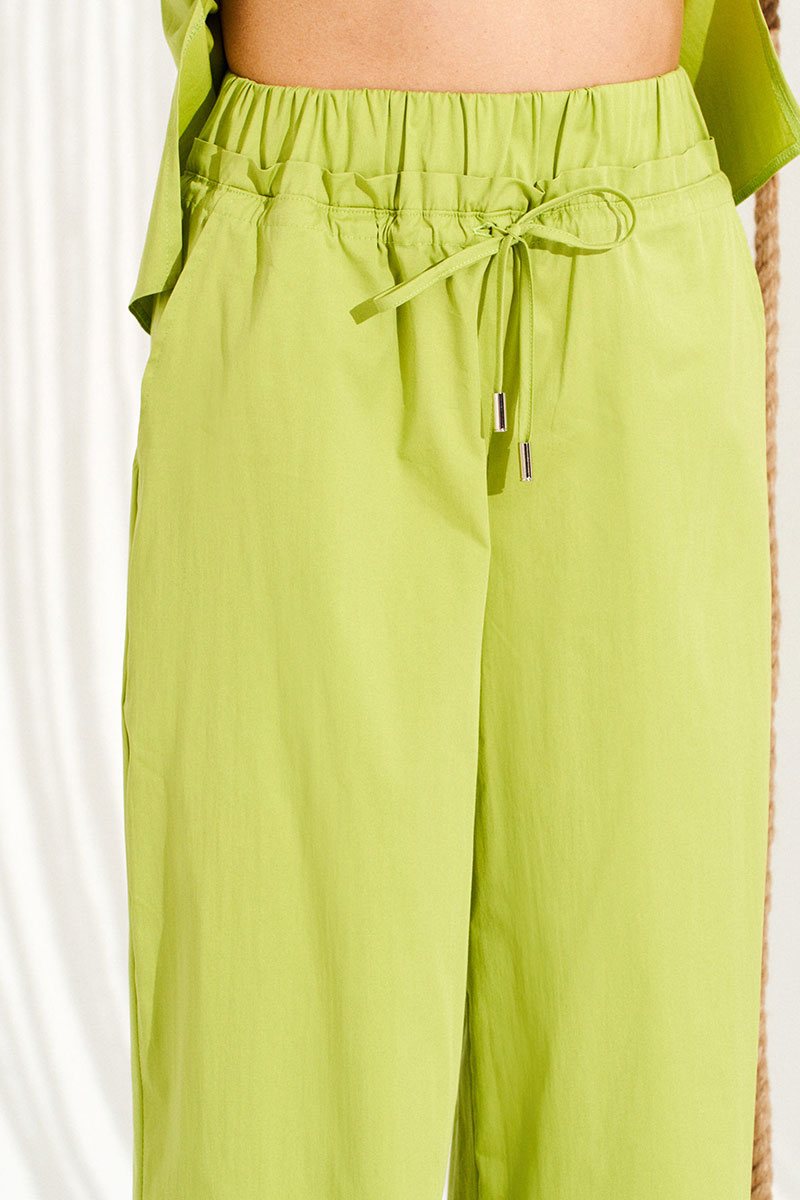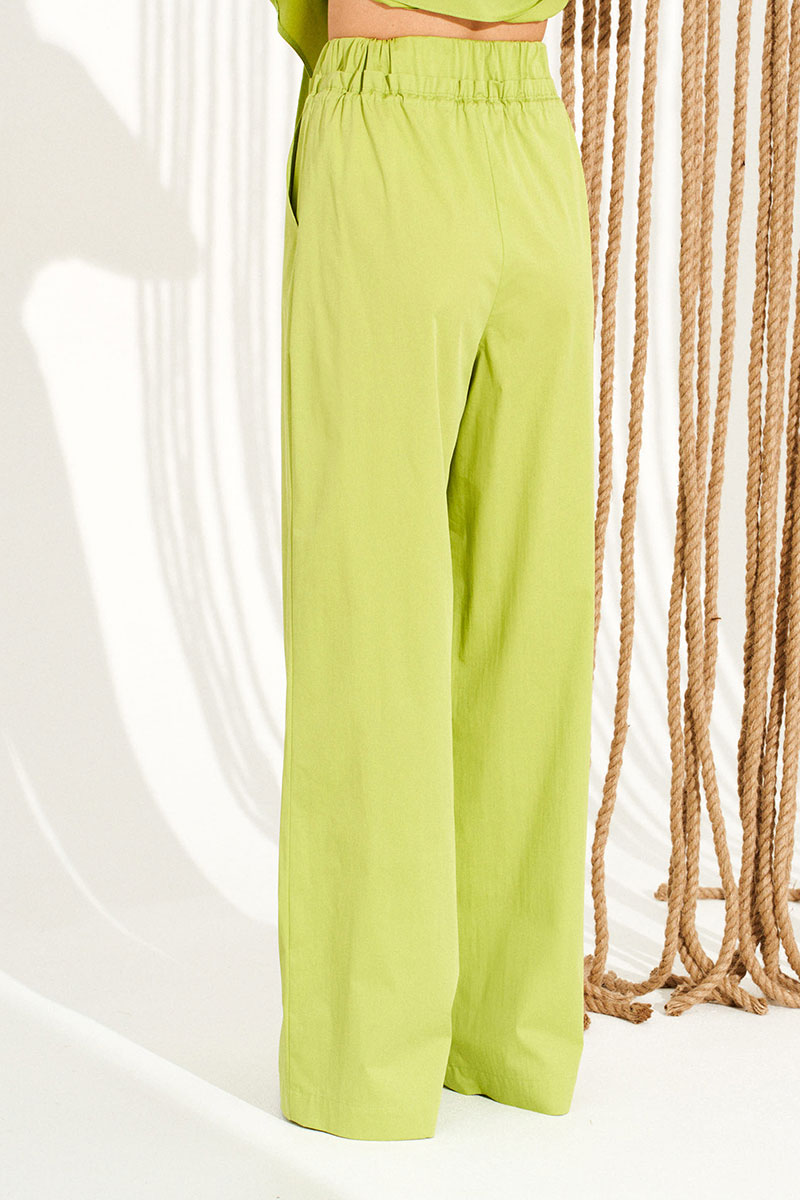Комплект 2-х предметный, состоящий из блузки и брюк. Блузка свободного объема, прямого силуэта, с центральной застежкой на петли и пуговицы. Воротник-стойка. Линия талии оформлена кулиской с поясками и фиксаторами для регулировки прилегания. Детали переда с накладными карманами и клапанами. Спинка цельная. Рукав втачной, короткий. Брюки умеренного объема, прямого силуэта. На передних половинках выполнены боковые карманы с отрезным бочком. Верхний срез брюк оформлен кулиской, в которую продет шнур-завязка. Пояс притачной, на резинке, оформлен рюшей.