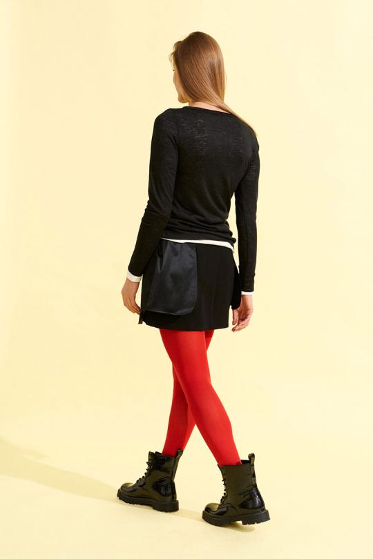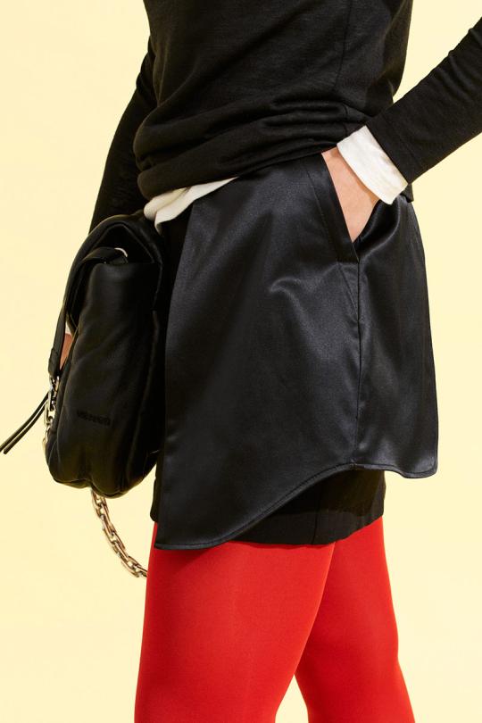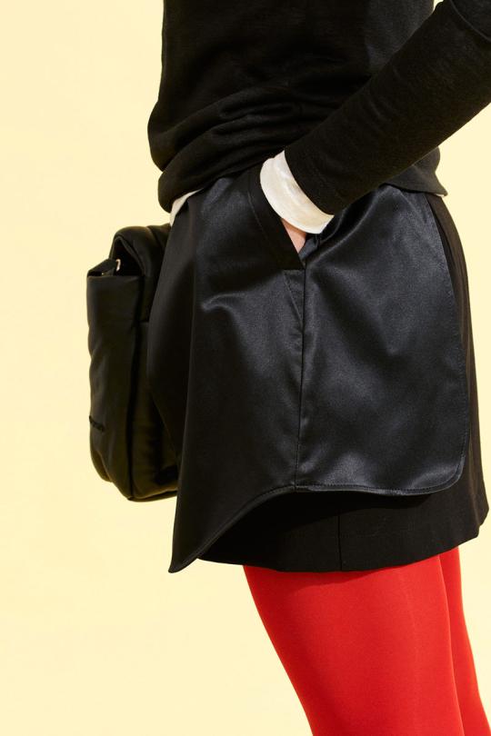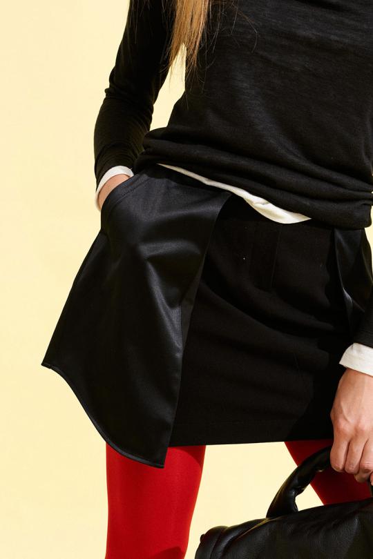 Юбка женская прямая короткая из костюмной ткани с декоративными боковыми отлетными деталями из атласа, по переду на которых выполнены карманы у боковых швов с отрезными бочками. Переднее полотнище со средним швом,в котором выполнена застежка на молнию с гульфиком и откоском. Заднее полотнище со средним швом. Пояс притачной, застегивается на пуговицу.