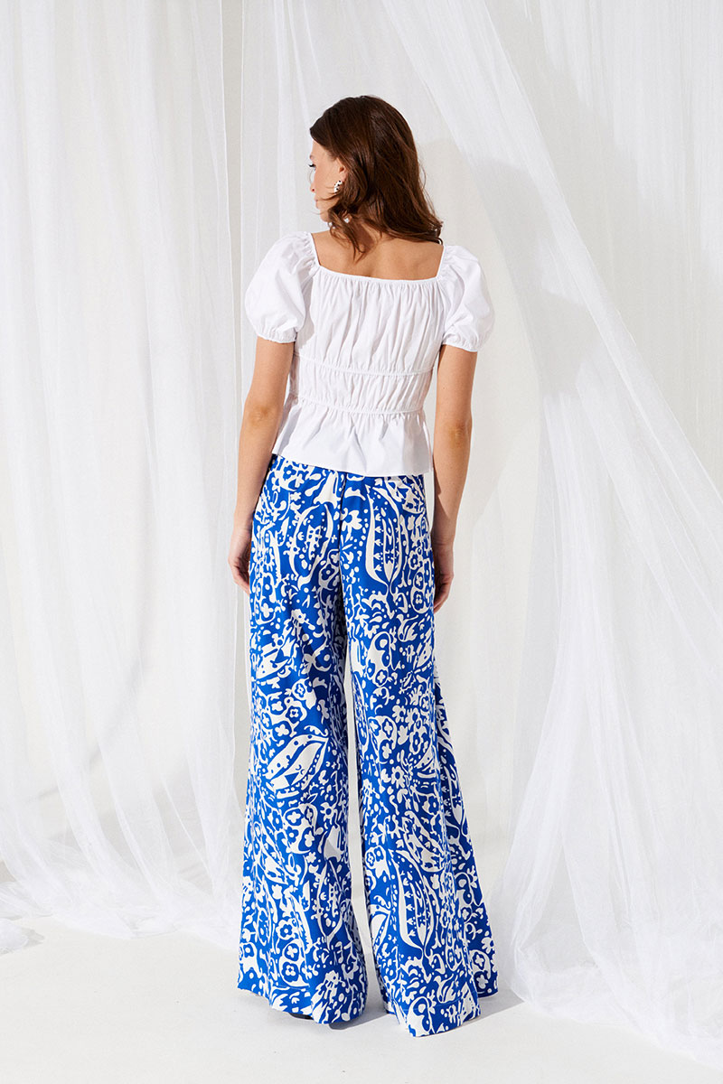 Брюки с разрезами, широкие, длинные, с поясом из декоративной резинки и застежкой в боковом шве на потайную молнию. По переду складки и боковые карманы с отрезным бочком. Передние половинки брюк состоят из двух частей, в швах — высокие разрезы. На задних половинках брюк выполнены талиевые вытачки.
