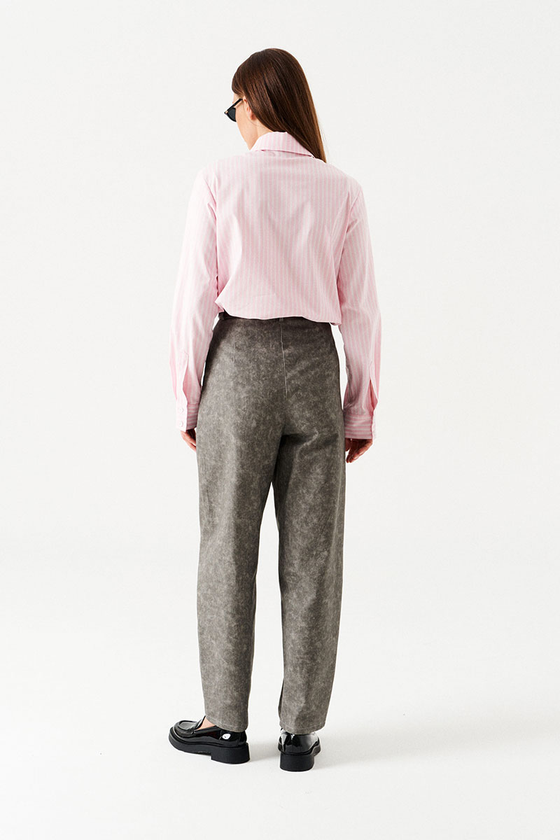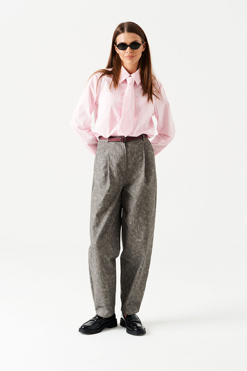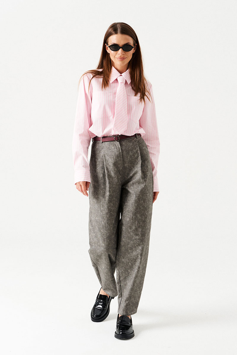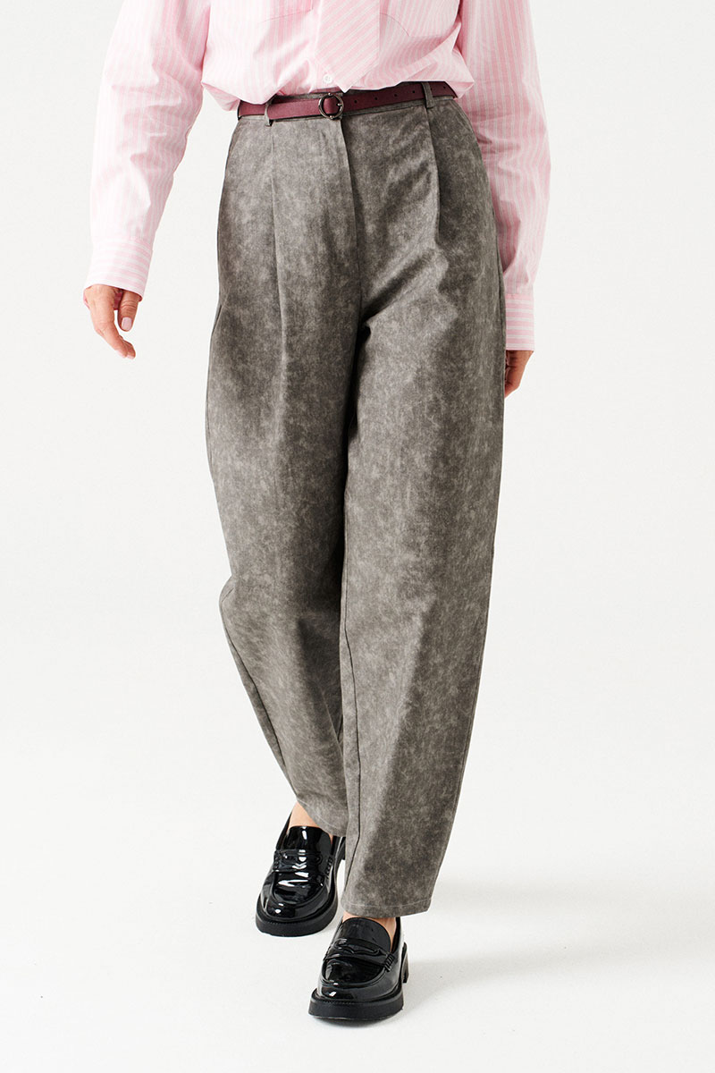 Брюки-бананы женские, свободные, слегка зауженные книзу. На передних половинках заложены складки, направленные в сторону боковых швов, боковые карманы с отрезным бочком. Застежка брюк – гульфик на молнии. На задних половинках талиевые вытачки. Пояс притачной со шлевками, застегивается на пуговицу.