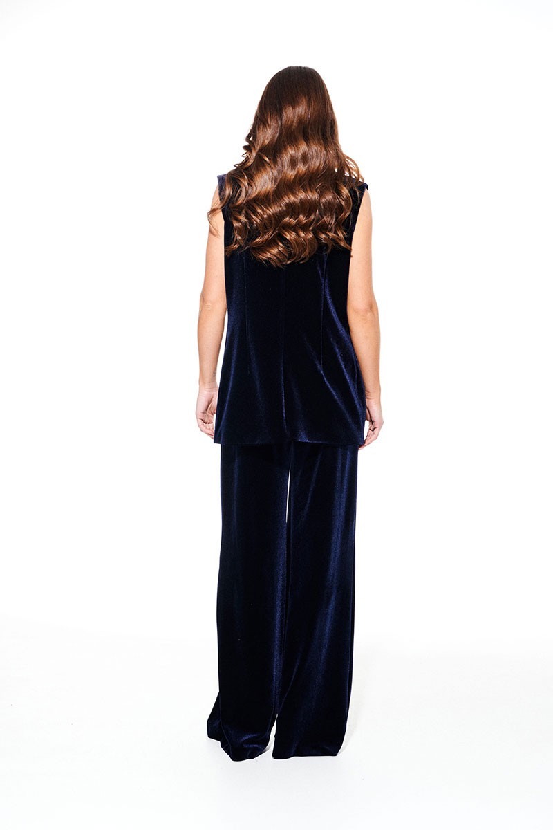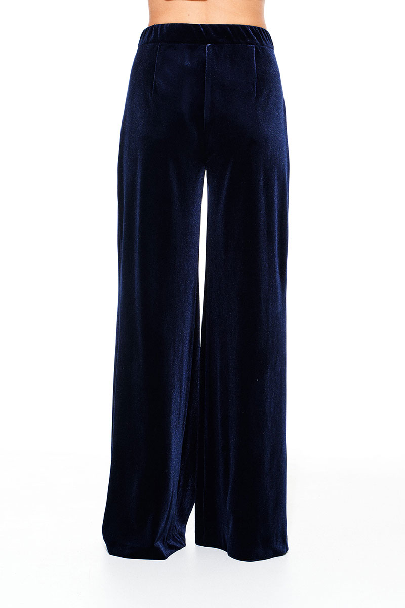 Брюки из бархата на трикотажной основе, свободного объема, расширенные к низу. На передних половинках выполнены боковые карманы с отрезным бочком и встречные складки. На задних половинках талиевые вытачки. Застежка – гульфик на молнии. Пояс притачной, с резинкой по спинке, застежкой на крючок и потайную пуговицу.