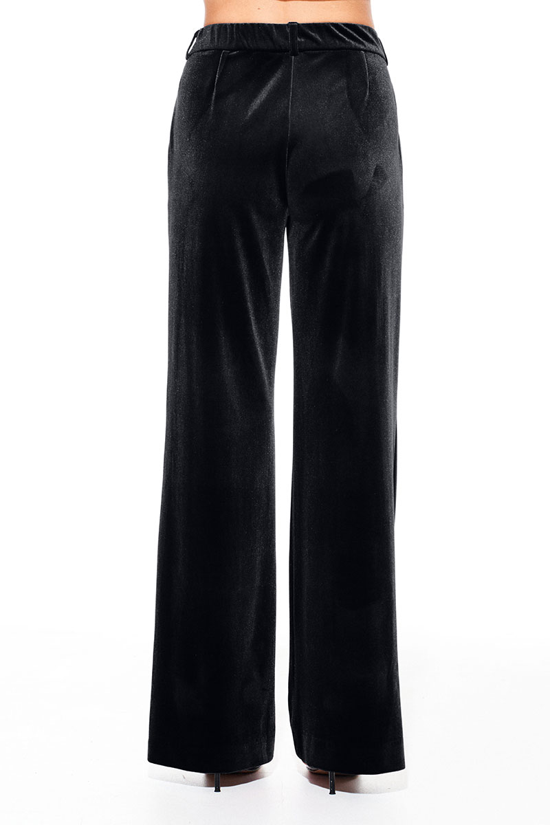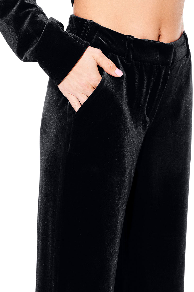 Брюки из бархата на трикотажной основе, умеренного объема, прямого силуэта. На передних половинках выполнены боковые карманы с отрезным бочком. Задние половинки с талиевыми вытачками. Застежка – гульфик на молнии. Пояс притачной, с резинкой по спинке, шлевками, застежкой на крючок и потайную пуговицу.