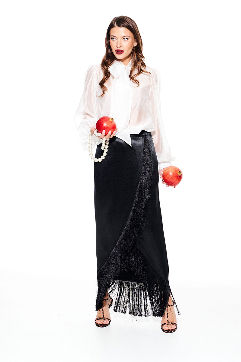 Юбка из струящейся ткани с блеском, прямого силуэта, с бахромой, застежкой на потайную молнию в левом боковом шве. Переднее полотнище с запахом. Заднее полотнище с талиевыми вытачками. Пояс притачной, с застежкой на 1 петлю и 1 пуговицу.