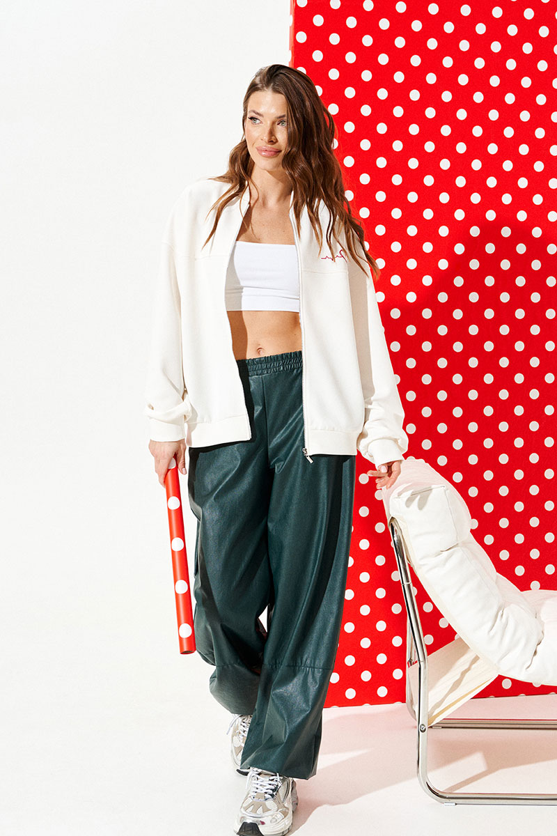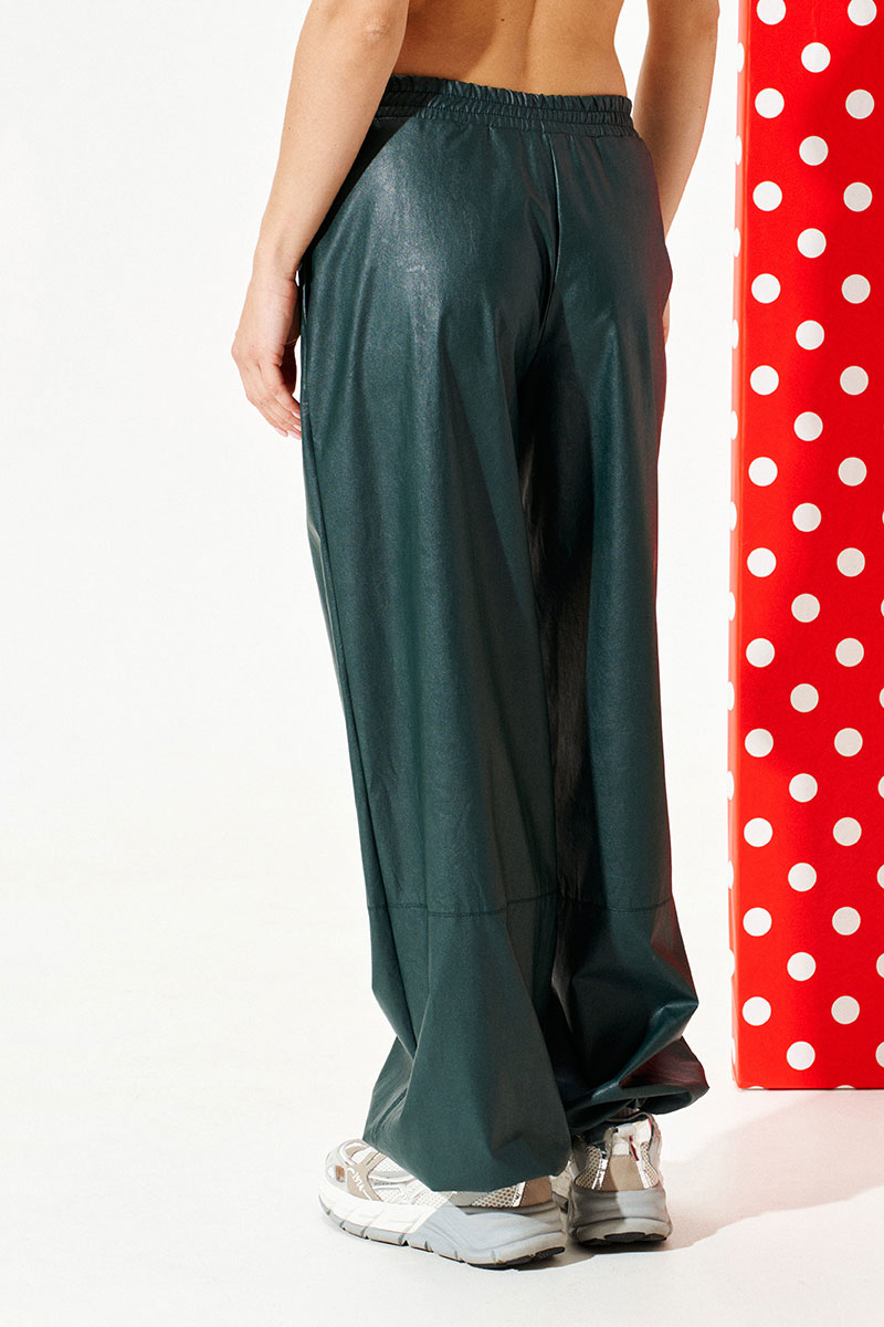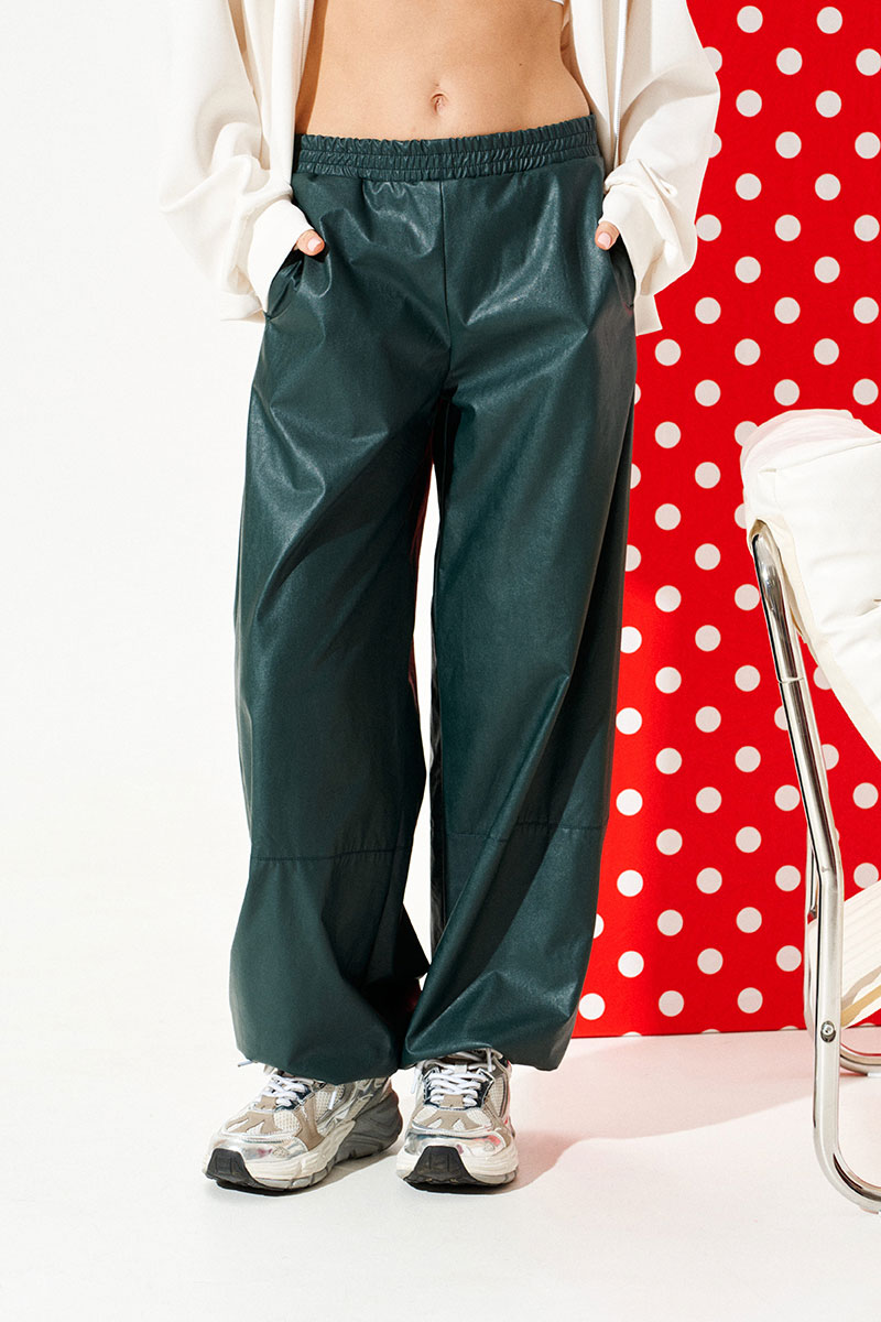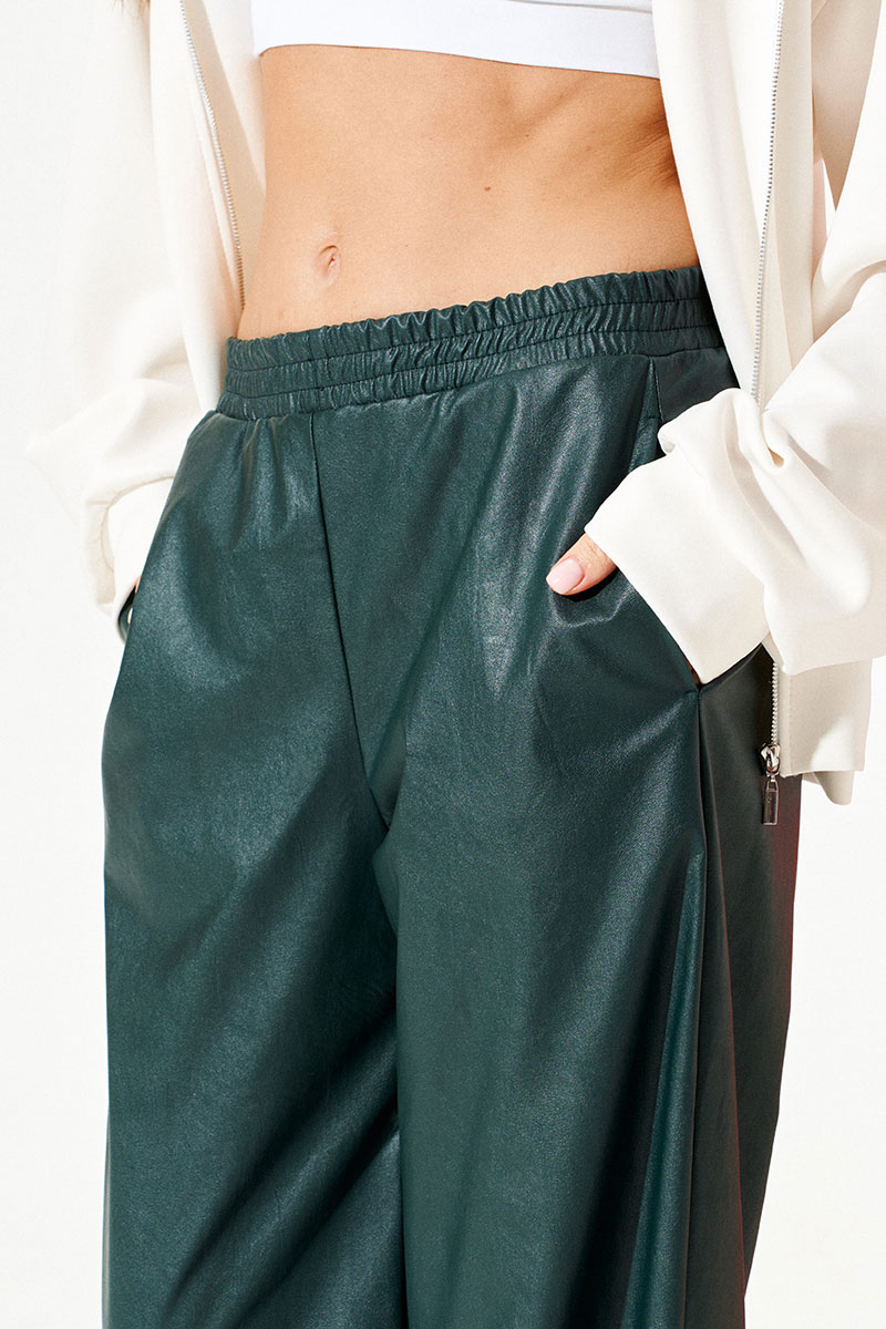 Брюки свободного объема прямого силуэта. В боковых швах расположены карманы. По переду и спинке горизонтальный подрез ниже колена. Пояс притачной на резинке с отделочными строчками. Для регулировки объема нижний срез брюк оформлен кулиской, в которую продет эластичный шнур с фиксатором.