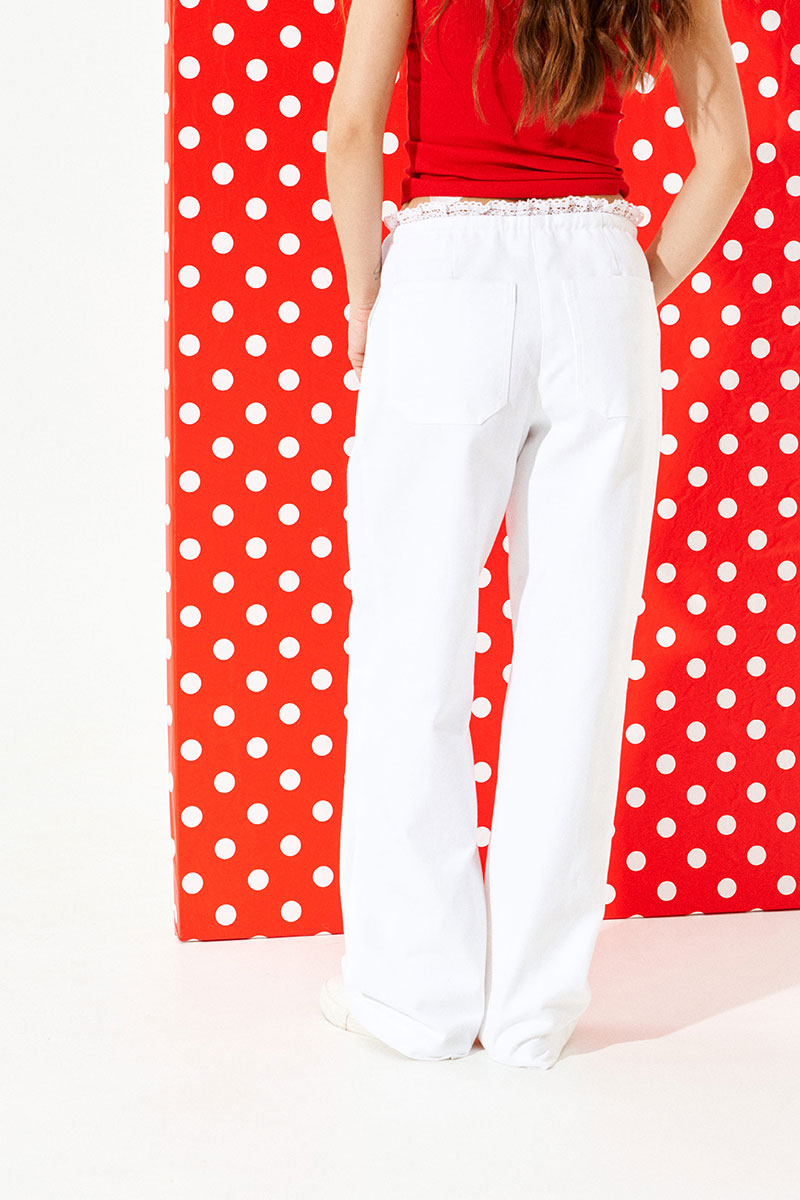 Брюки свободного объема, прямые. Застежка-гульфик на молнии. На передних половинках карманы с отрезным бочком и вытачки на уровне колена. На задних половинках брюк талиевые вытачки и накладные карманы. Пояс обработан обтачкой с отделочной строчкой, образующей кулиску, в которую продет декоративный шнур-завязка с наконечниками. Верхний срез пояса с вставкой из кружева. Пояс с застежкой на 1 петлю и 1 пуговицу.