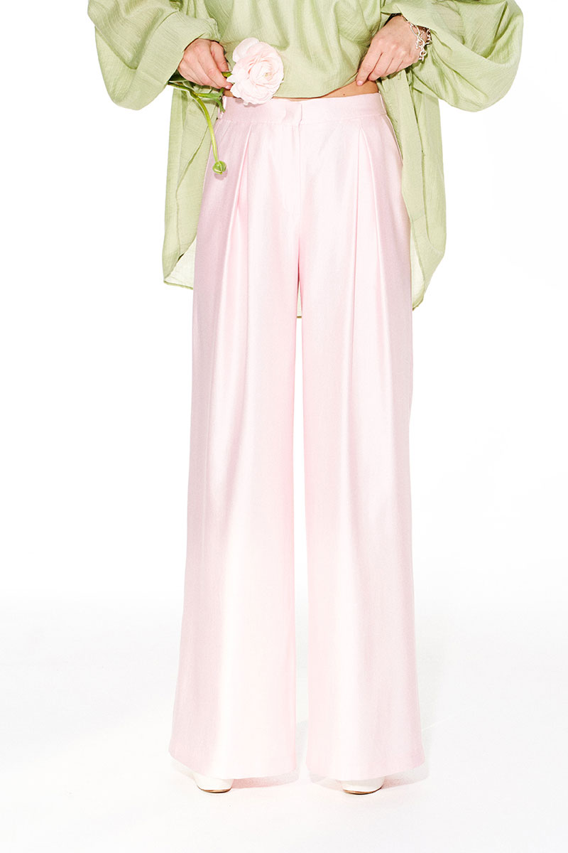 Брюки свободного объема, расширенные книзу. На передних половинках выполнены боковые карманы с отрезным бочком и встречные складки. На задних половинках талиевые вытачки. Застежка – гульфик на молнии. Пояс притачной, с резинкой по спинке, застежкой на крючок и потайную пуговицу.