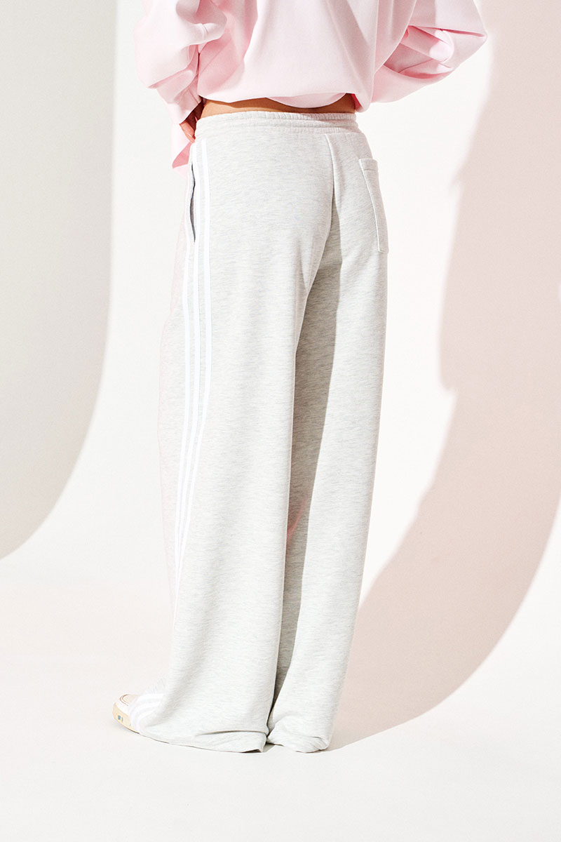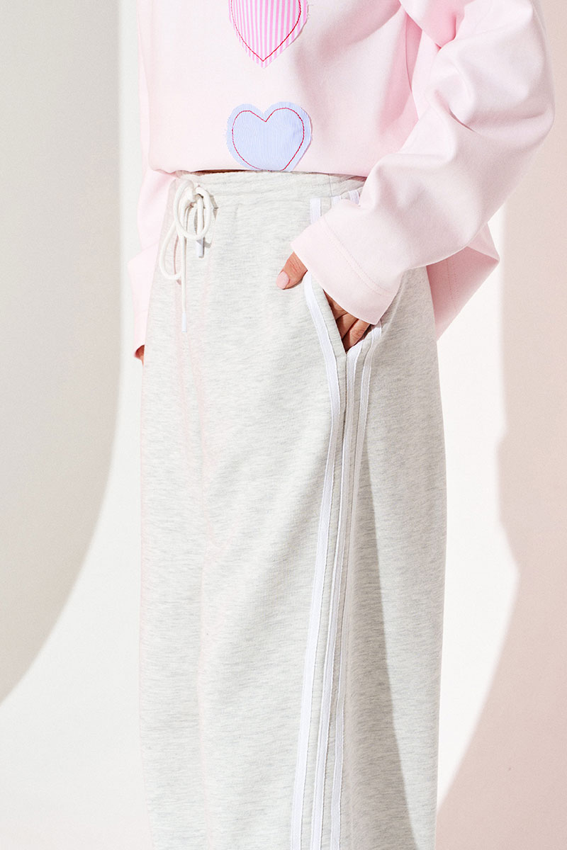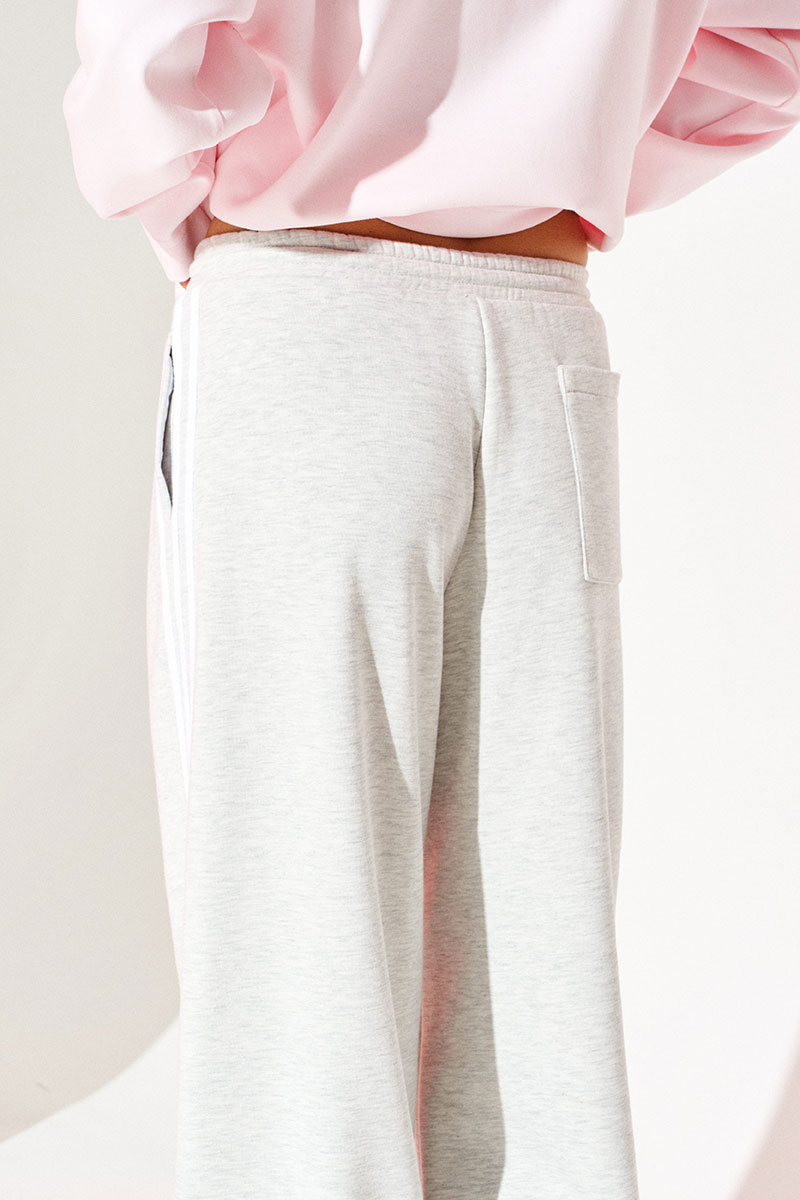 Брюки из трикотажного полотна свободного объема, прямого силуэта. В боковых швах расположены карманы. Пояс притачной на резинке. По поясу проложены отделочные строчки, образующие кулиску, в которую продет шнур-завязка с наконечниками. На правой задней половинке брюк накладной карман. Боковые швы, детали переда и спинки декорированы декоративной тесьмой.